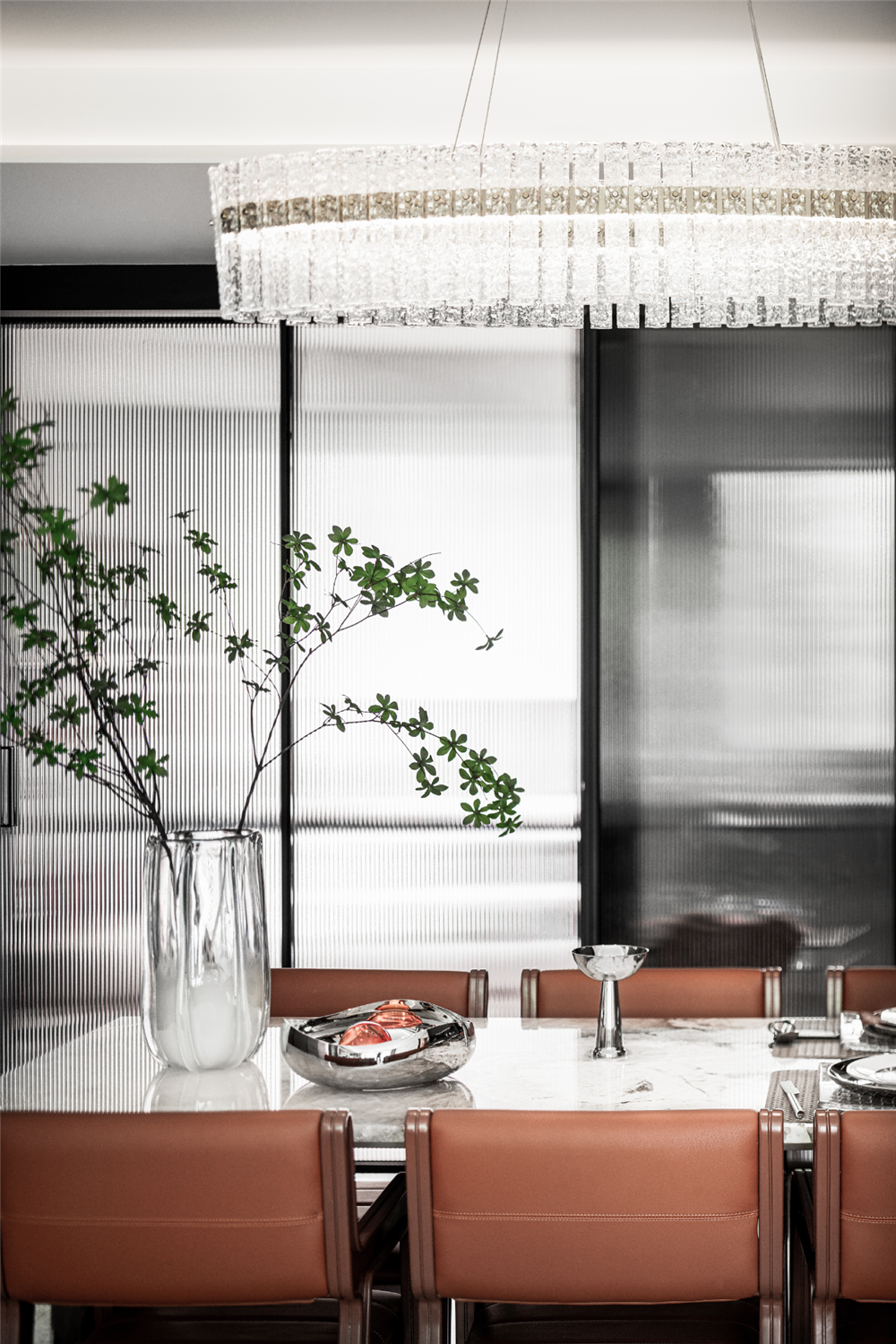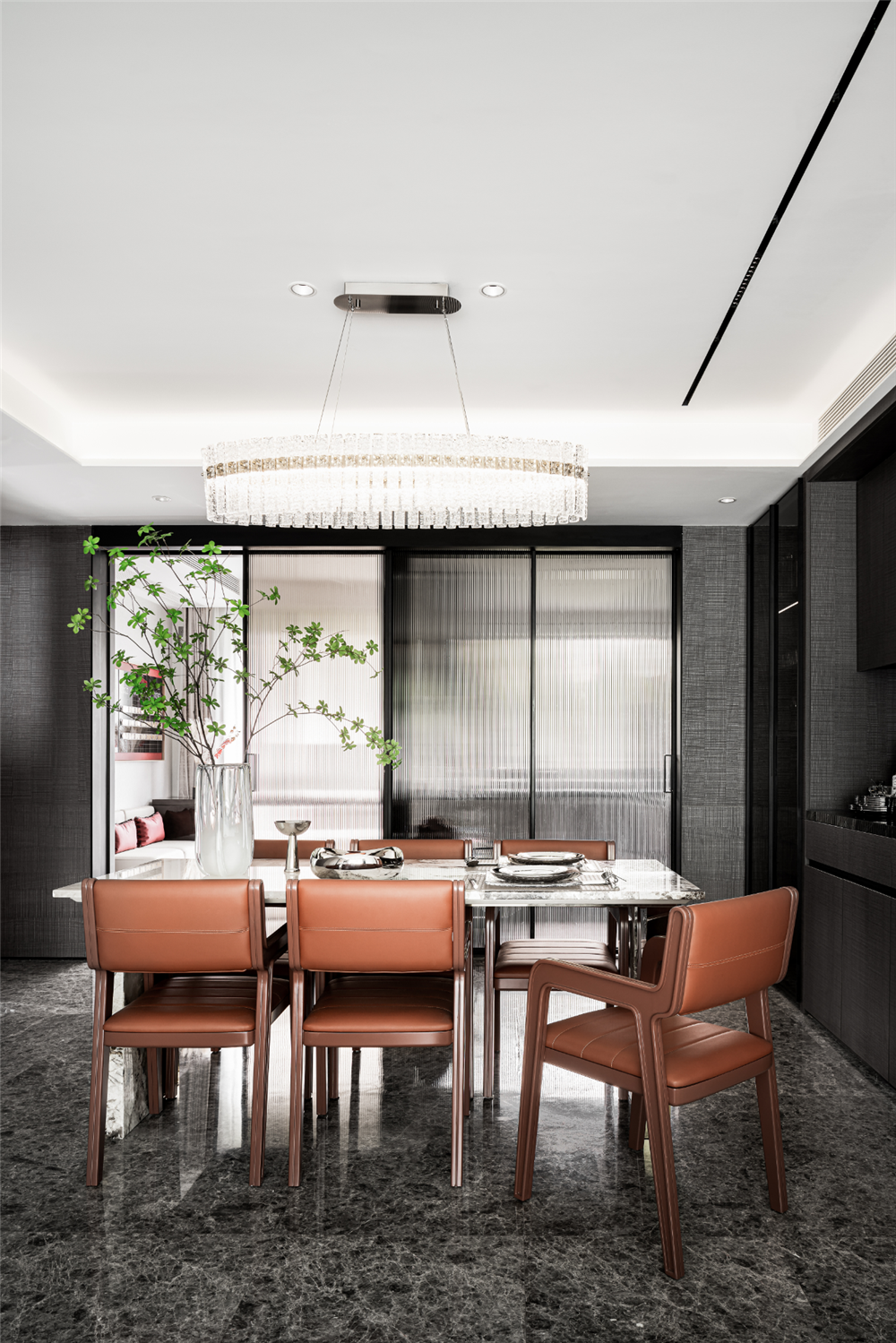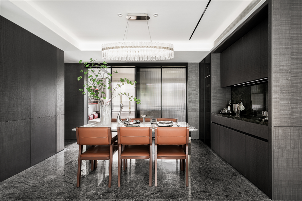 环抱式主灯展开浓烈的问候呈现仪式感,水晶玻璃以重复、组合的逻辑排列成圆,曲折蜿蜒代领人开启寻味之旅,在橙色皮革的渲染下神秘且尊贵。