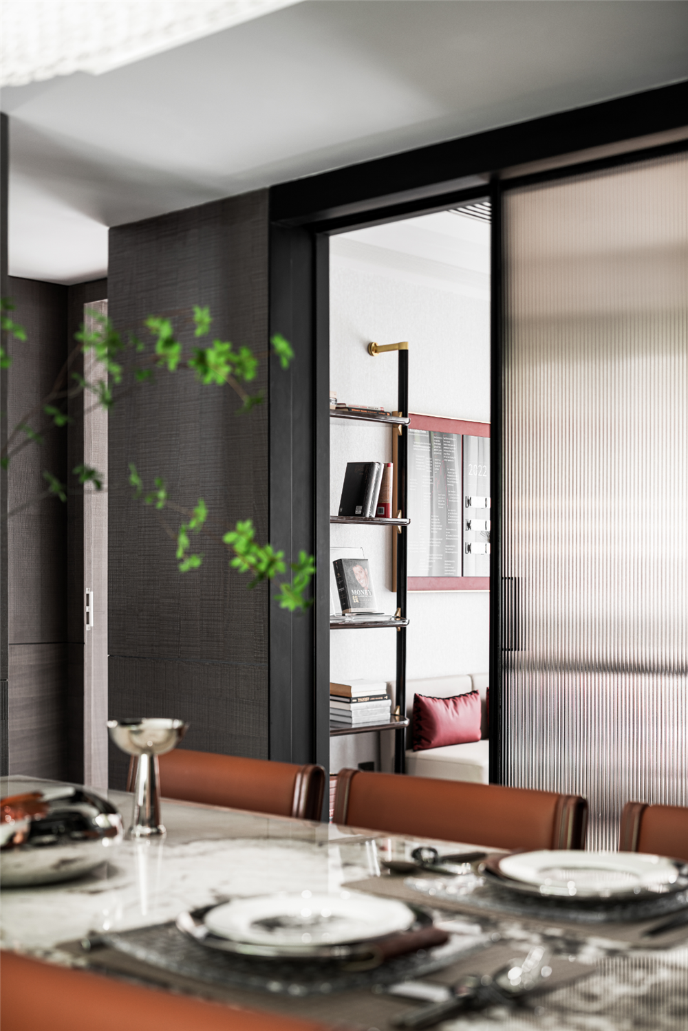 黑色是神秘而深邃,大面积的黑色适配复古橙,沉静稳重又矜贵热情,皮革的浓烈气味被地毯温柔包裹,个性而舒适。而玻璃酒杯、画册、装置艺术、雕塑摆件等陈设井然有序,共同成就空间独特的魅力。