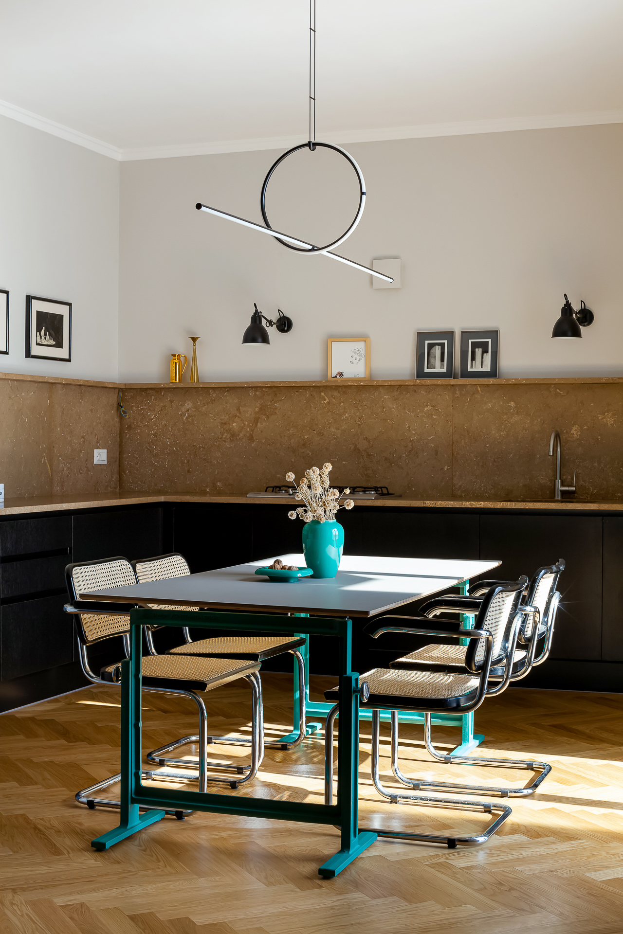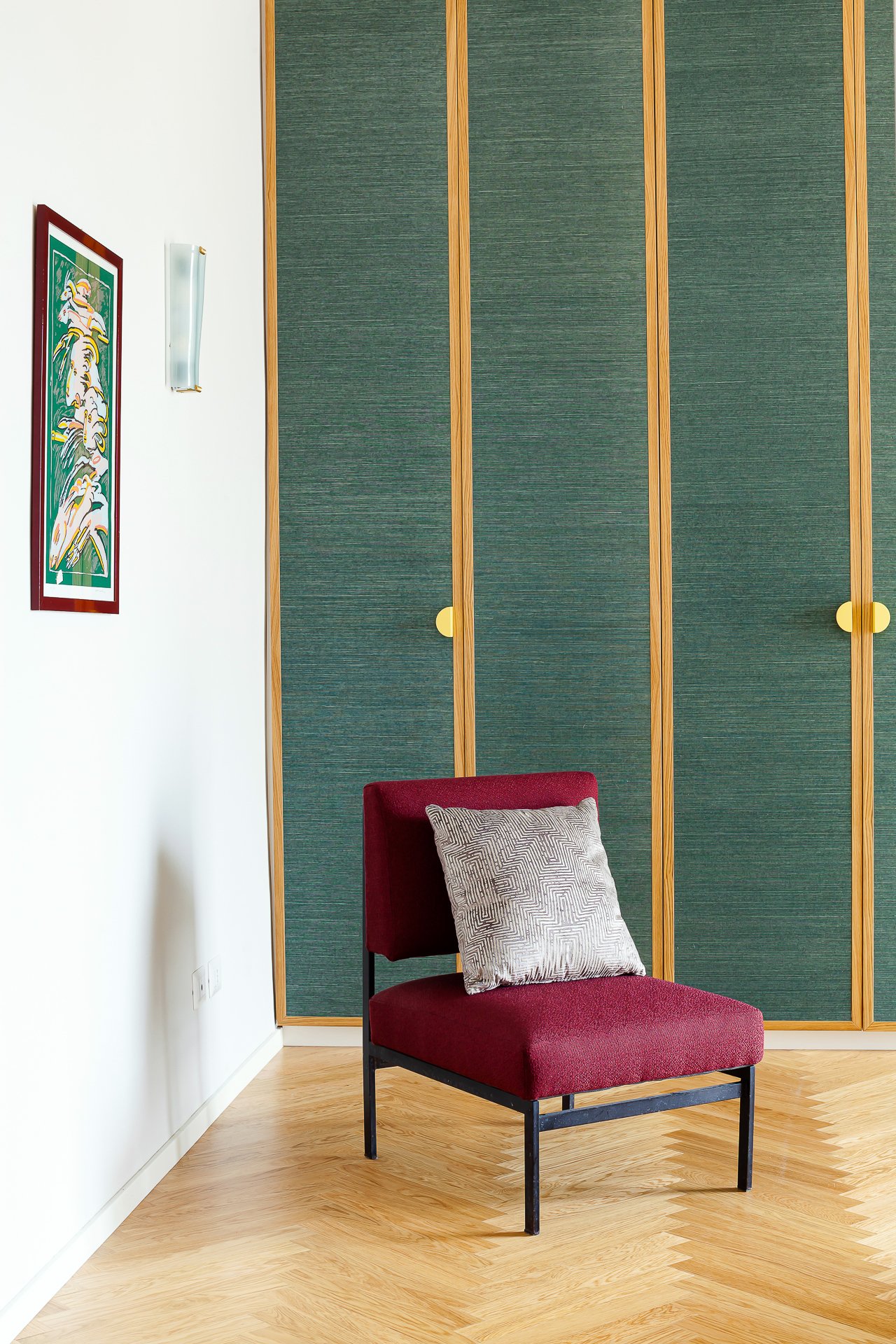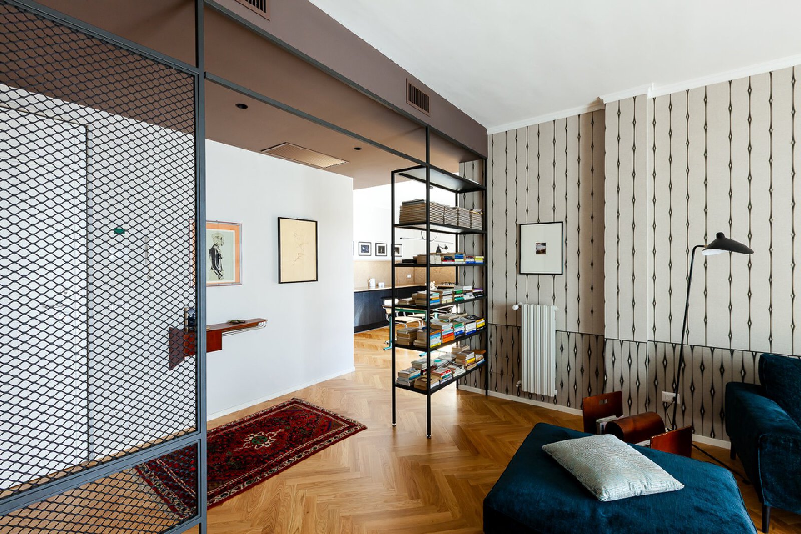 Il tema principale alla base del progetto d’interni è l’uso dei materiali. Il rovere del parquet, la paglia di Vienna delle Cesca chair, il travertino Navona della cucina, così come i divisori in scatolato e rete metallica e le carte da parati in rafia giapponese, tutti insieme, evocano ricordi di ambienti del passato, qui reinterpretati e resi funzionali ad esigenze più attuali.
