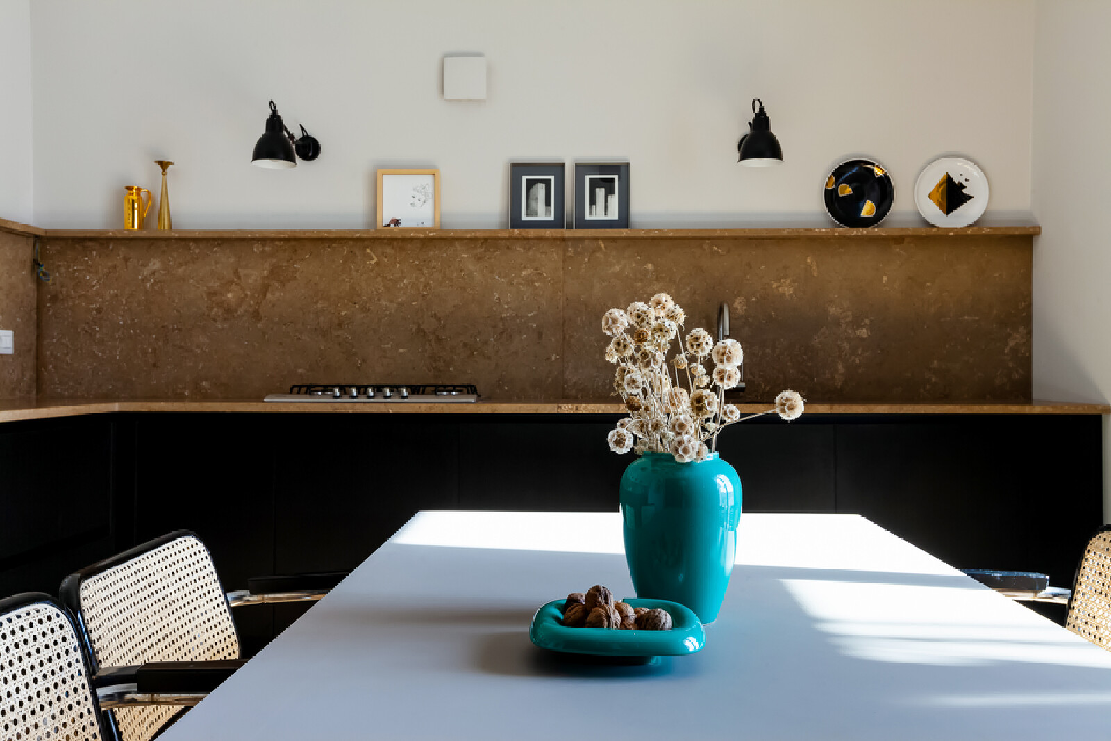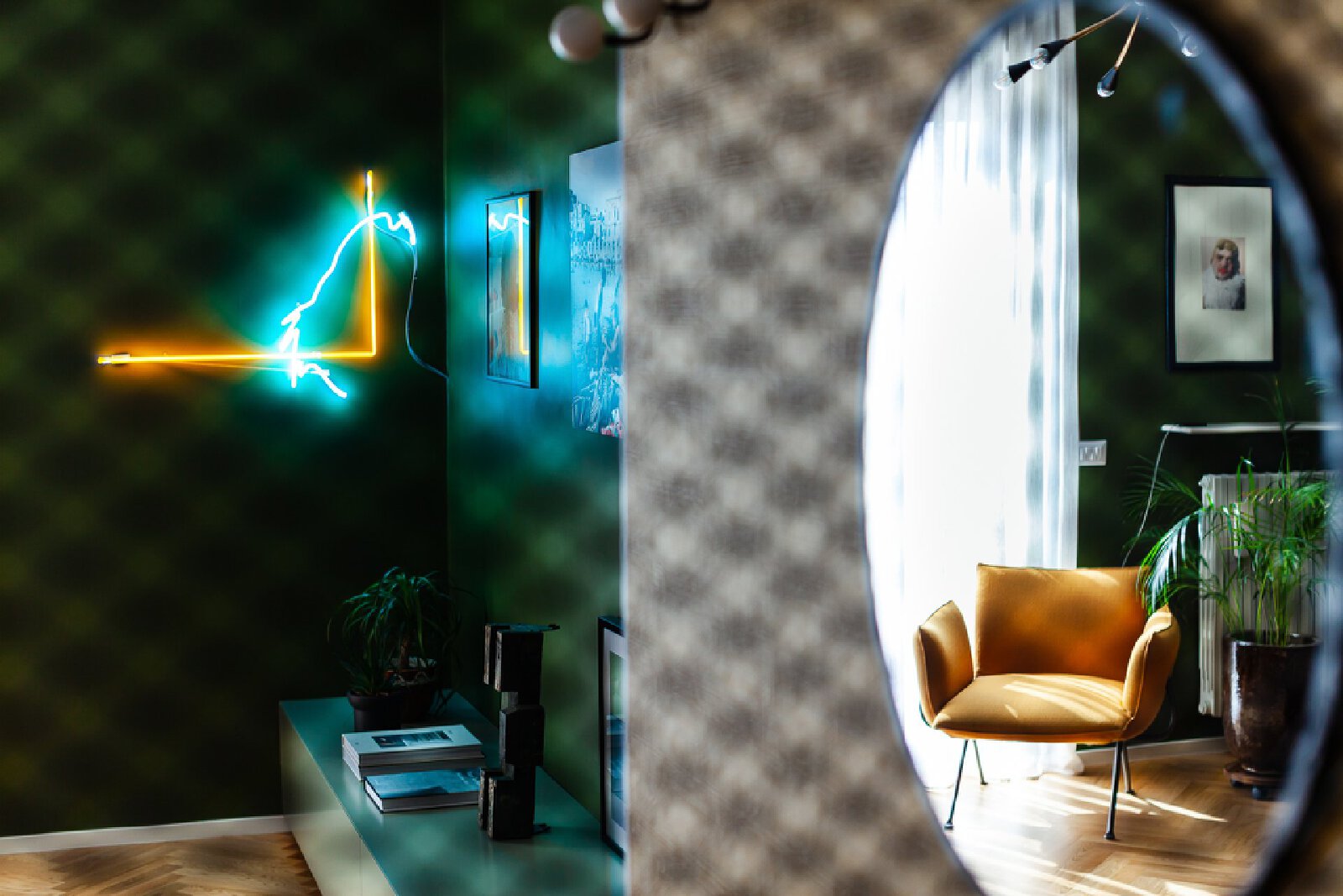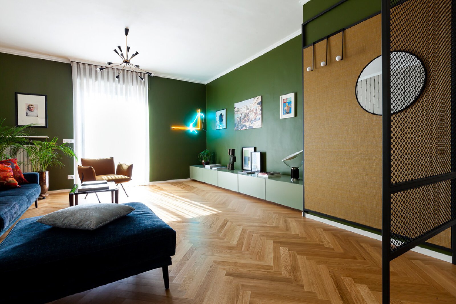 Gli elementi decorativi e gli arredi (sia vintage che disegnati da Claudio) creano un sinergico scambio di suggestioni e donano agli ambienti un linguaggio contemporaneo che non nasconde il carattere originario dell’immobile.