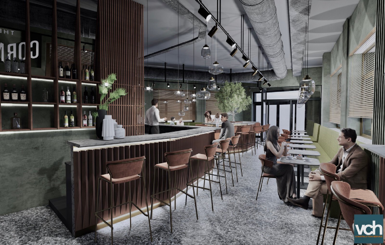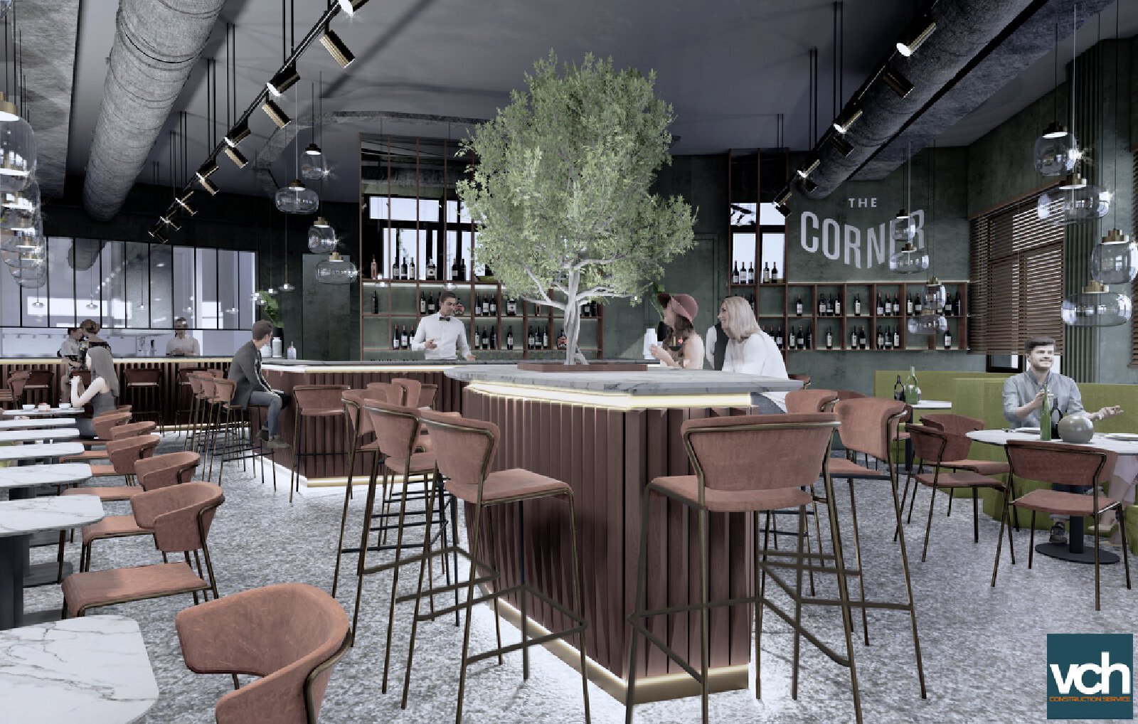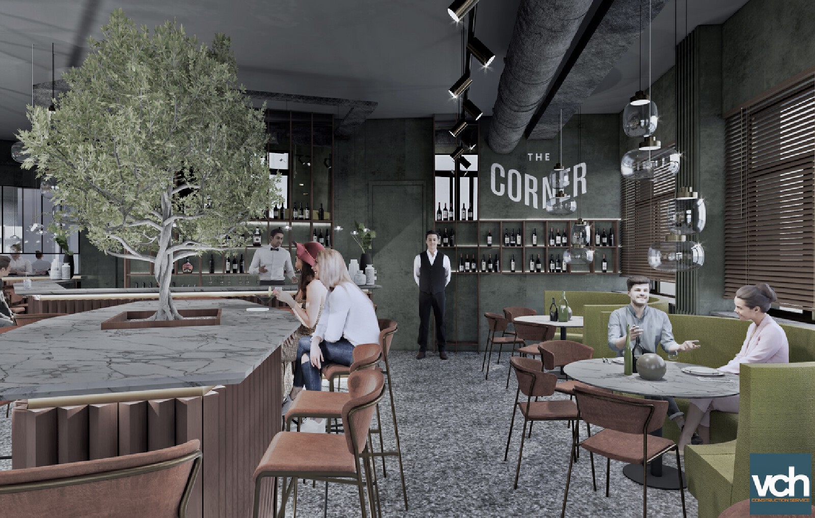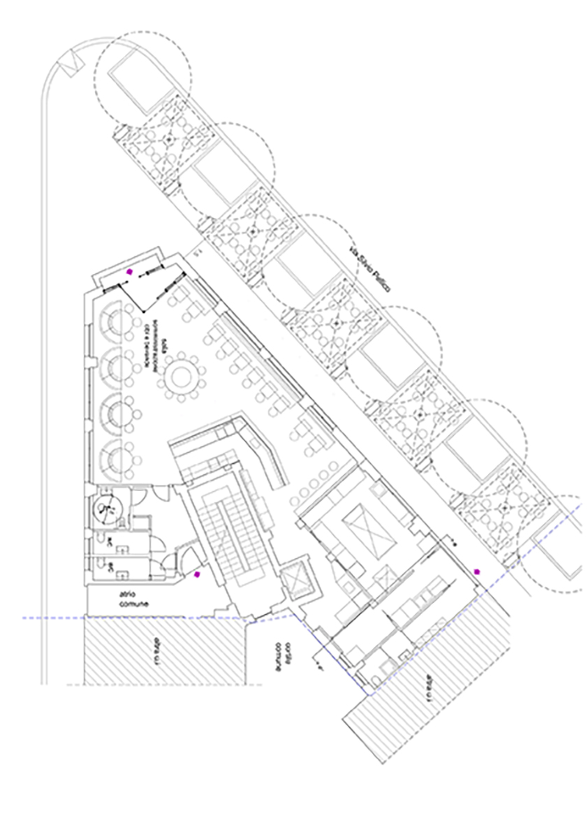 Il progetto propone immagini di altri luoghi visti e vissuti, ispirate a colori nordici e all’oltreoceano. Il verde, colore dell’infanzia, della primavera e della fortuna, come liason in un interno confortevole ed avvolgente. l’accogliente bar dell’angolo che in ogni città ammicca ed invita alla sosta. che dialoga volutamente con l’esterno urbano alberato e spesso affollato attraverso le grandi vetrate. La magia del grande ulivo che protende i rami verso gli alberi dei viali quasi a voler cancellare il confine tra l’interno e l’esterno. L’intervento scommette sul rilancio di un luogo bellissimo della città, troppo spesso dimenticato.