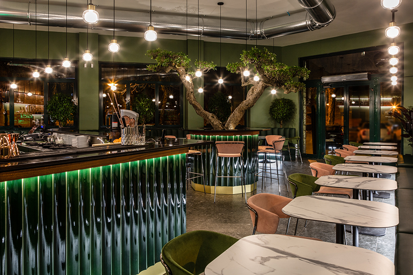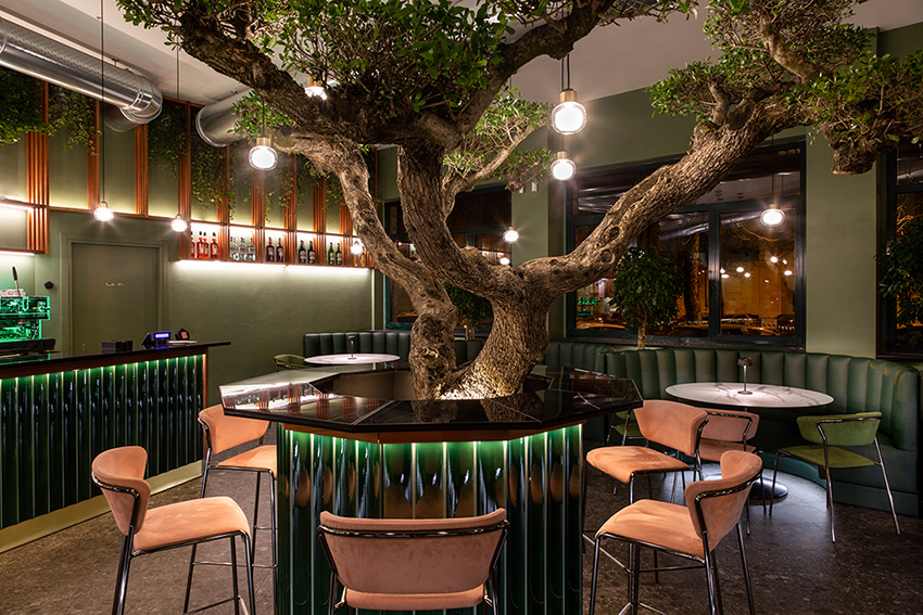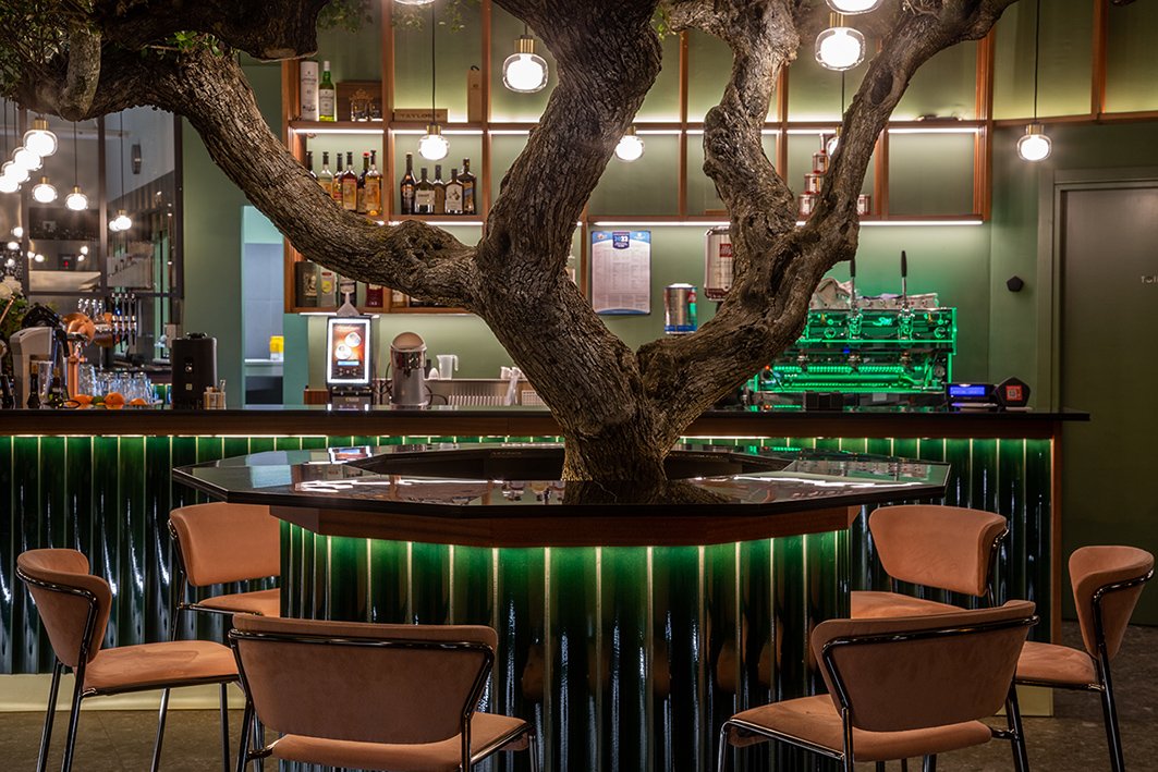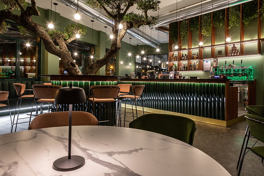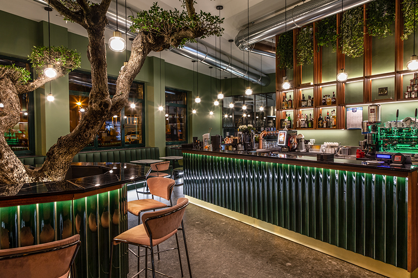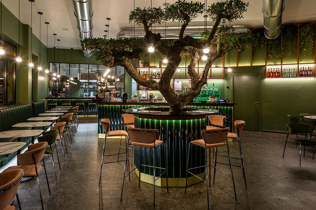 项目提出了受北欧和海外色彩启发的其他地方看到和体验过的图像。绿色,童年、春天和好运的颜色,是舒适和包围室内的联络人。舒适的角落酒吧,在每个城市都会眨眼,邀请您停下来。它通过大窗户故意与绿树成荫且经常拥挤的城市外部对话。大橄榄树的魔力向林荫大道延伸,仿佛要抹去内外的界线。干预押注于振兴城市中一个经常被遗忘的美丽地方。