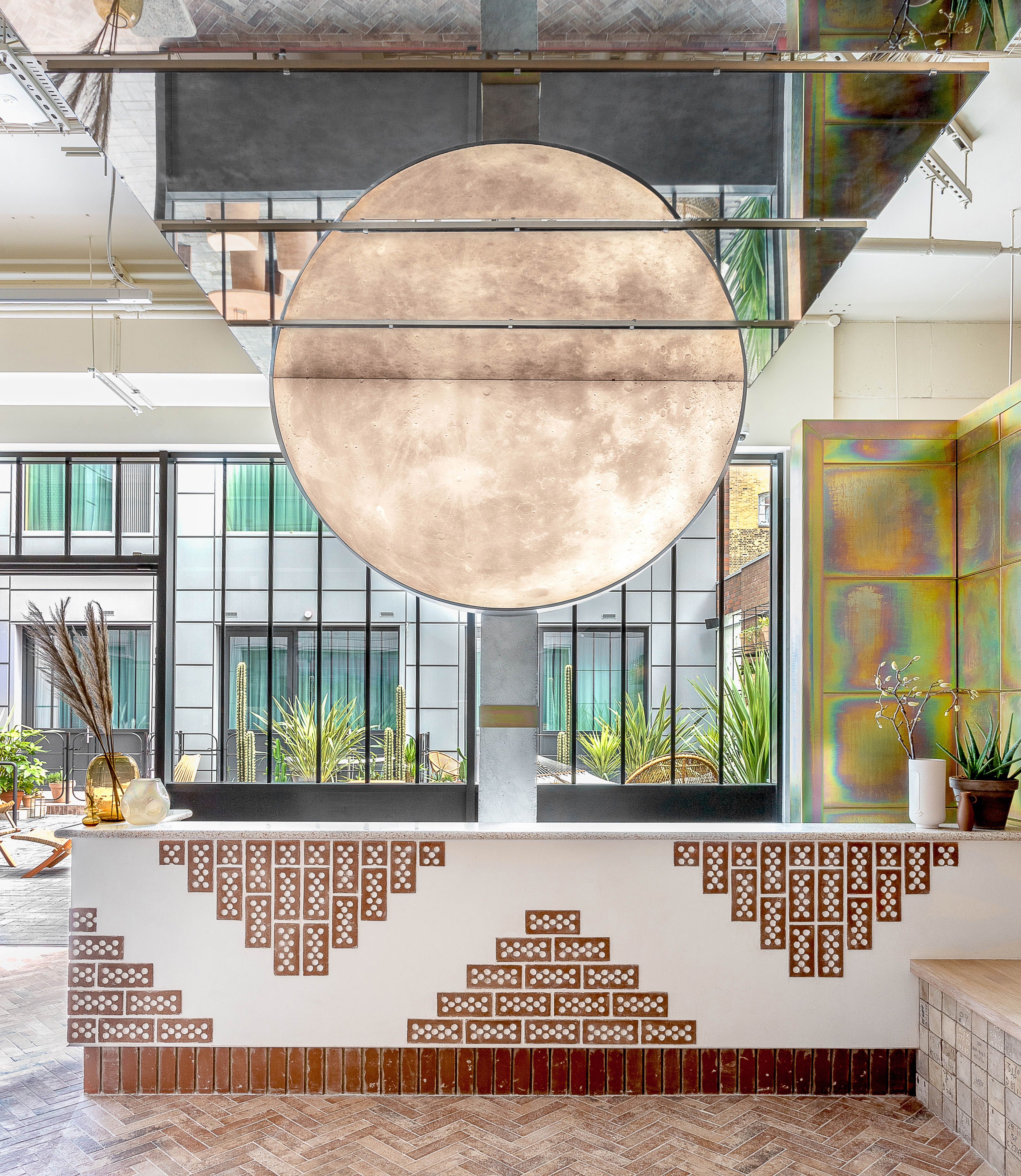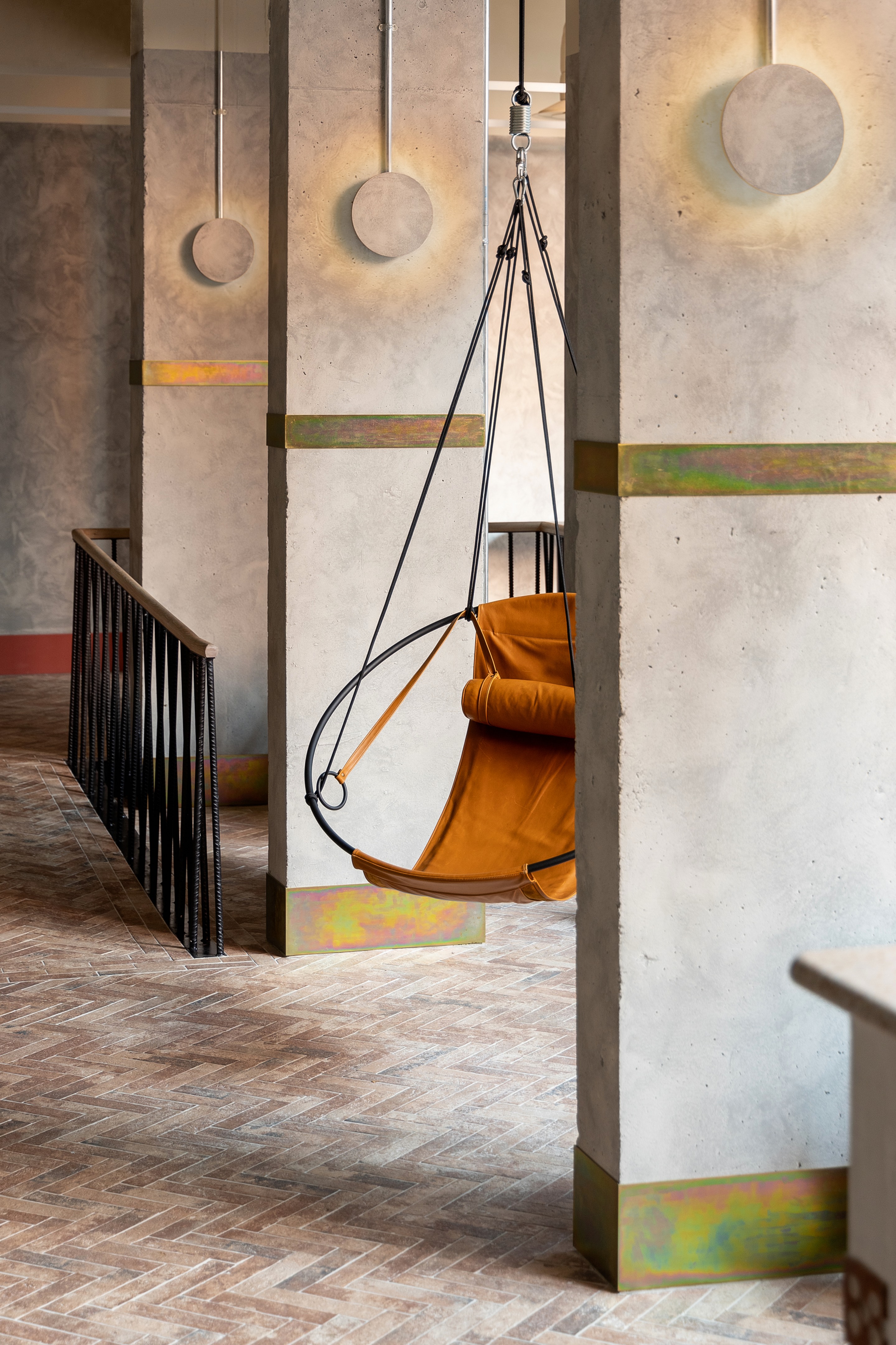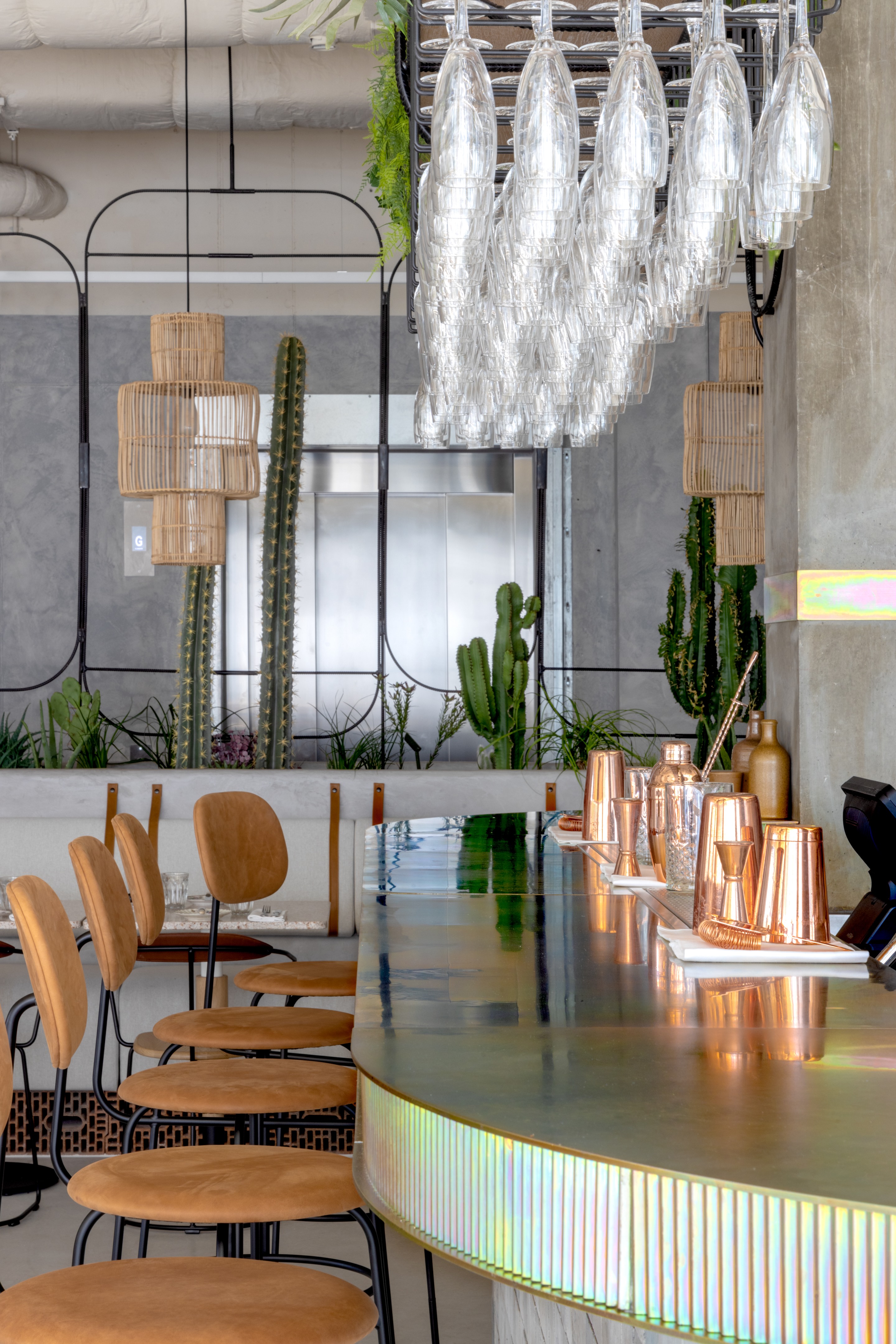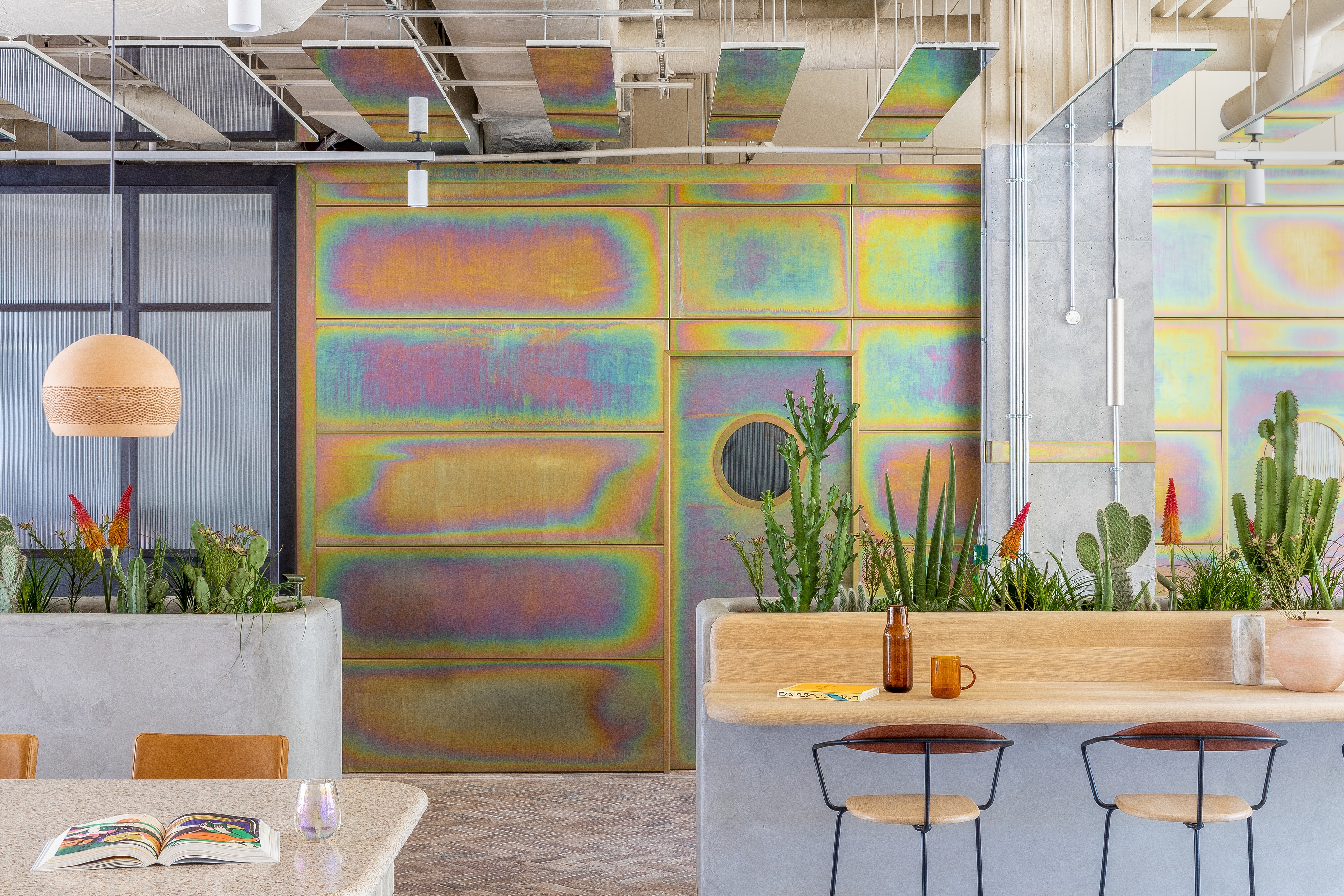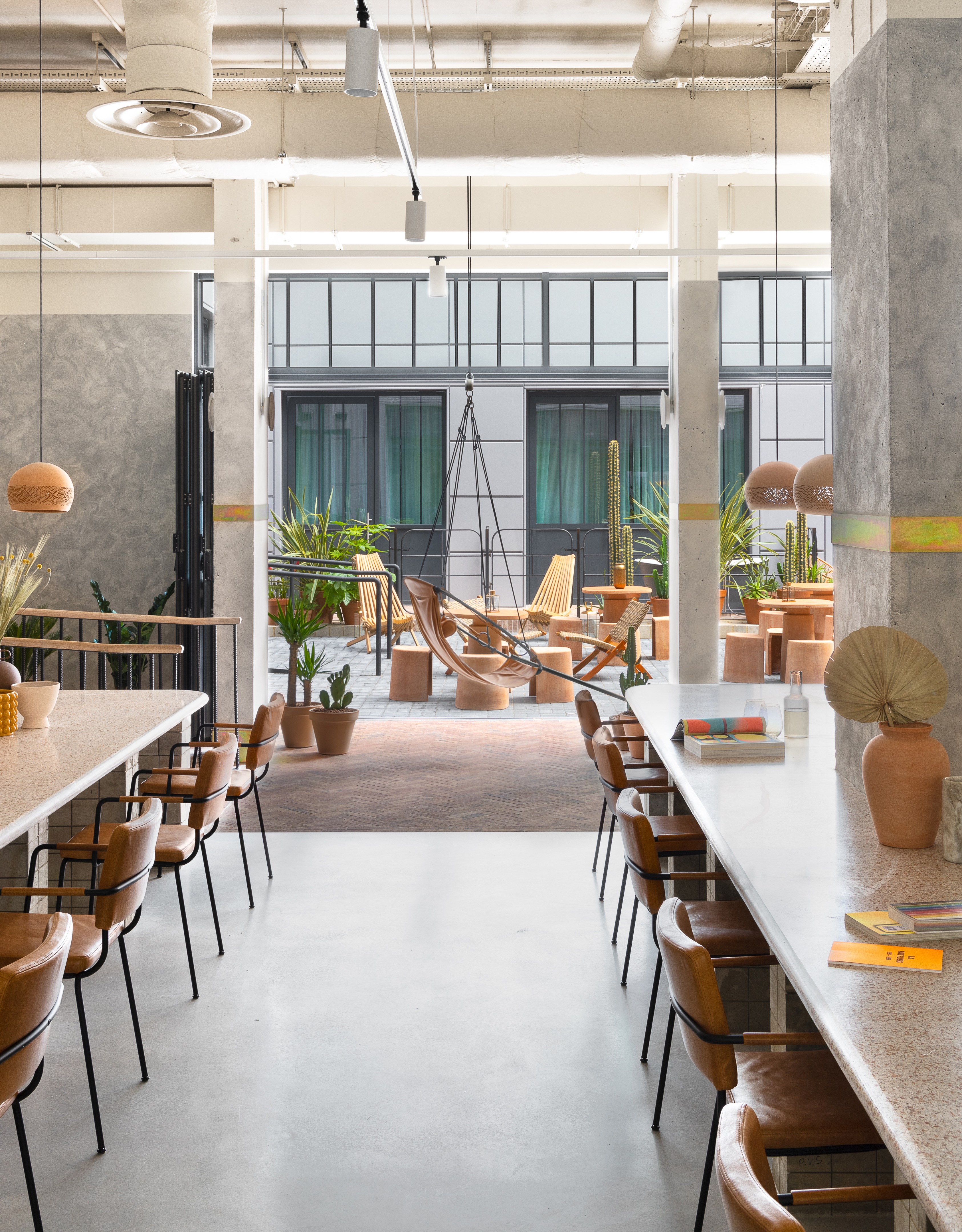 以沙漠为灵感的美学始于沐浴在由头顶镜子创造的闪闪发光的海市蜃楼中的月光招待会,其灵感来自 Olafur Eliasson 的 The Weather Project。在追求商务和娱乐的宁静中,游客可以在柔和的光线下漫步在开放的共同工作空间中——秋千椅、固定的混凝土长椅座位和悬挂的花盆点缀着酒吧和餐厅之间的空间。
