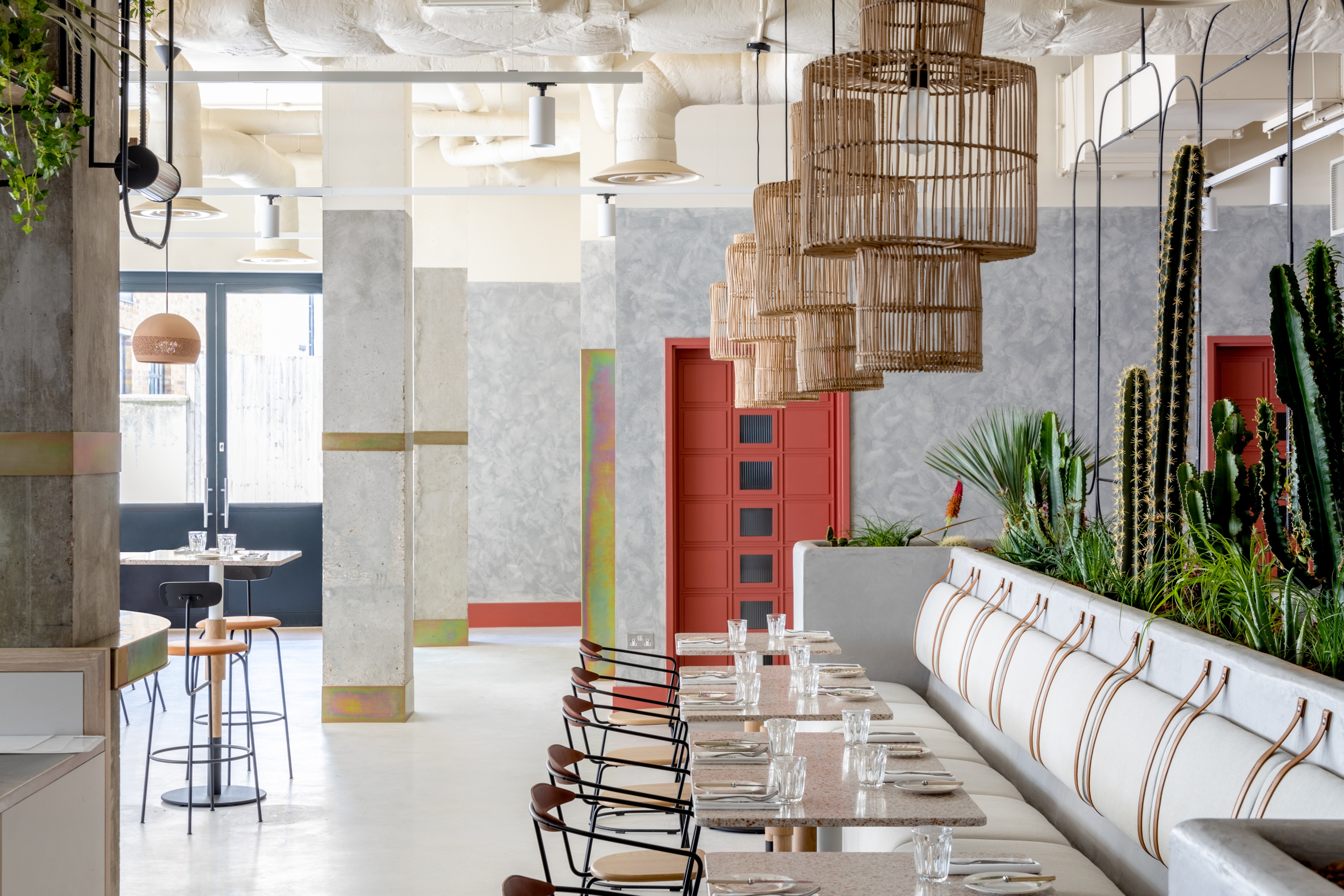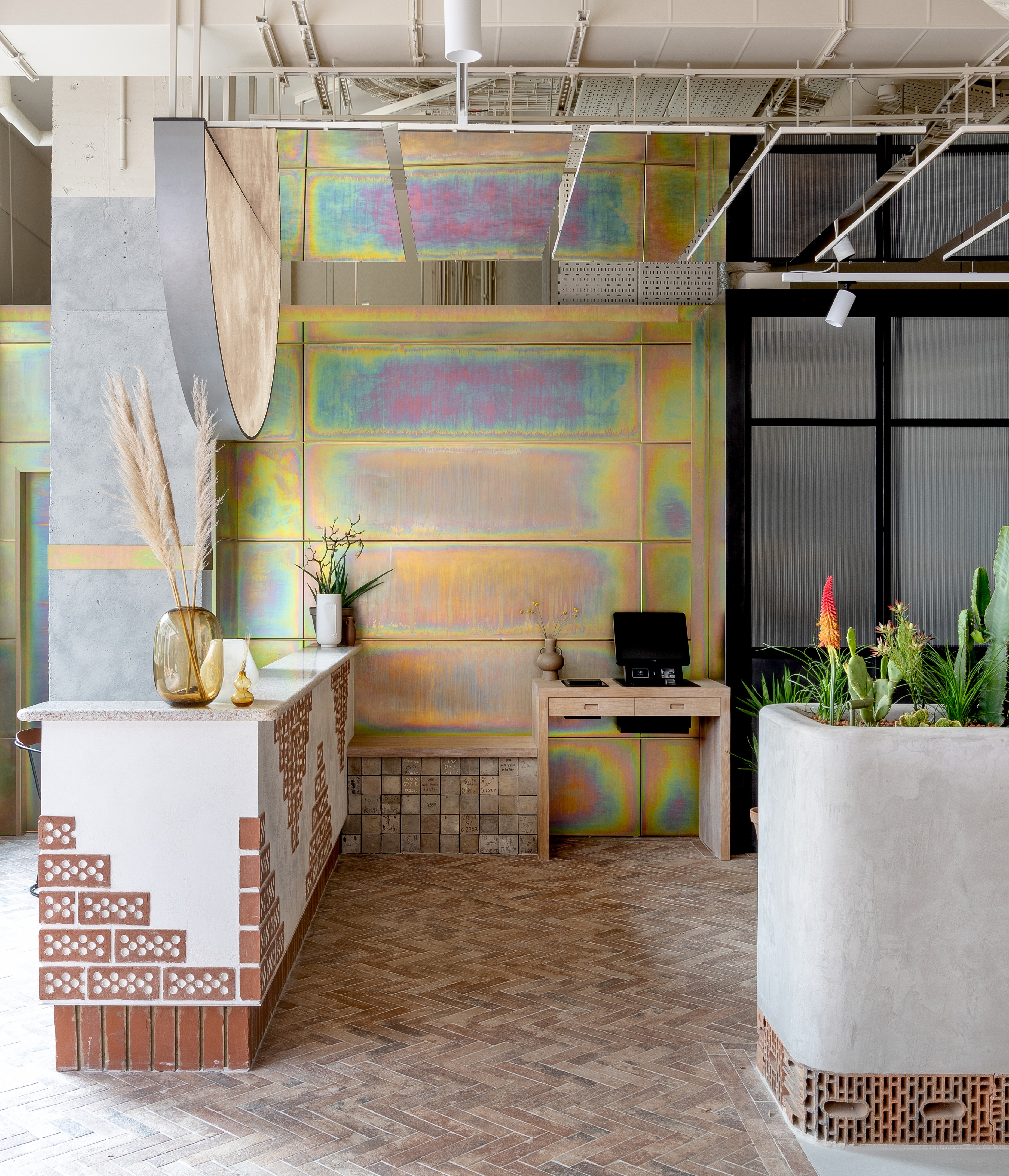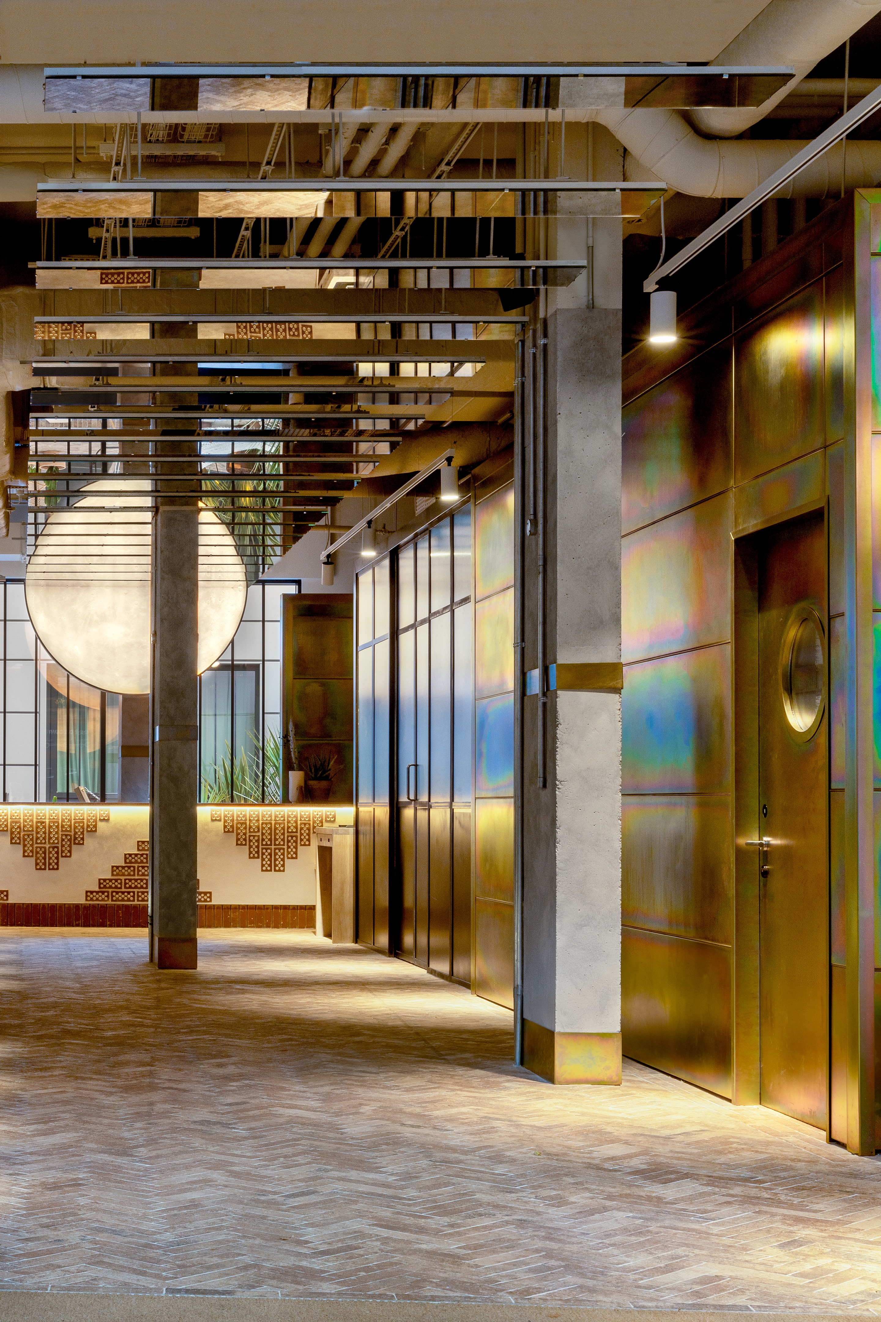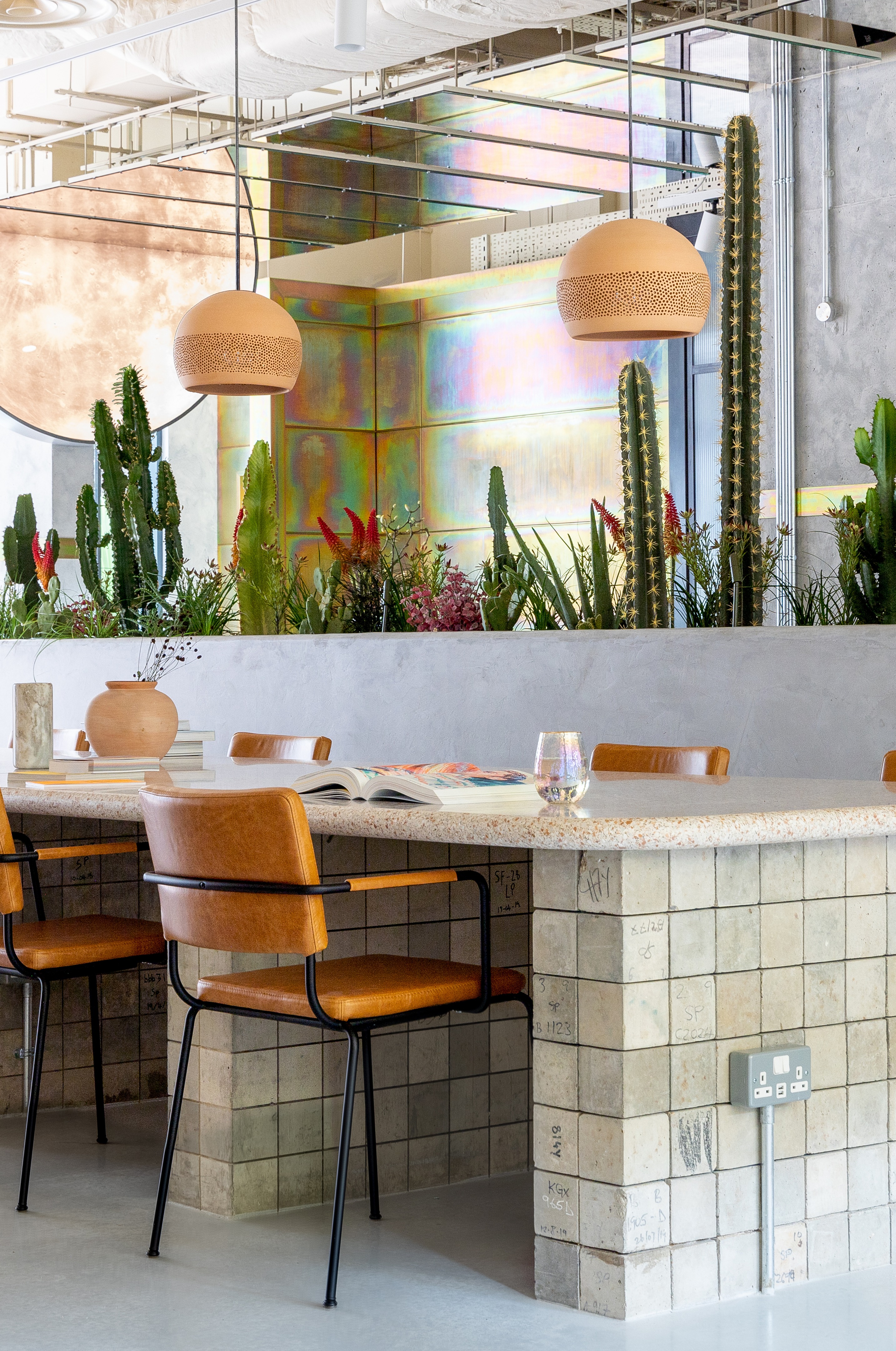 以沙漠为灵感的美学始于沐浴在由头顶镜子创造的闪闪发光的海市蜃楼中的月光招待会,其灵感来自 Olafur Eliasson 的 The Weather Project。在追求商务和娱乐的宁静中,游客可以在柔和的光线下漫步在开放的共同工作空间中——秋千椅、固定的混凝土长椅座位和悬挂的花盆点缀着酒吧和餐厅之间的空间。