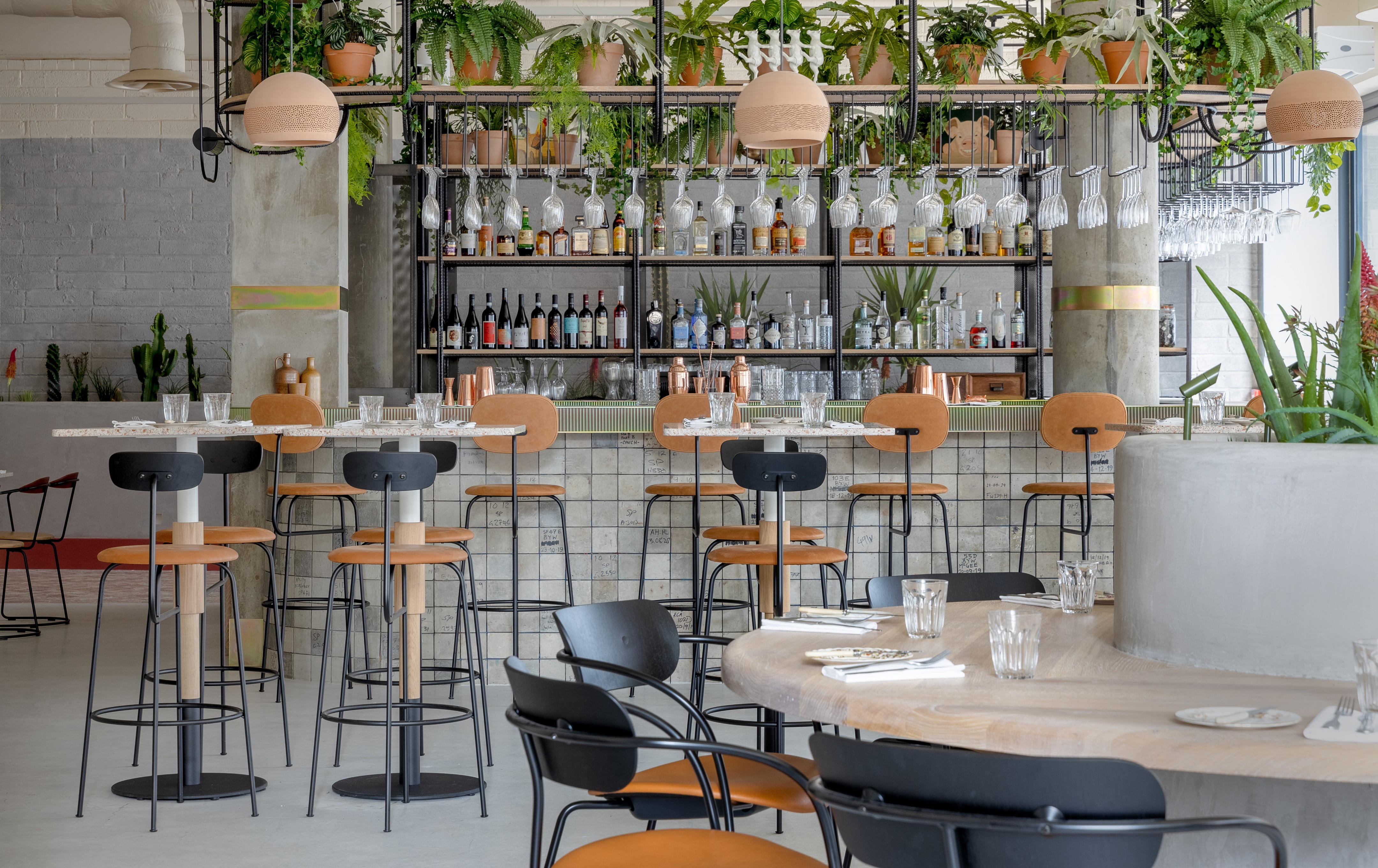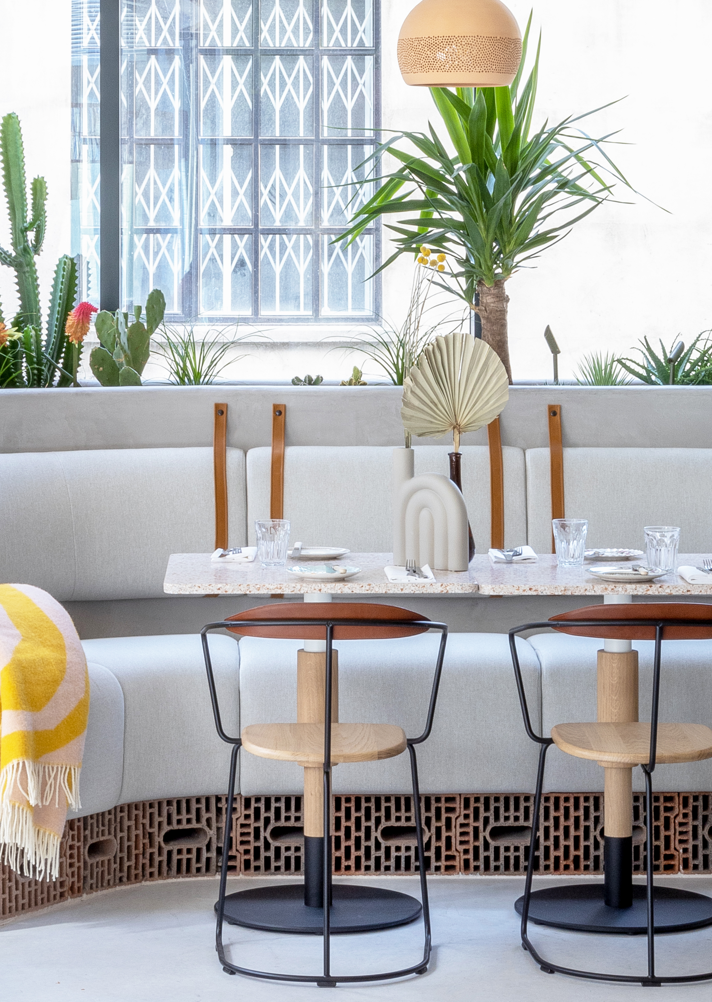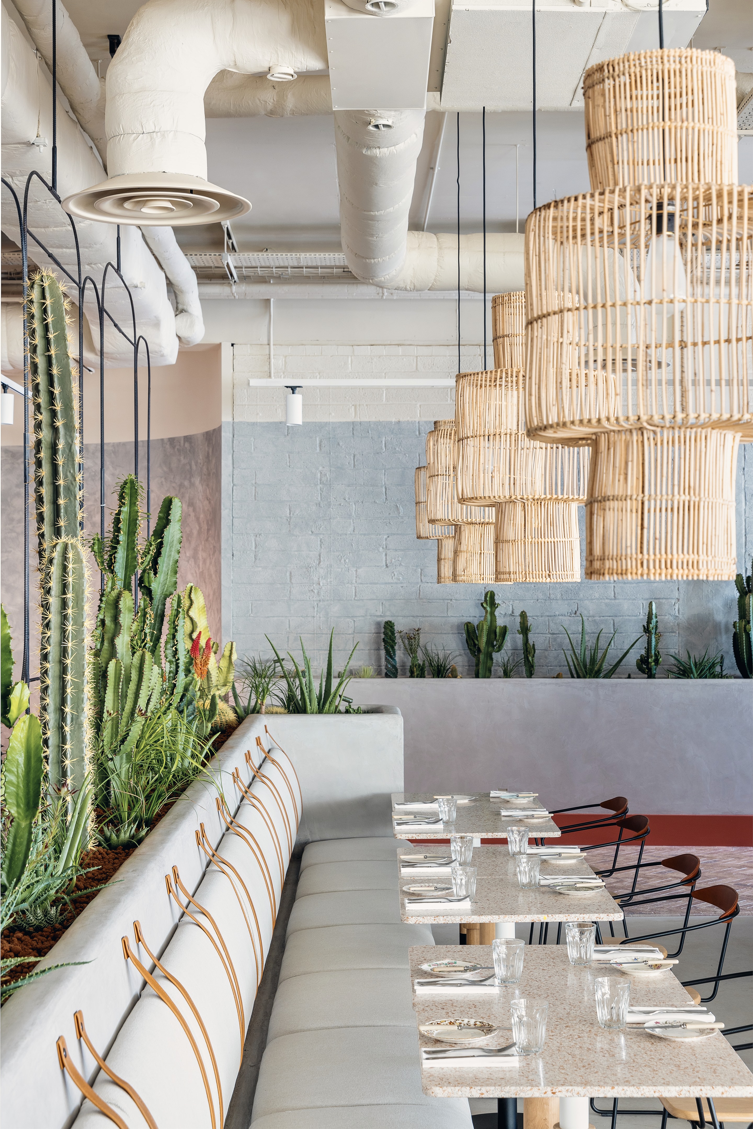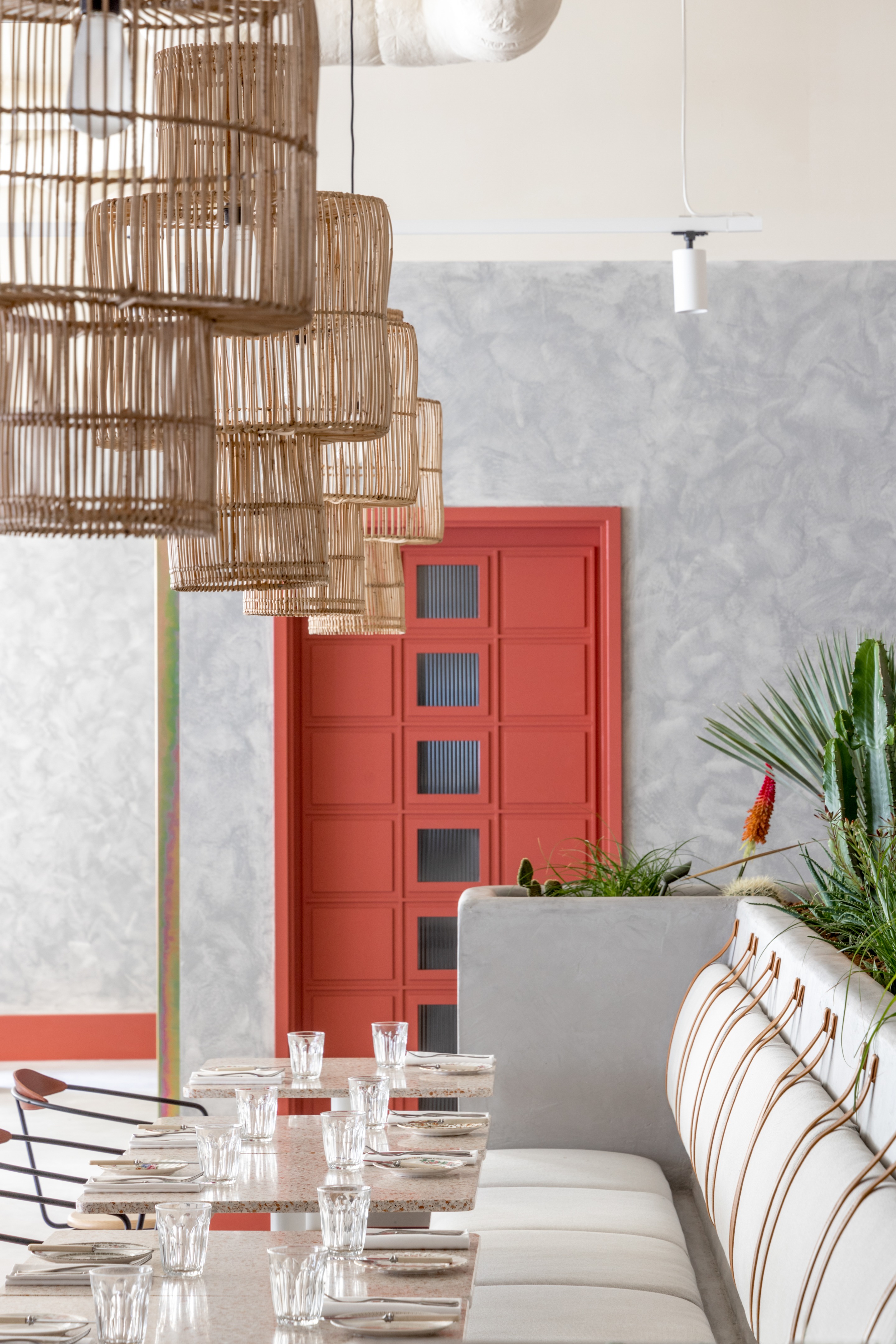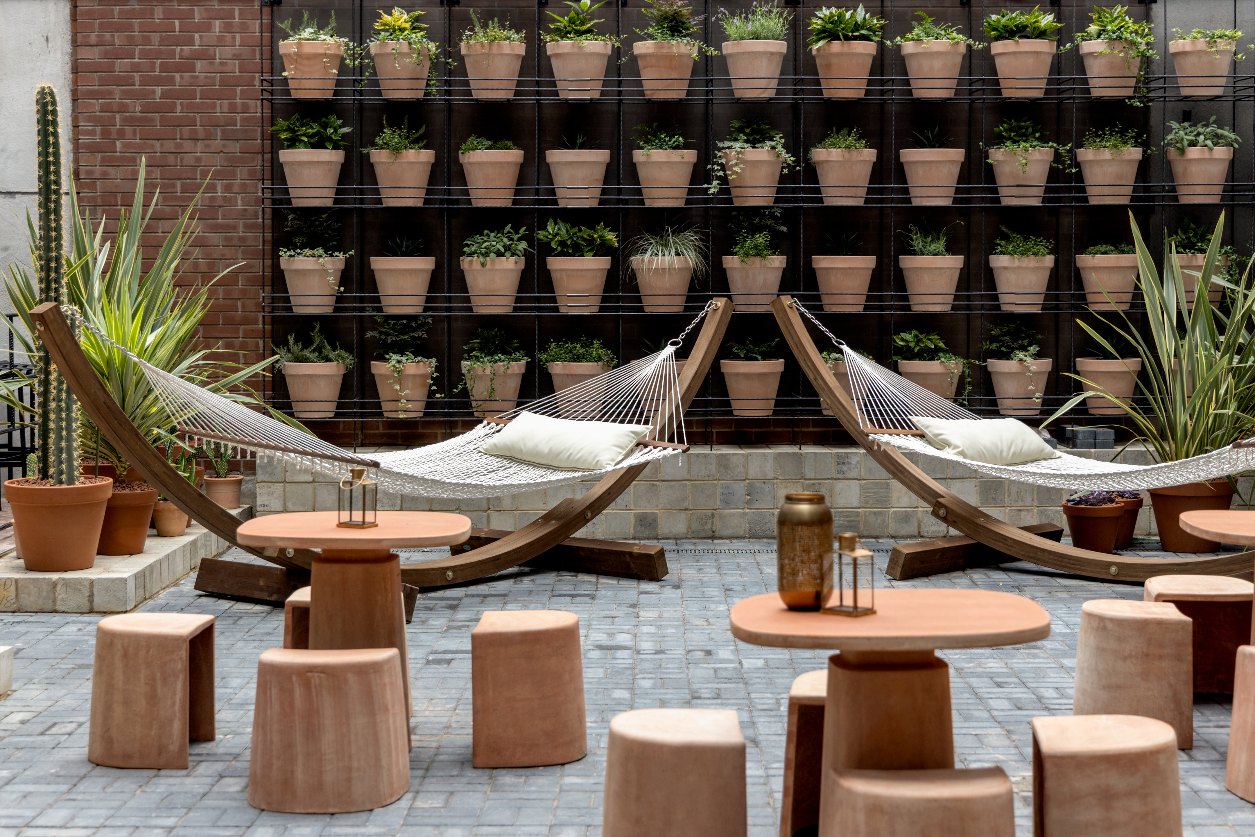 以沙漠为灵感的美学始于沐浴在由头顶镜子创造的闪闪发光的海市蜃楼中的月光招待会,其灵感来自 Olafur Eliasson 的 The Weather Project。在追求商务和娱乐的宁静中,游客可以在柔和的光线下漫步在开放的共同工作空间中——秋千椅、固定的混凝土长椅座位和悬挂的花盆点缀着酒吧和餐厅之间的空间。
