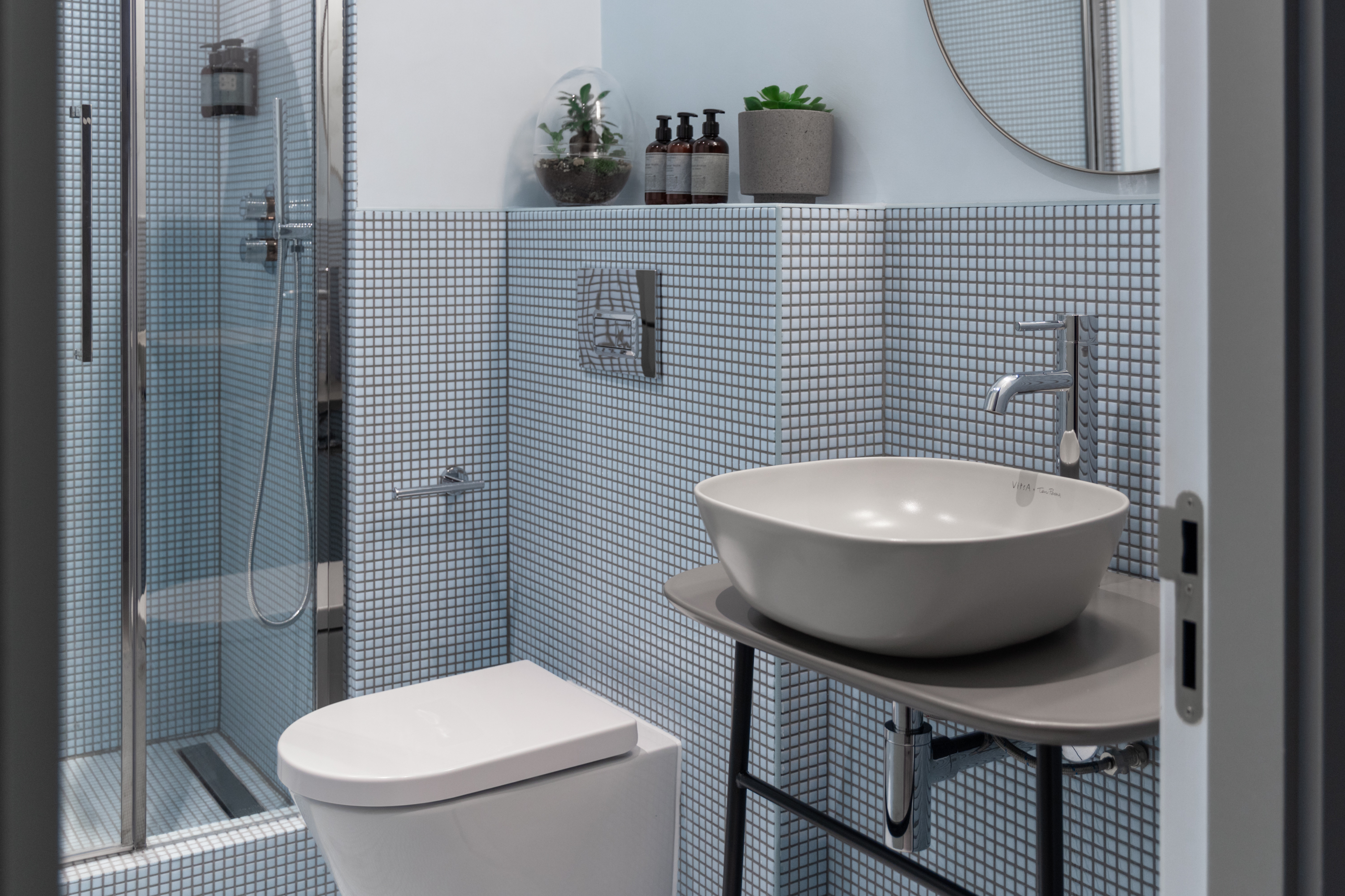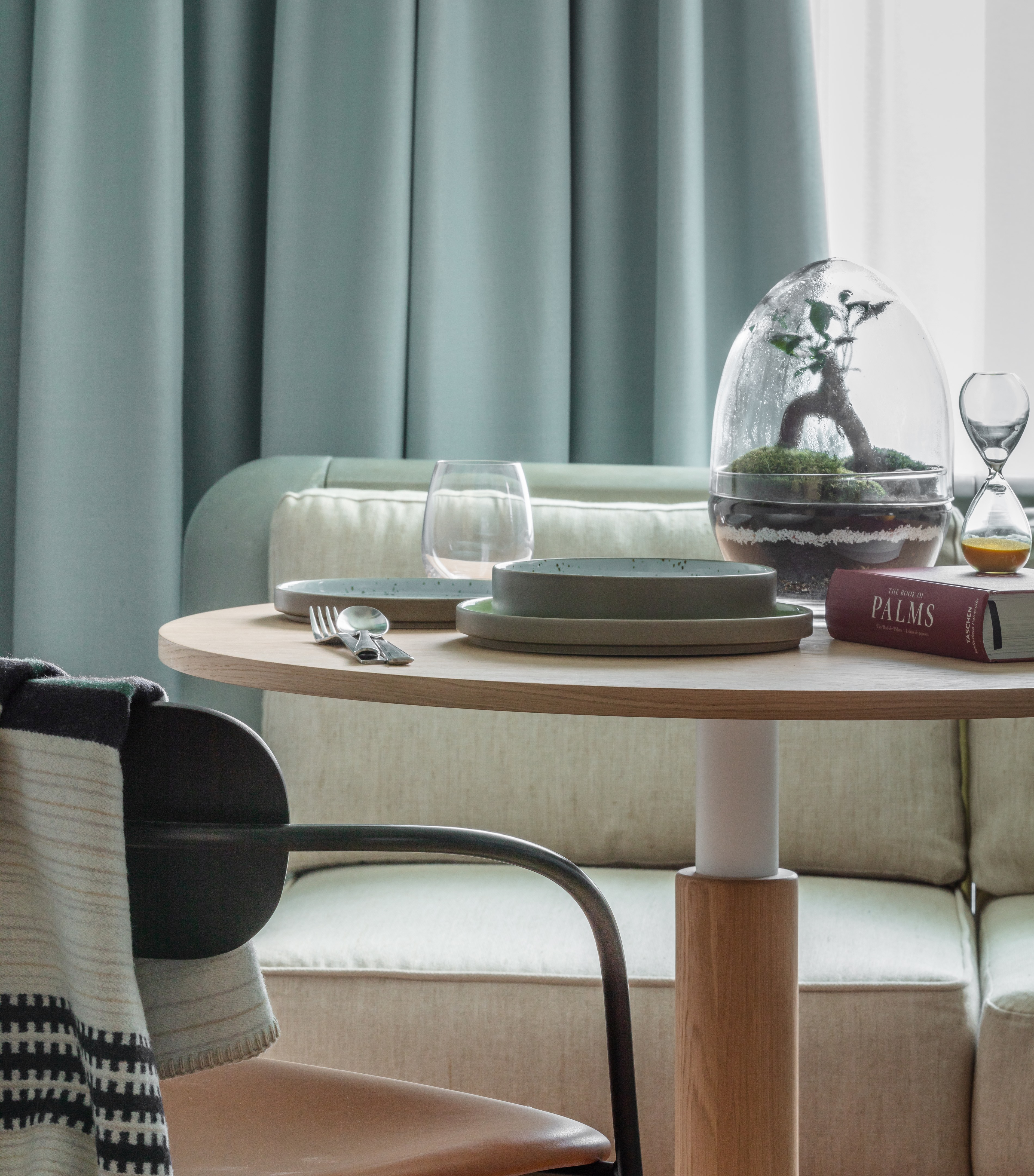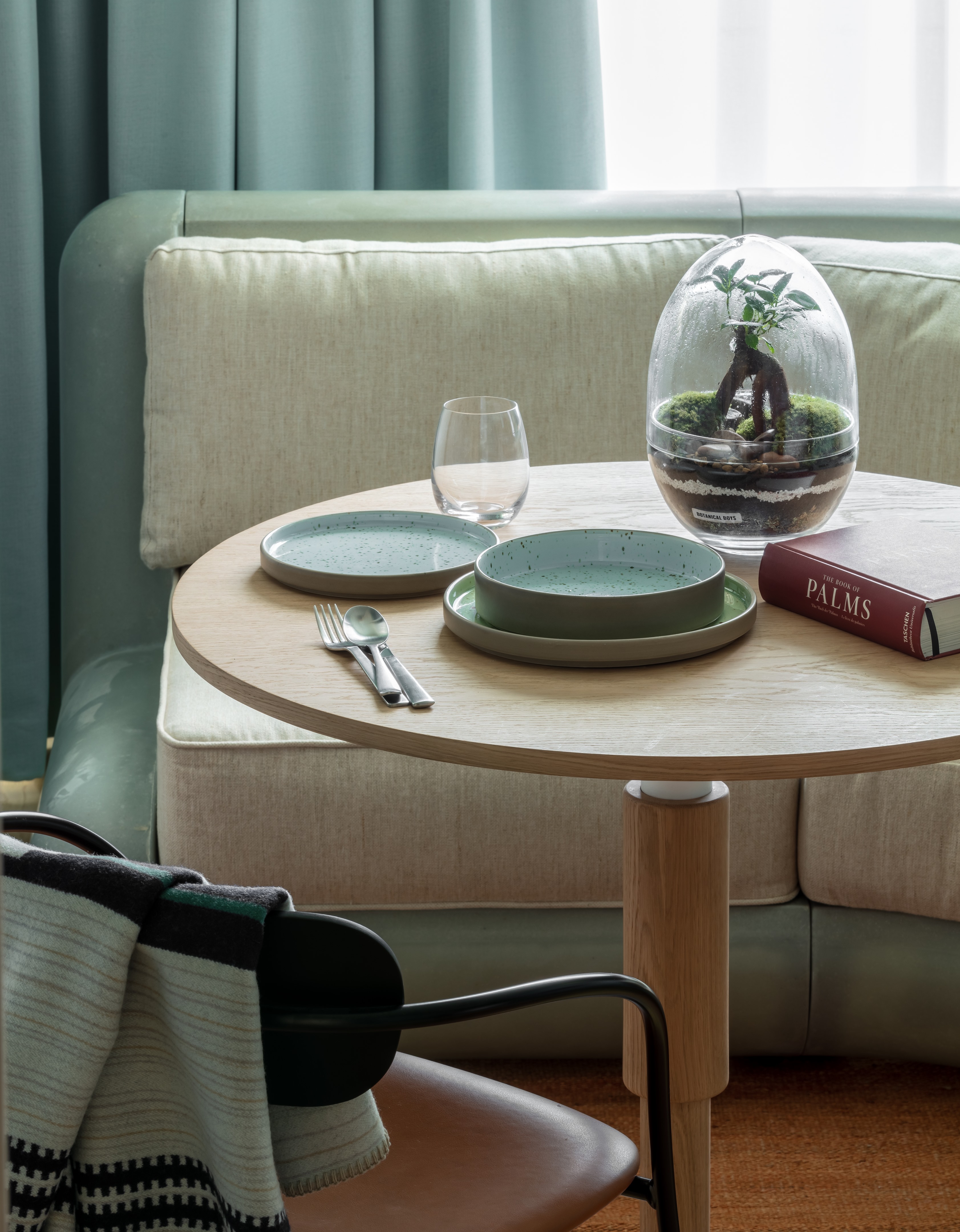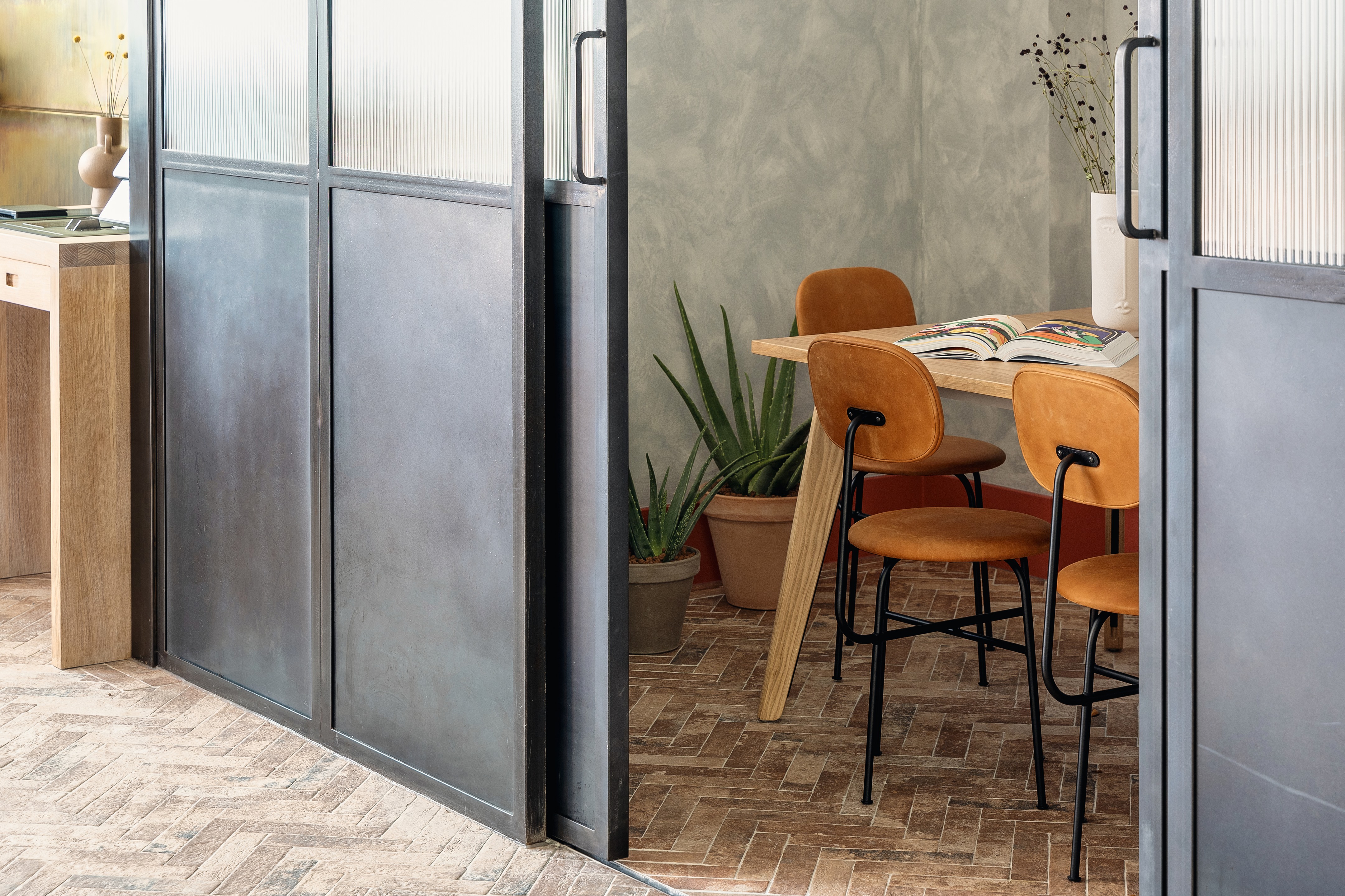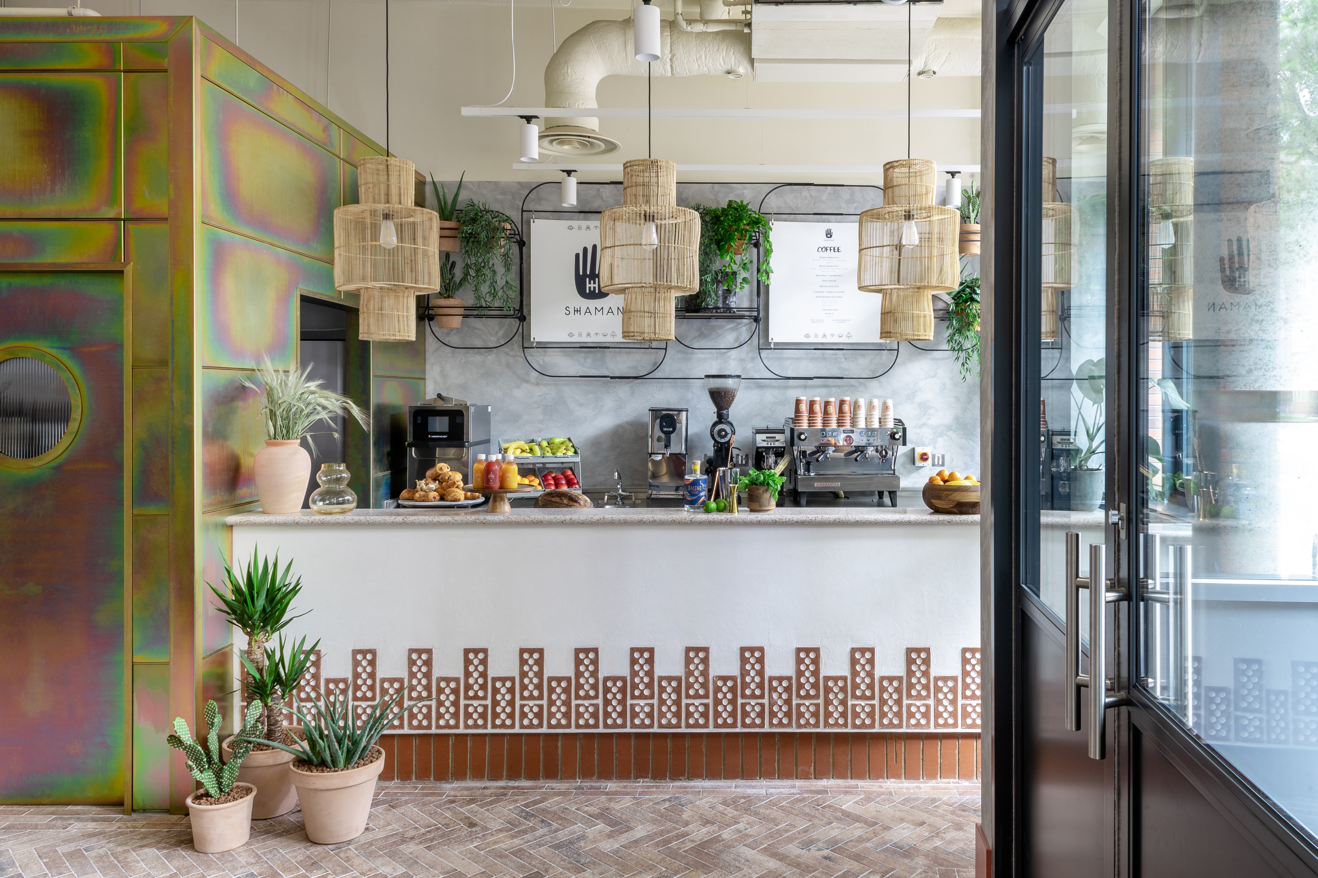 以沙漠为灵感的美学始于沐浴在由头顶镜子创造的闪闪发光的海市蜃楼中的月光招待会,其灵感来自 Olafur Eliasson 的 The Weather Project。在追求商务和娱乐的宁静中,游客可以在柔和的光线下漫步在开放的共同工作空间中——秋千椅、固定的混凝土长椅座位和悬挂的花盆点缀着酒吧和餐厅之间的空间。