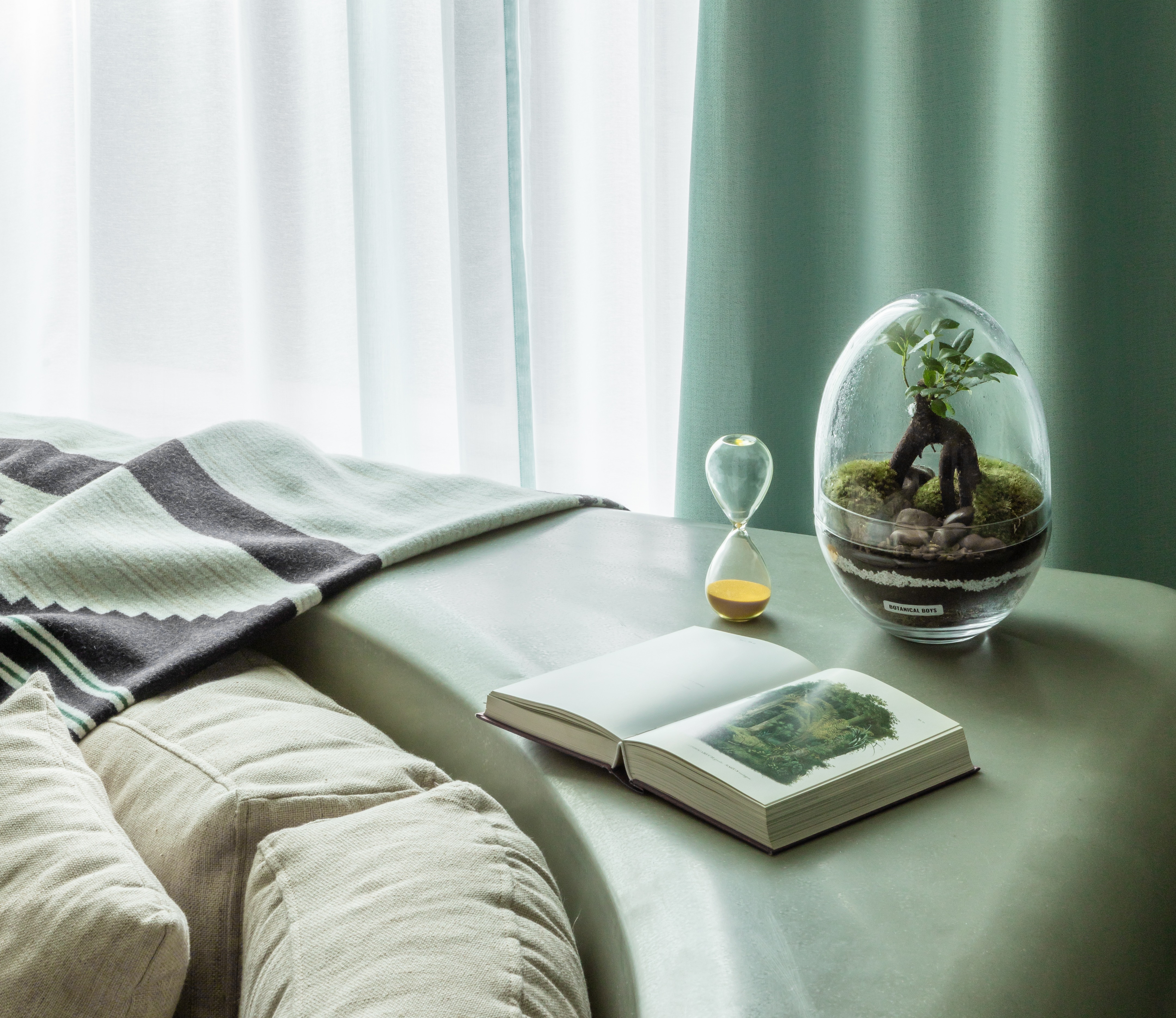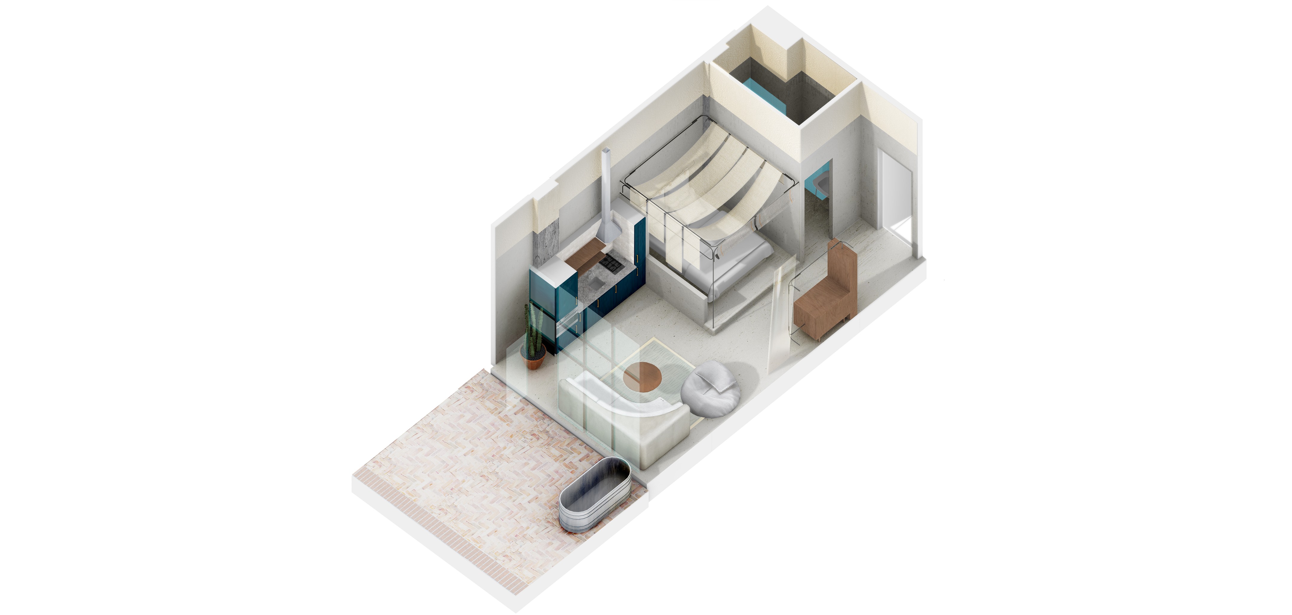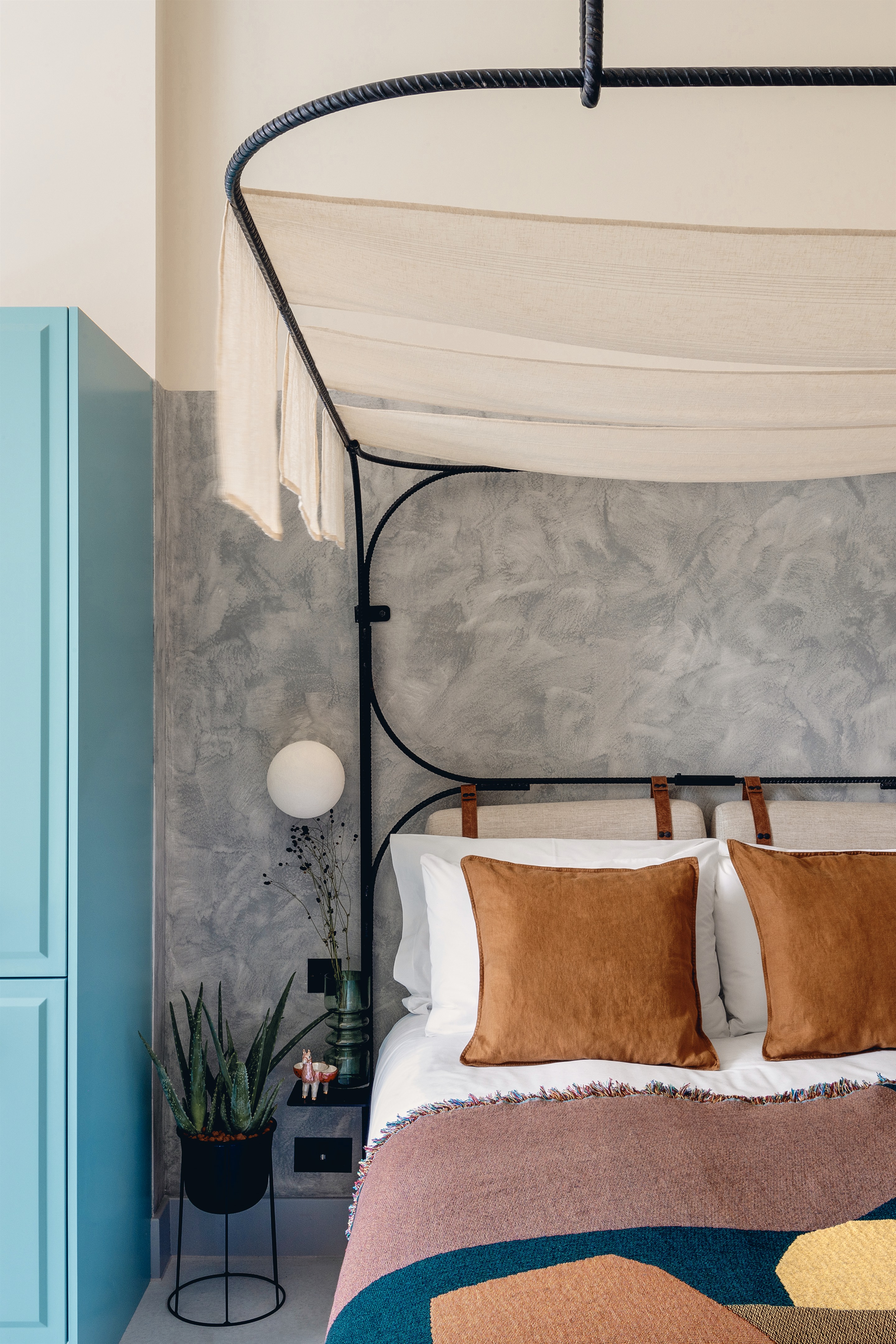 每间独立的工作室都为居住而设计,配备功能齐全的厨房和洗衣设施,让客人可以灵活地在每个房间内不受干扰地居住一晚到三个月。向大自然在美学和生态责任方面的奇迹致敬,定制的床架由黑色钢筋编织而成,并带有亚麻檐篷,为混凝土丛林的旧概念注入了一种新的避难所感。
