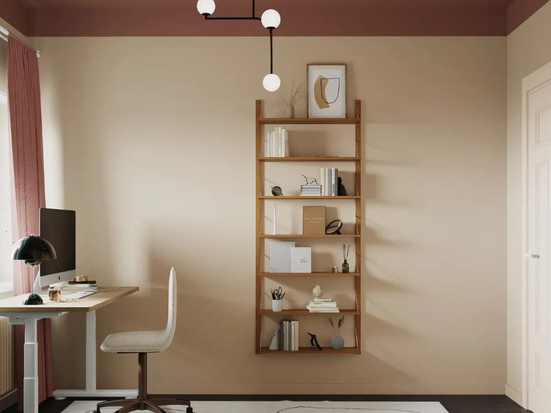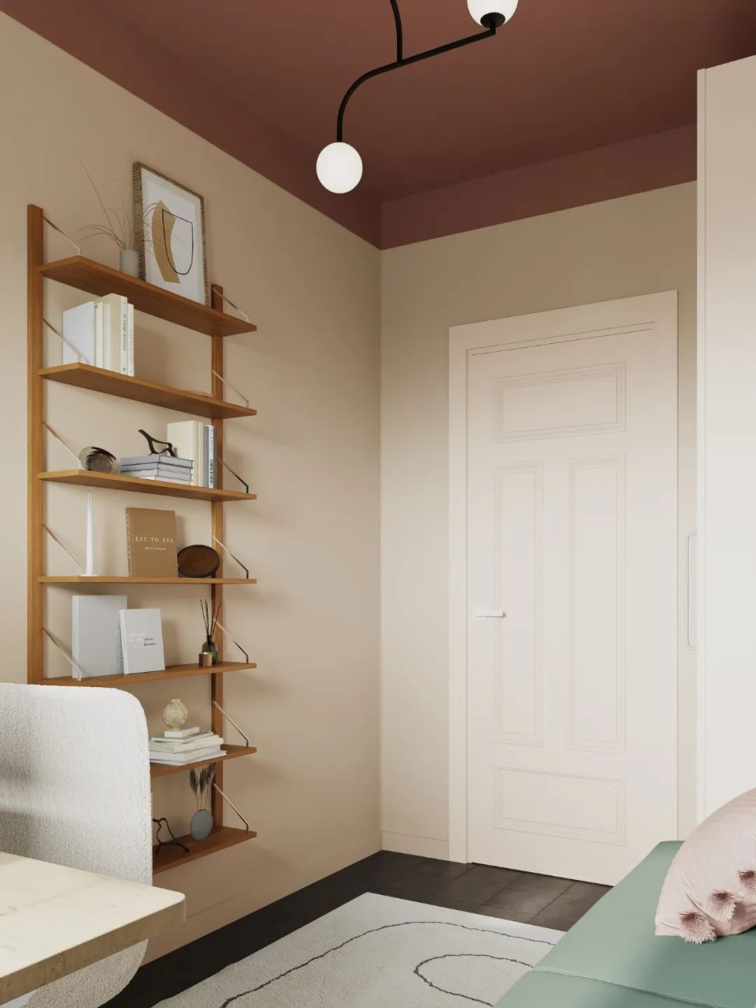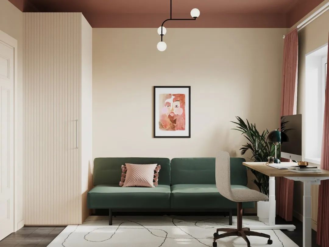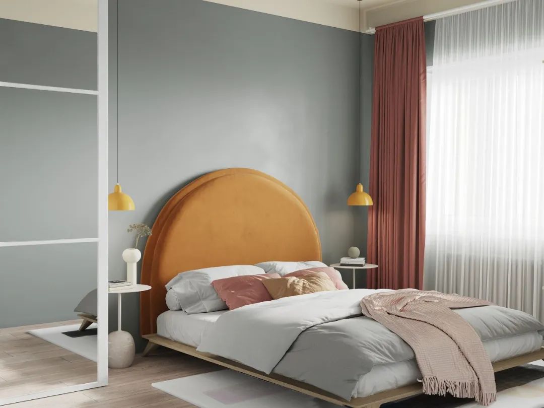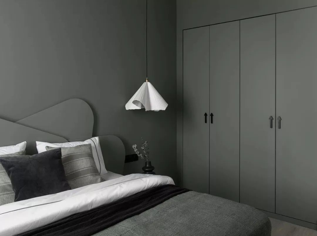 卧室是客厅的一部分,并在物理上分开了,因此在颜色的帮助下在视觉上将其分开,将卧室的墙壁和天花板涂成一个单一的复杂的灰绿色色调。