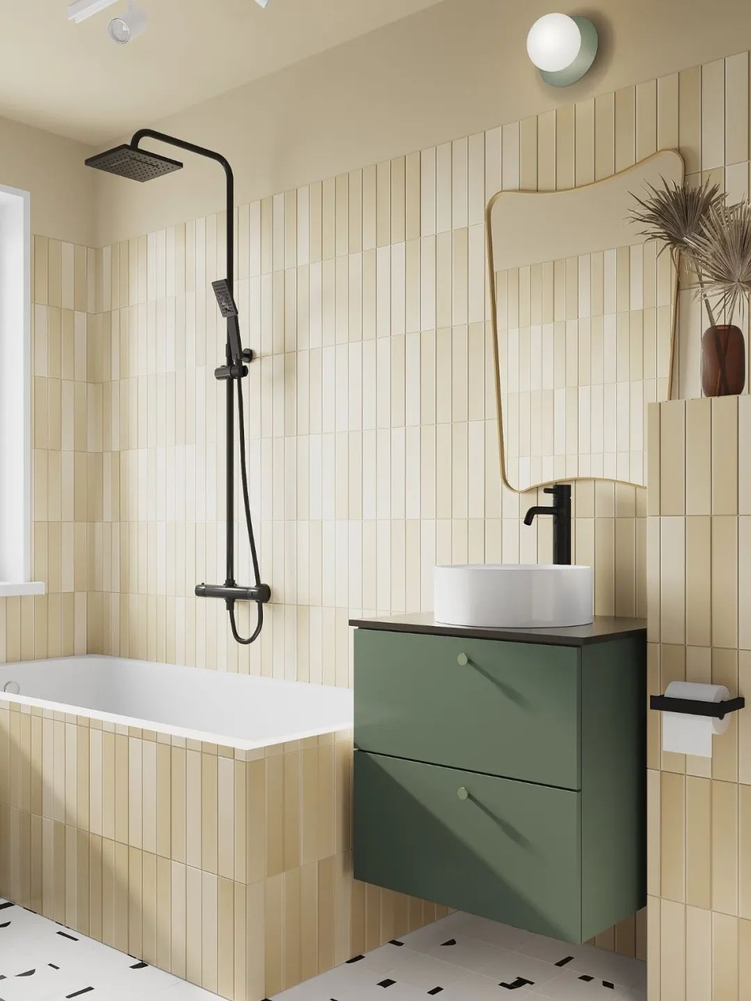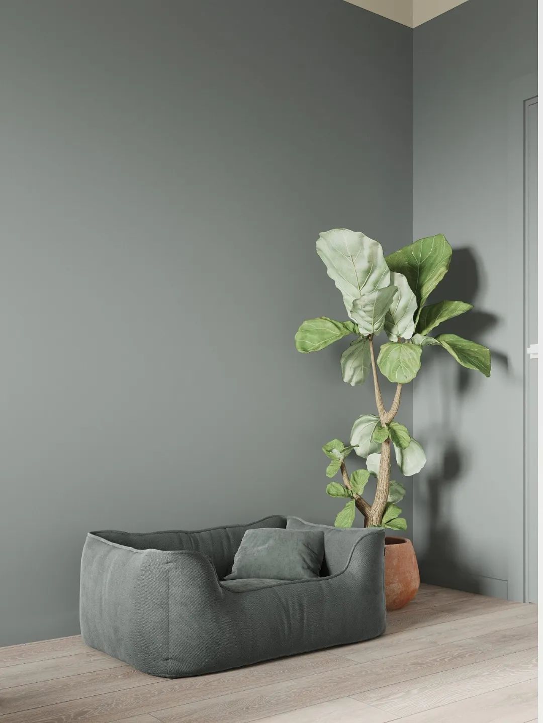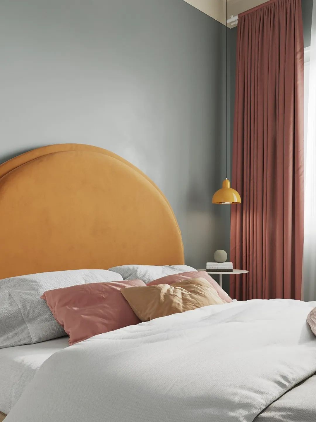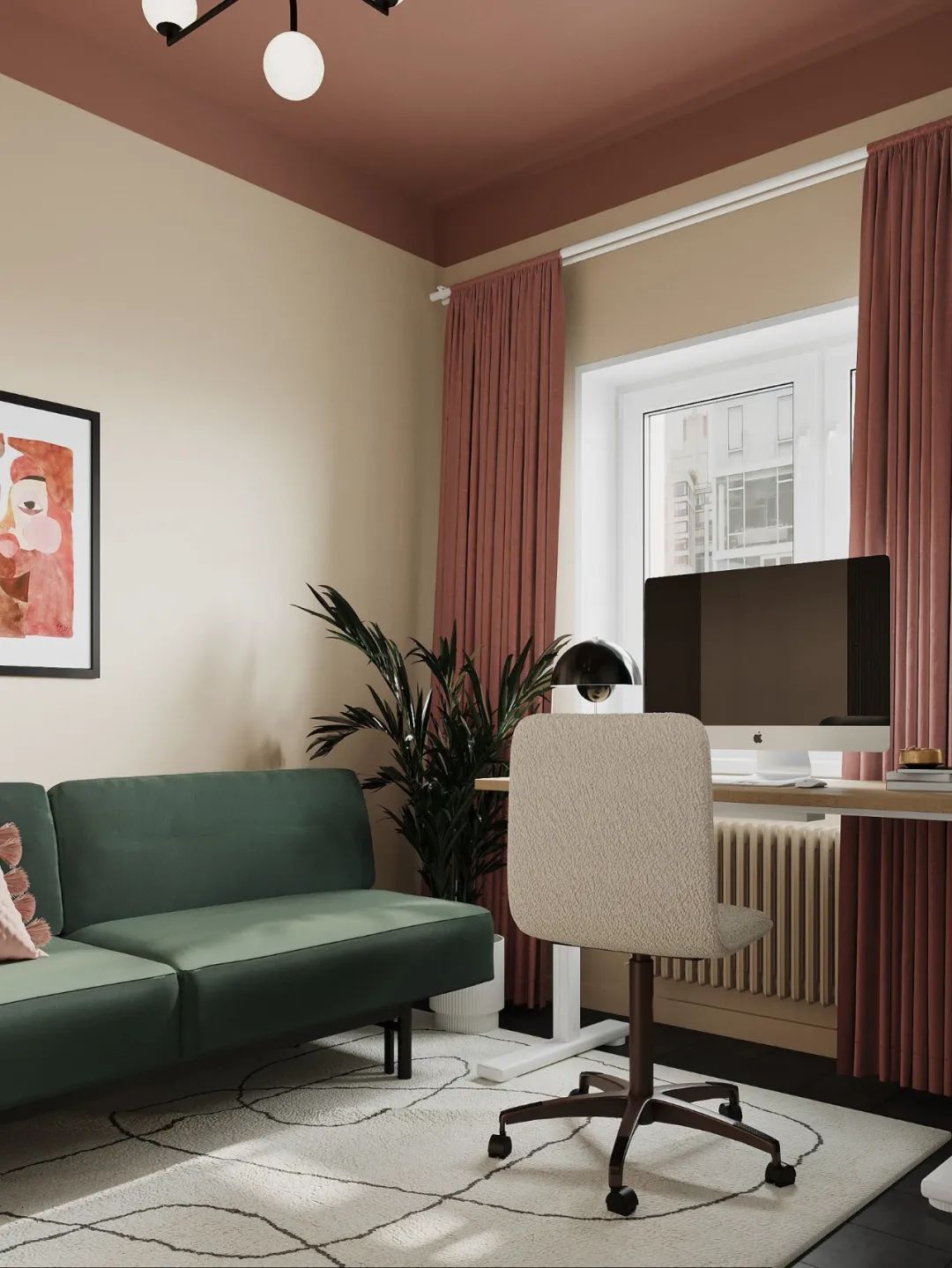 卧室是客厅的一部分,并在物理上分开了,因此在颜色的帮助下在视觉上将其分开,将卧室的墙壁和天花板涂成一个单一的复杂的灰绿色色调。