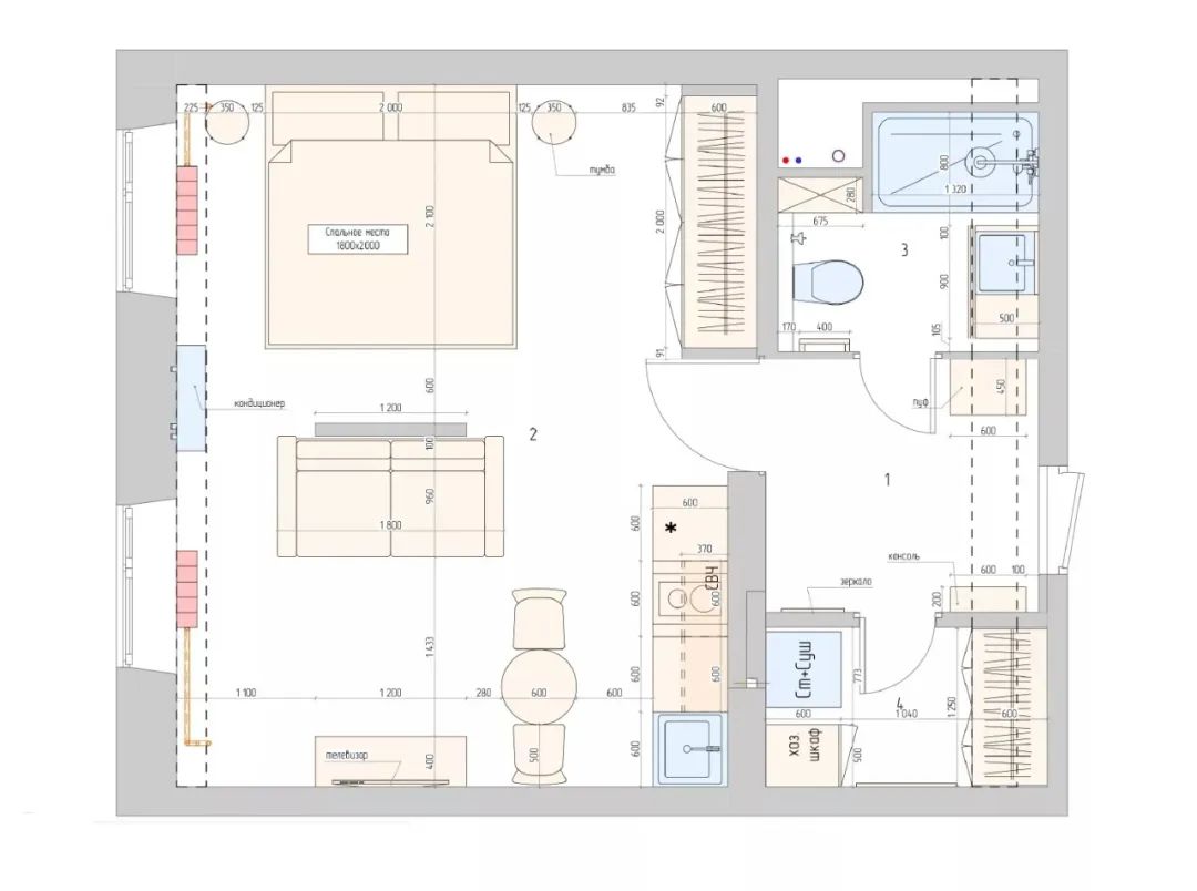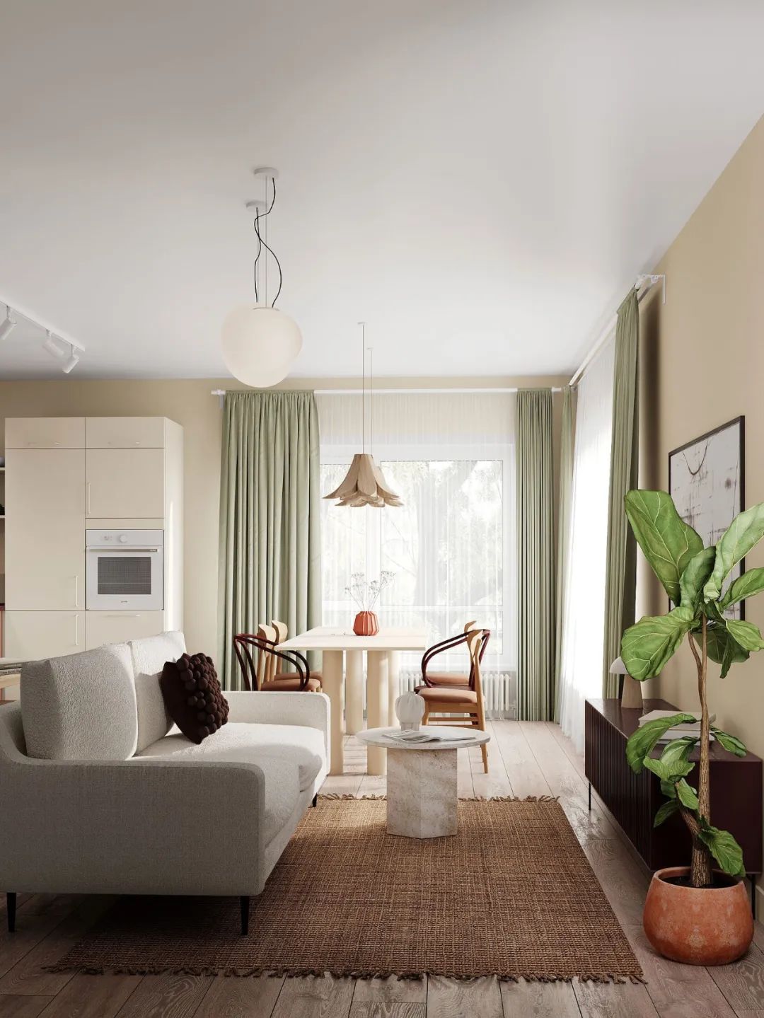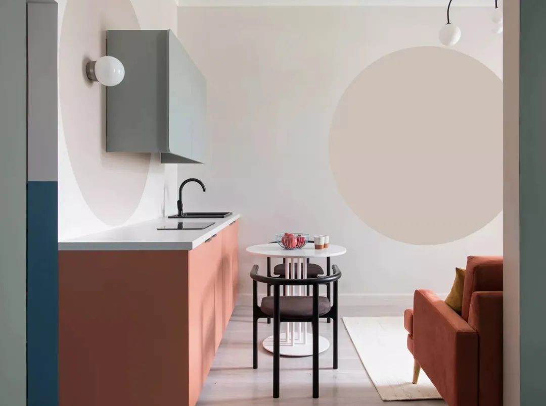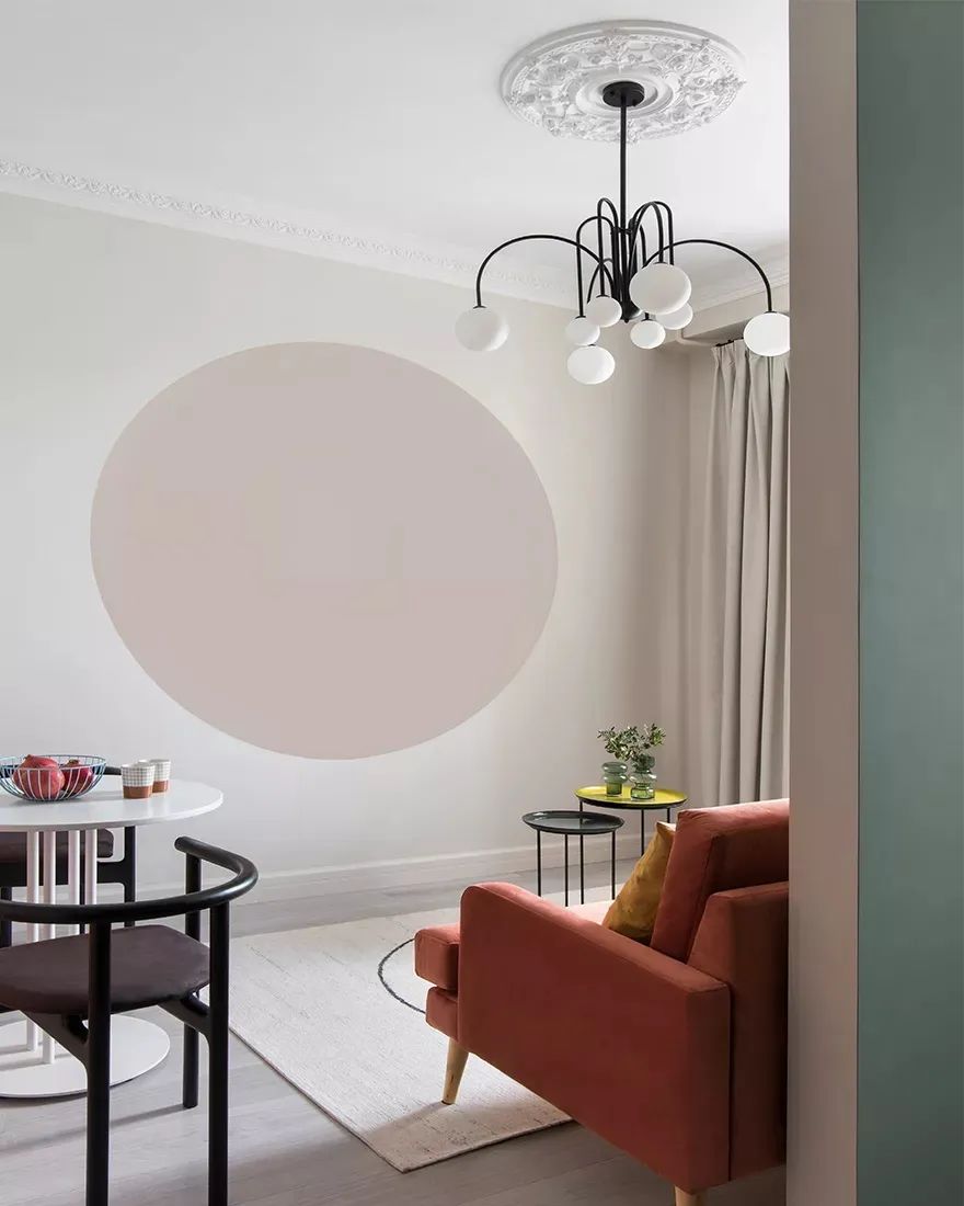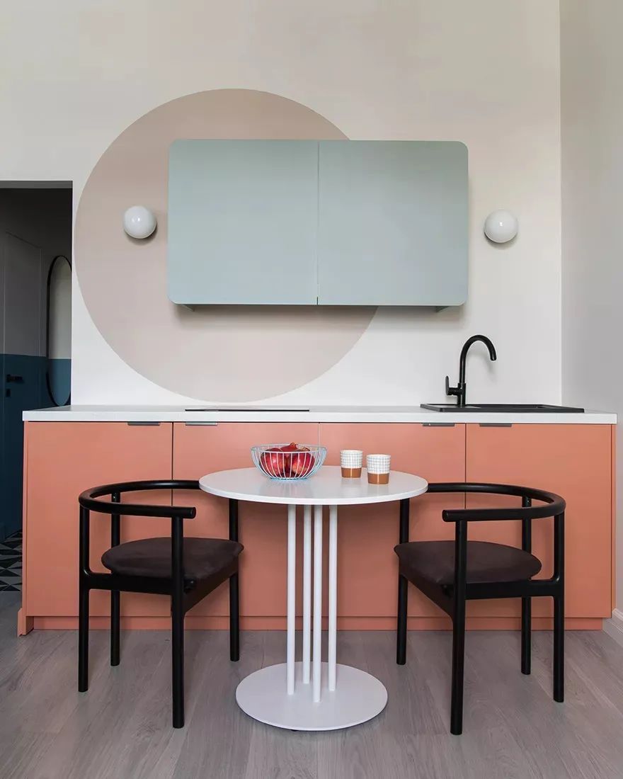Svetlana Khabeeva新作,35㎡小公寓,一个小而实用的厨房,一个客厅和一个带有大衣柜的卧室。该项目中的厨房很明亮,借助壁灯和墙上的圆形圆形的圆形立面,事实证明,它不是一个厨房,而是一个艺术品。