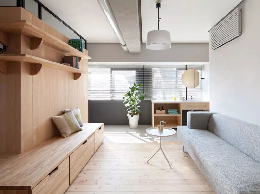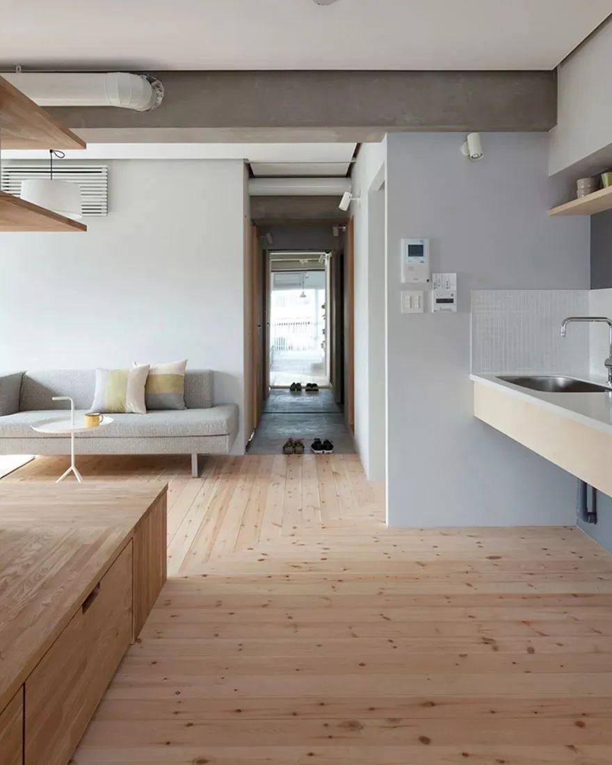 Sinato改造的一套64㎡公寓,为了以自由移动的目的,自然光的扩散以及通过自定义设计的家具突出每个空间的扩散目标,以优化整个空间。所有材料都在整个公寓中重复和协调,使该项目成为柔软而完美的渲染。