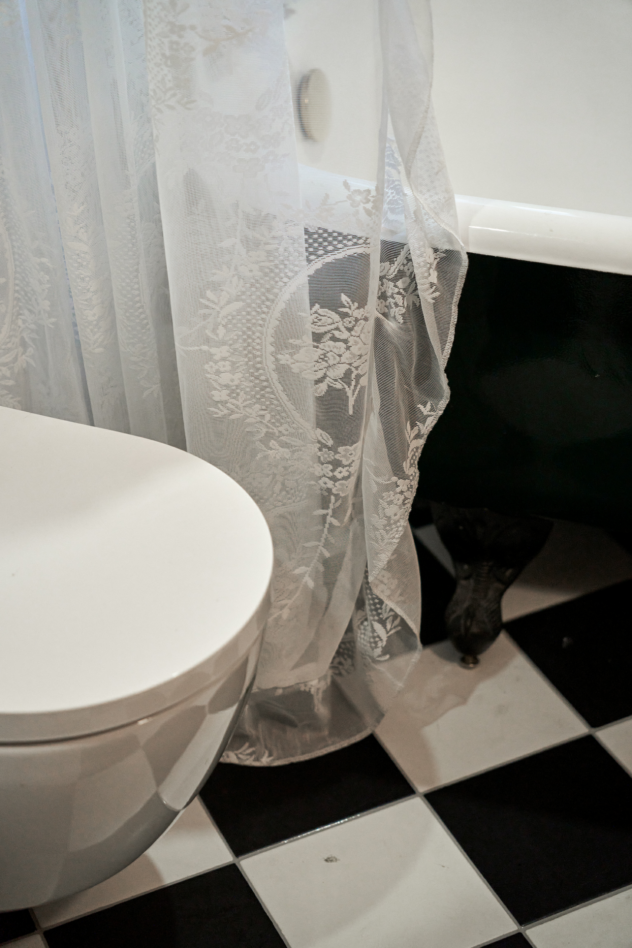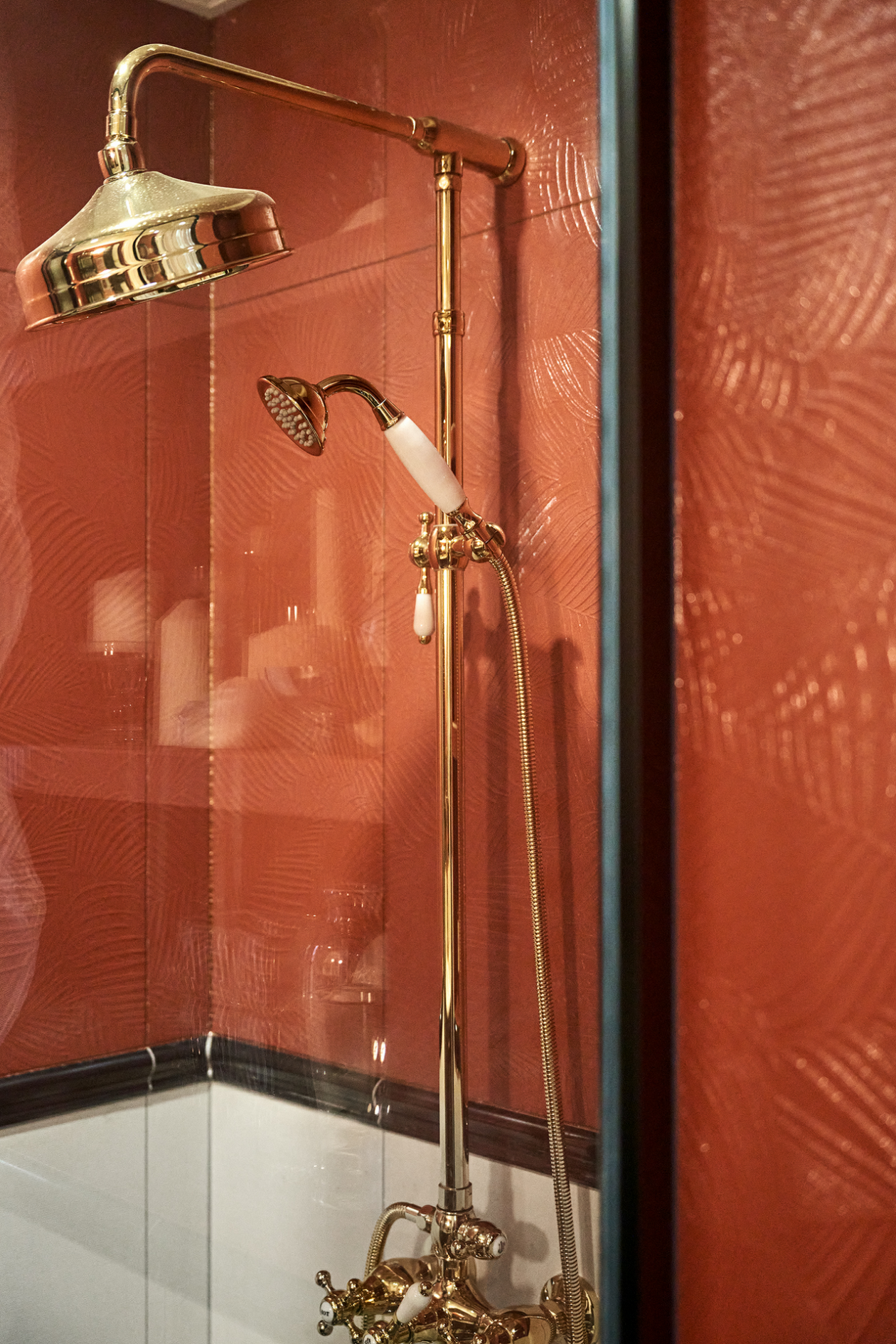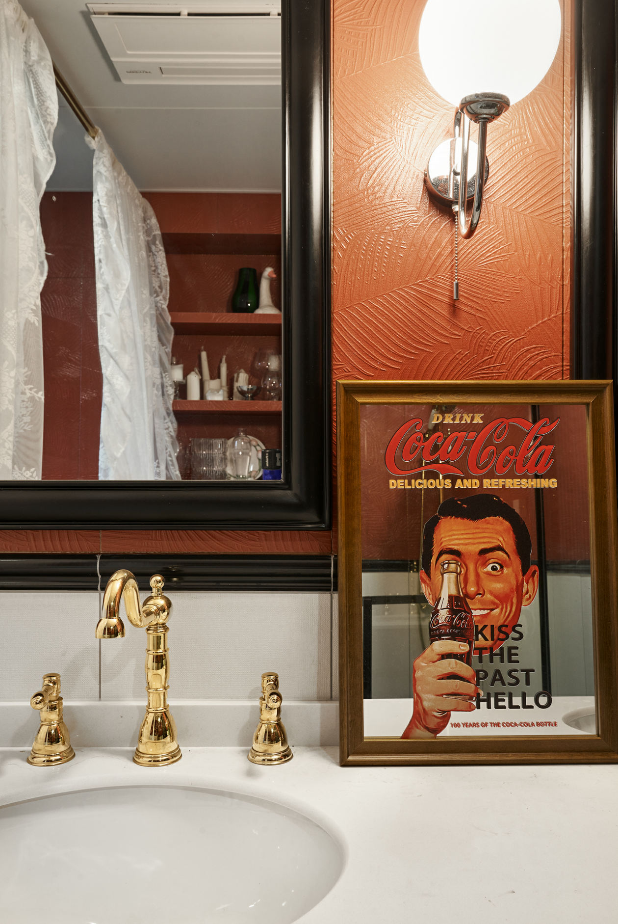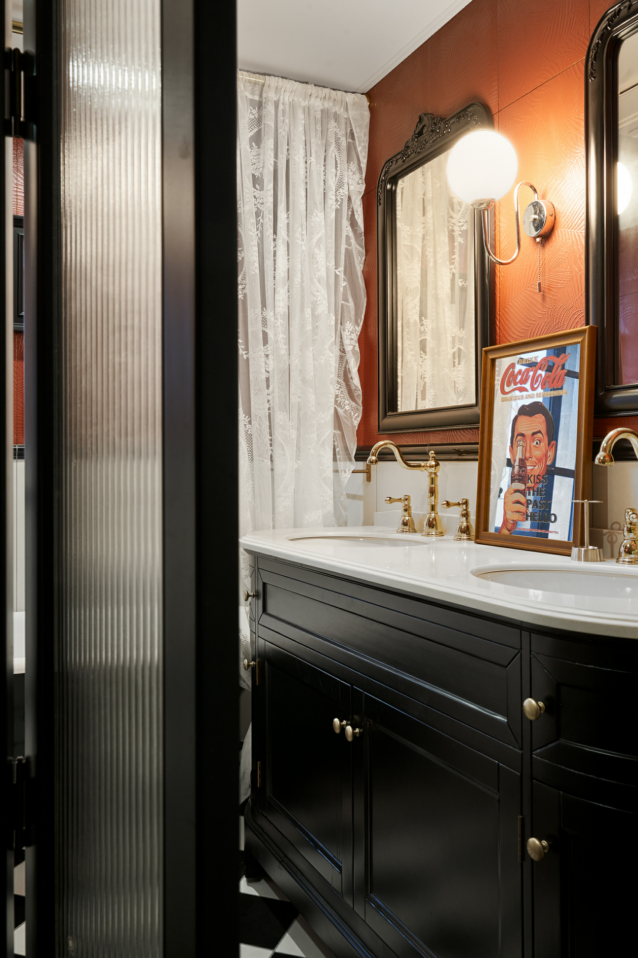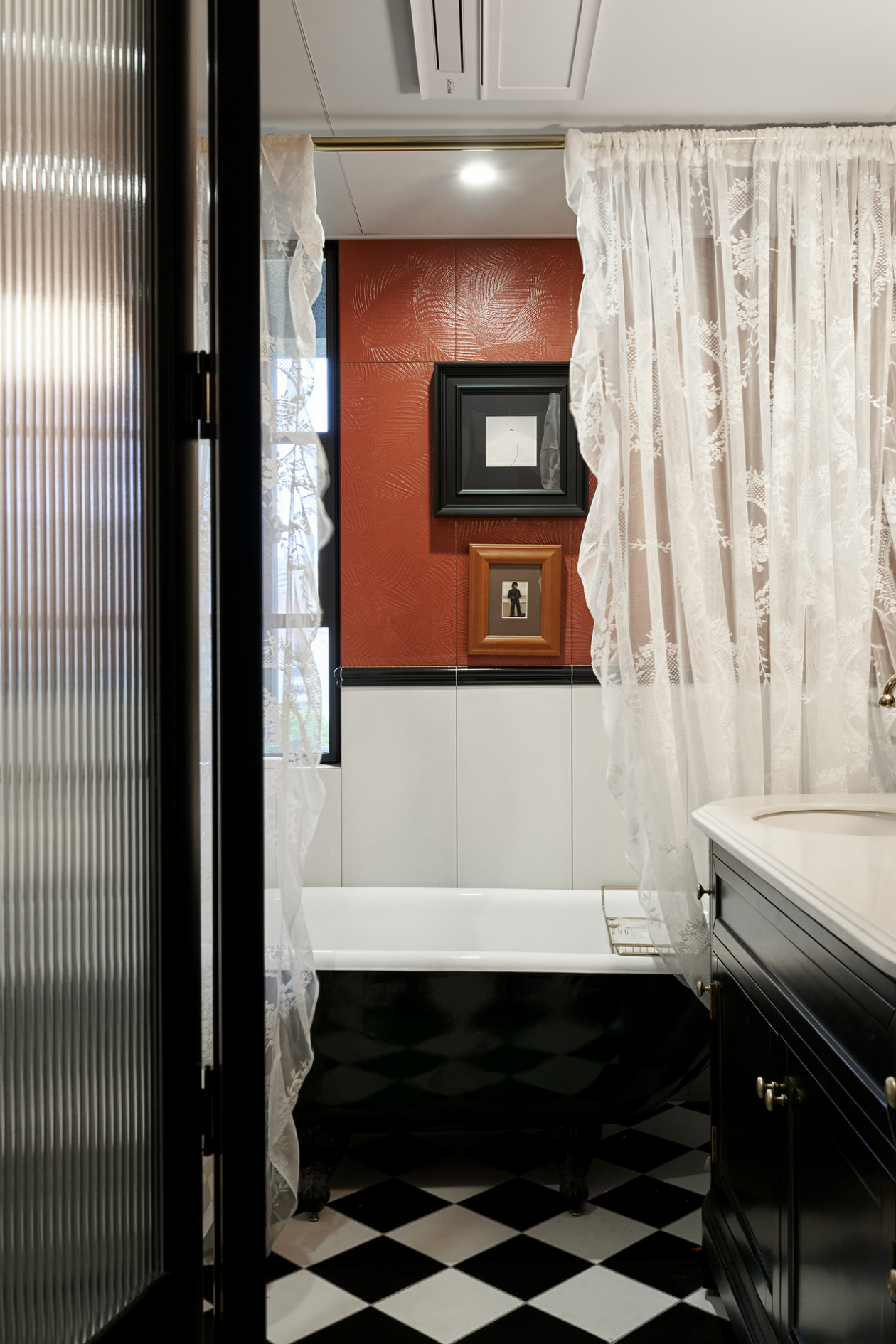 经典黑白菱格做底色,活泼的暗橘色背景肌理、复古黄铜质感与暖色系灯光让卫浴空间不再单调。