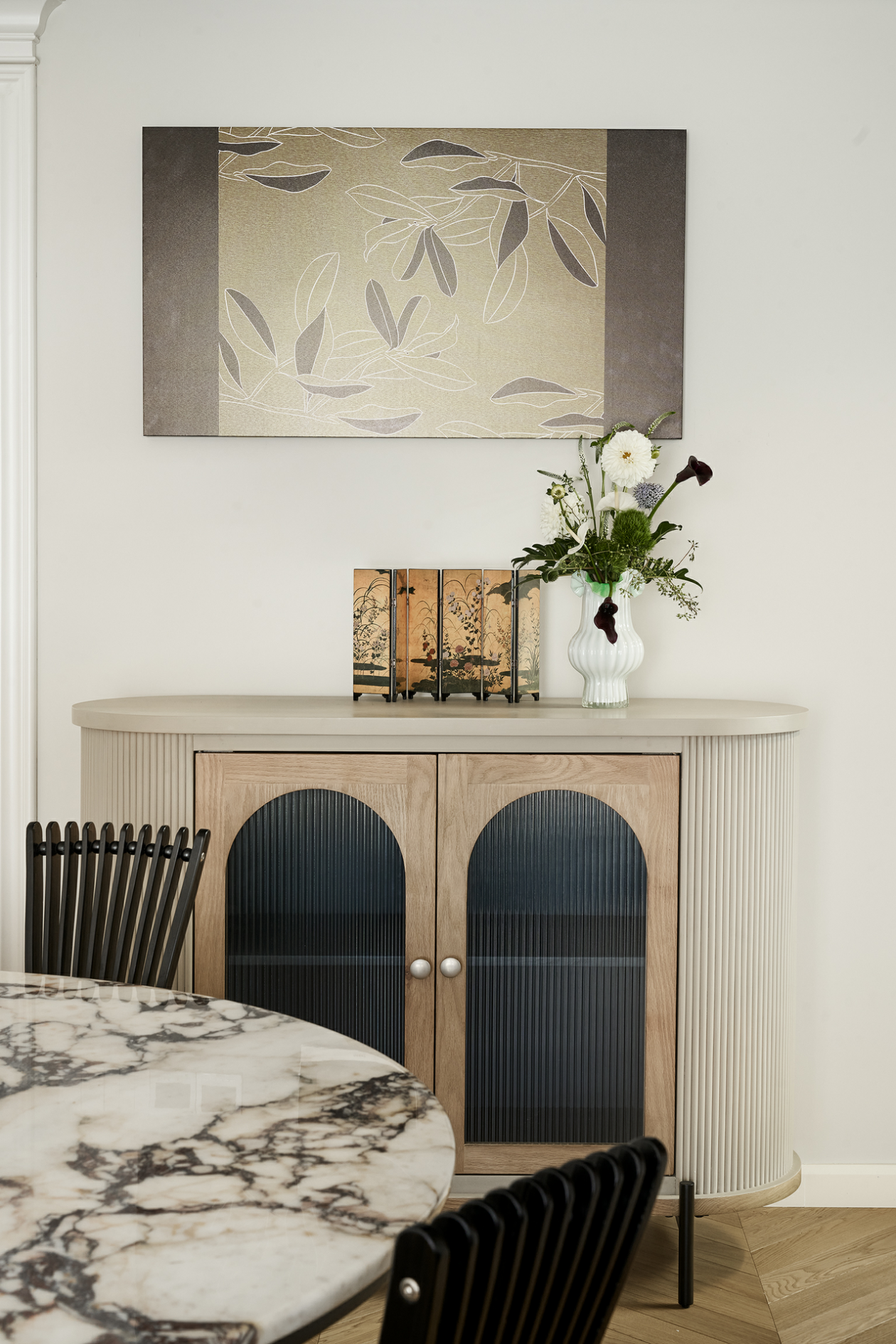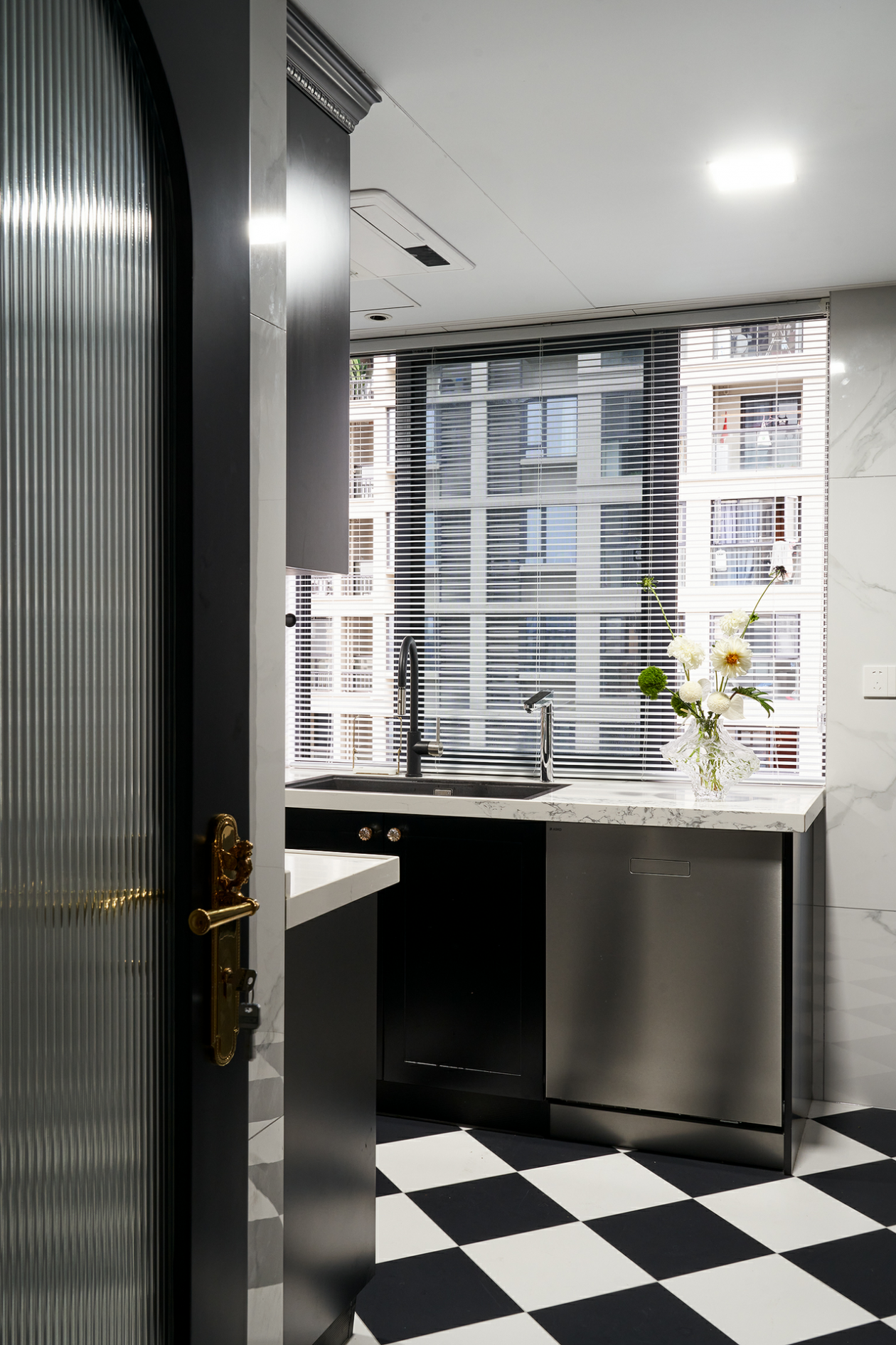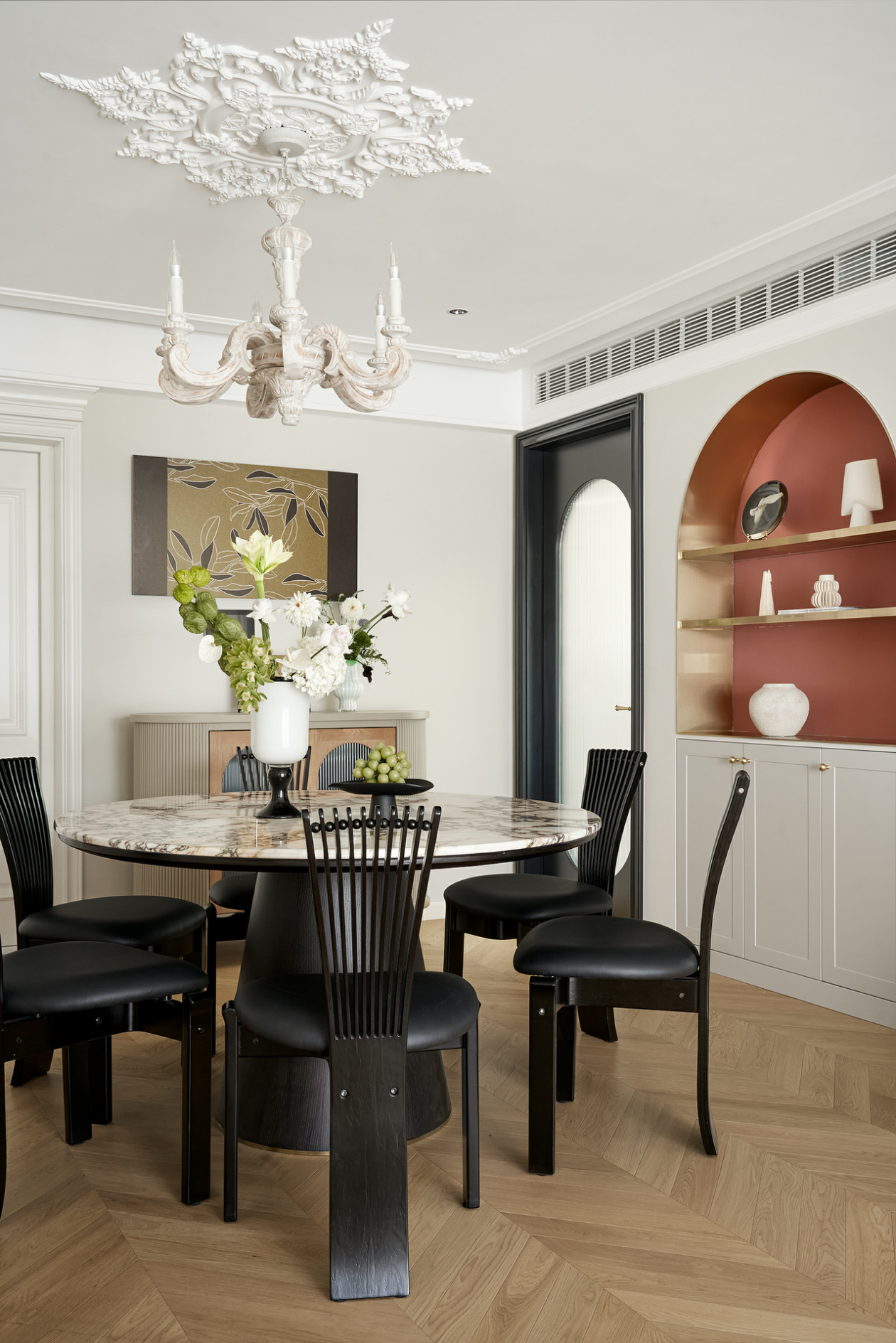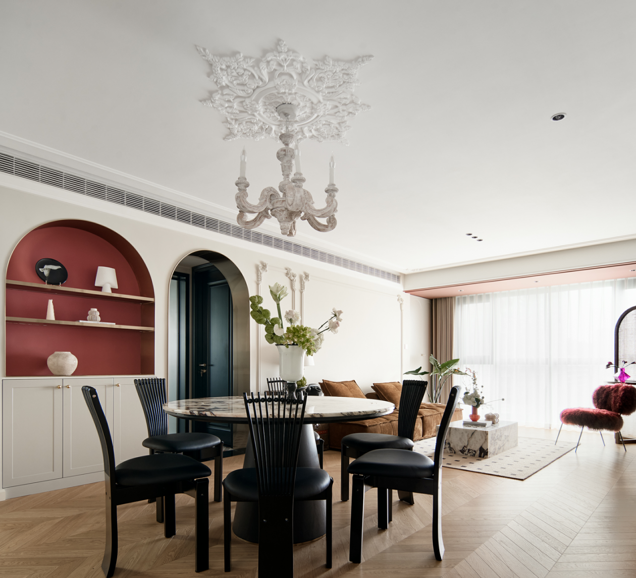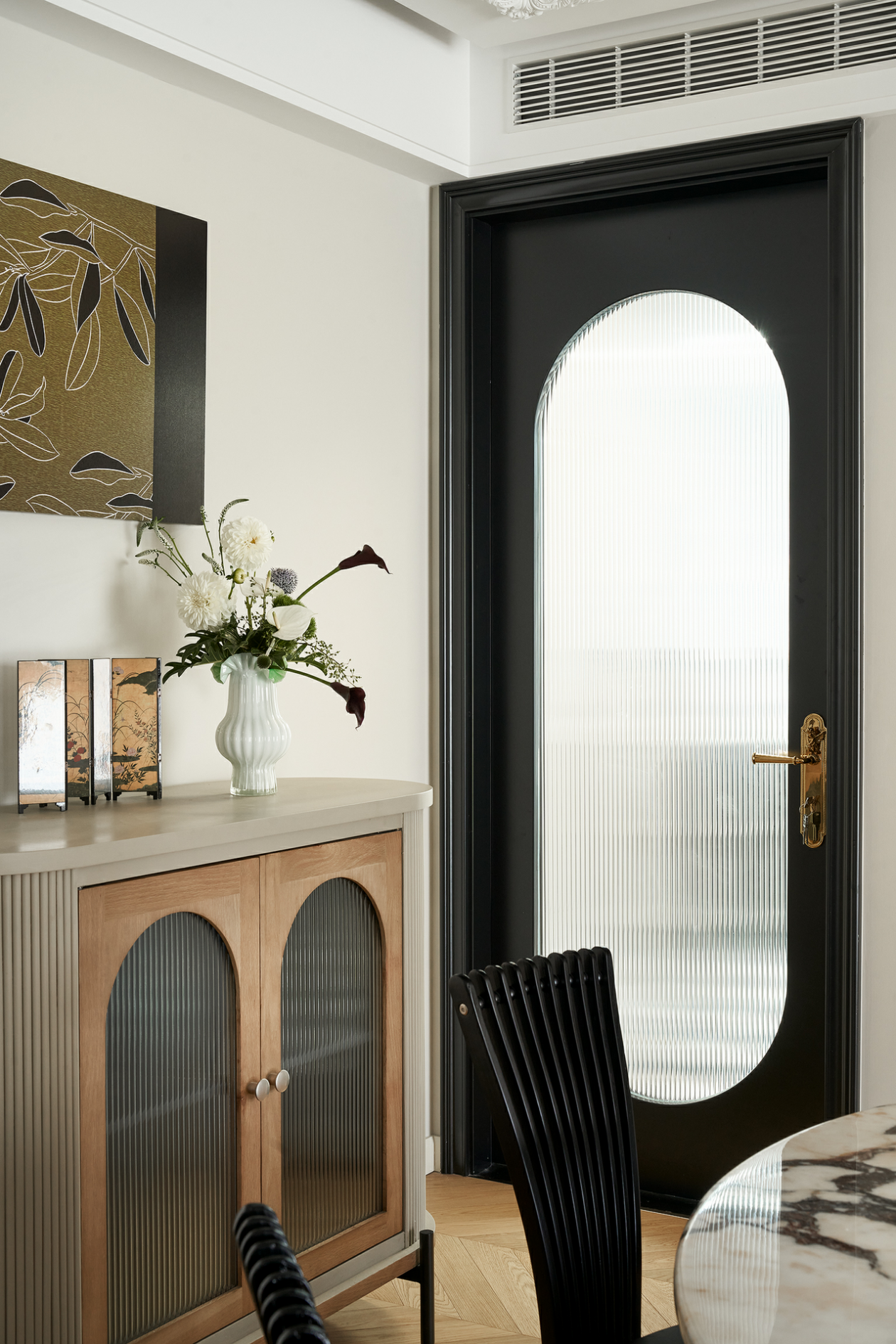 伴随厨房空间的扩容,一个经典的法式拱形餐边柜应韵而生;原本封闭的阳台敞开,让光影肆意流转,浪漫至死不渝。