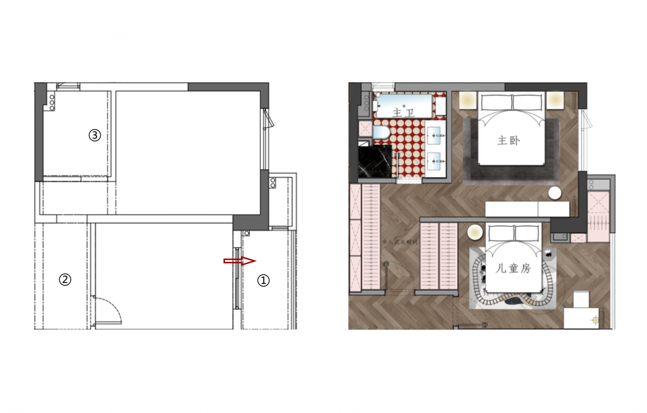 根据业主的实际需求,我们打破原本普通的卧室布局: