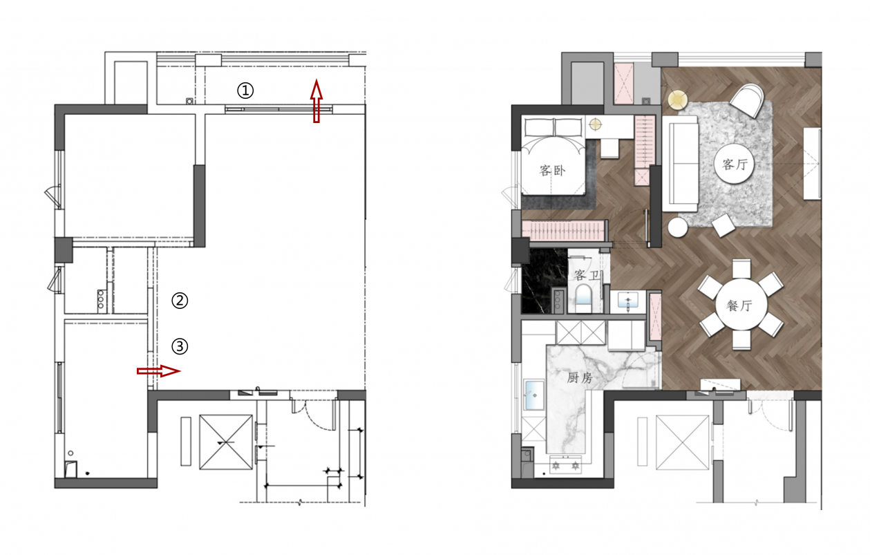 ② 厨房扩容延伸,新砌墙体分作外部洗手盆与餐边柜