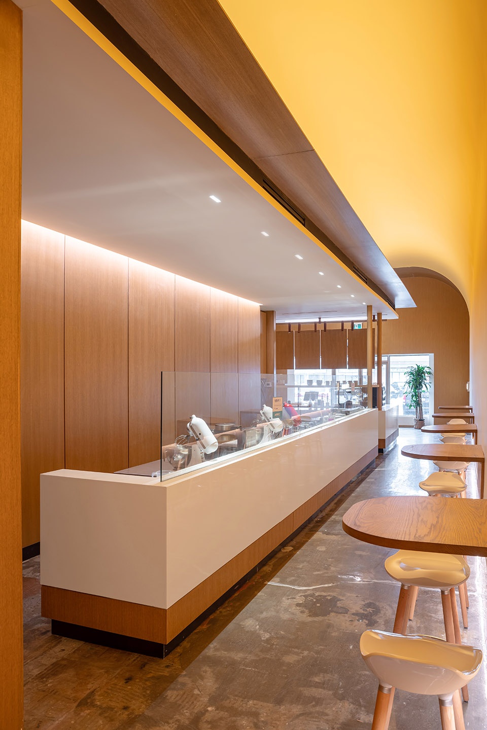 Located in an outdoor plaza, the goal is to introduce the cafe’s modern and forward presence to an otherwise traditional and subdued area. It is neither a grab-and-go cafe place nor a sit-down restaurant. It exists in the intersection of the two, and thus aims to combine the visual aesthetics of both; the brightness of the youth-led culture and the solid steadfast quality of a classic eatery. All the while, the design infuses visual traits of Japanese design to reflect the Japanese style dessert that it serves.