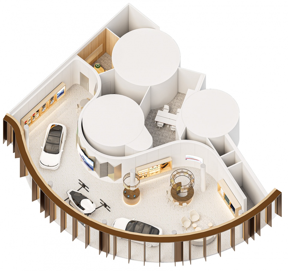 这个展厅位客户创造了一个充满丰富体验的世界。该品牌创造创新移动未来的动力体现在内饰概念中。为了营造一种外太空的感觉,室内采用了几个浮动元素,如圆形照明盘、背光悬挂式陈列柜和视觉上升高的接待台。