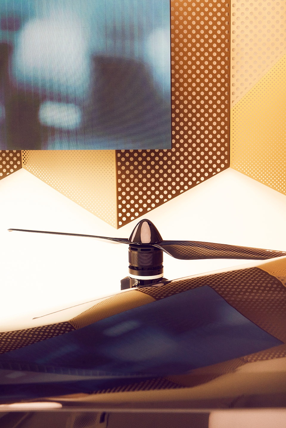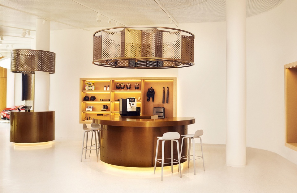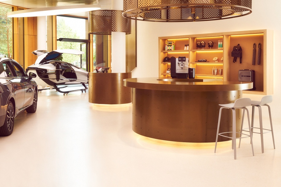Located in the Axel towers designed by Lundgaard & Tranberg Arkitekter in the center of Copenhagen, the store features a large curved window towards the city. Showcase of new electric cars by the brand including a futuristic flying vehicle is the focal point of design. These objects are further accentuated by giant hanging lighting disks, that make them visible from the street.