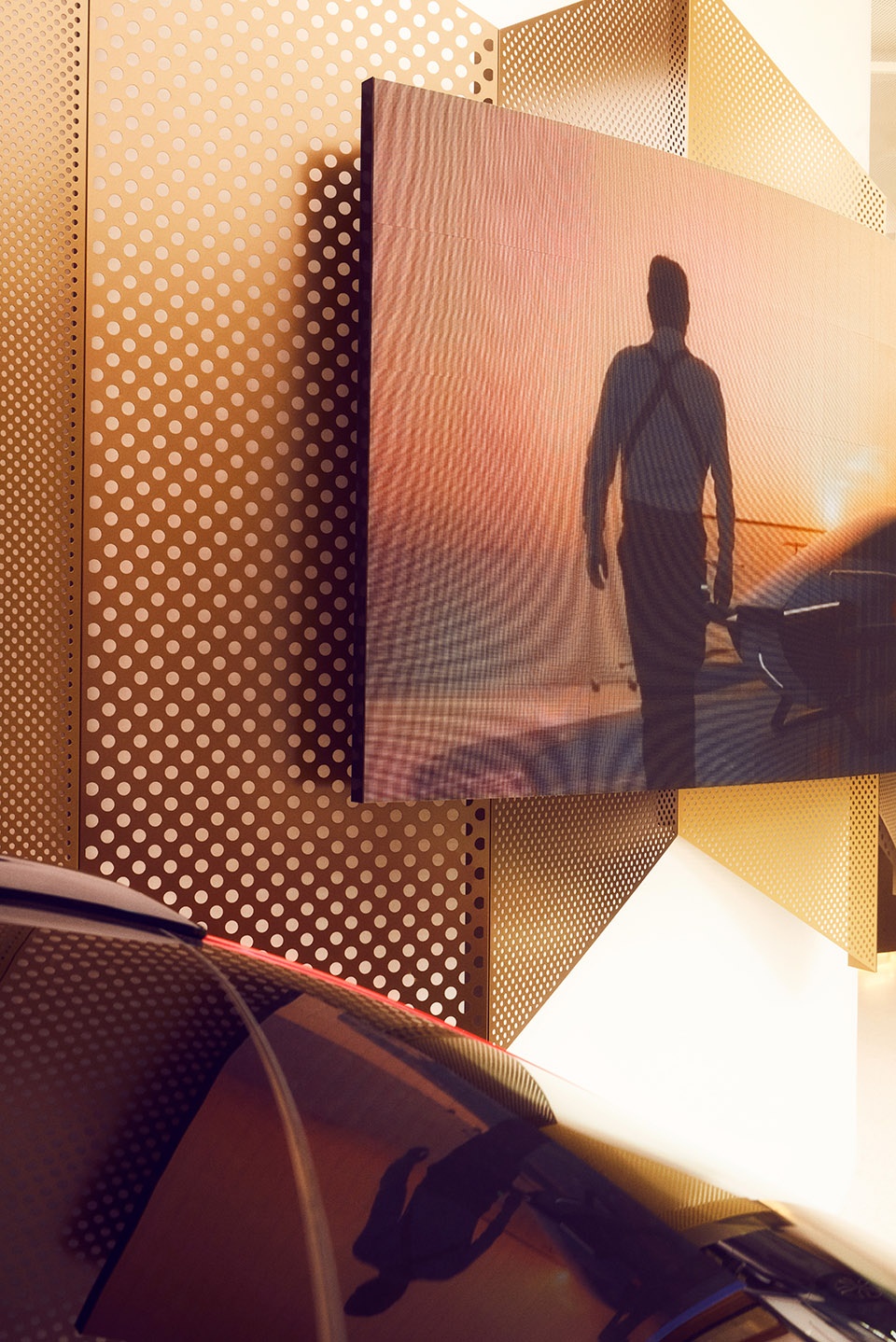 The showroom creates a universe that offers a strong customer experience. The brand’s drive to create the future of innovative mobility is reflected in the interior concept. To bring in a feeling of outer-space, the interior features several floating elements, like round shaped lighting disks, back-lit hanging showcases and a visually elevated reception desk.