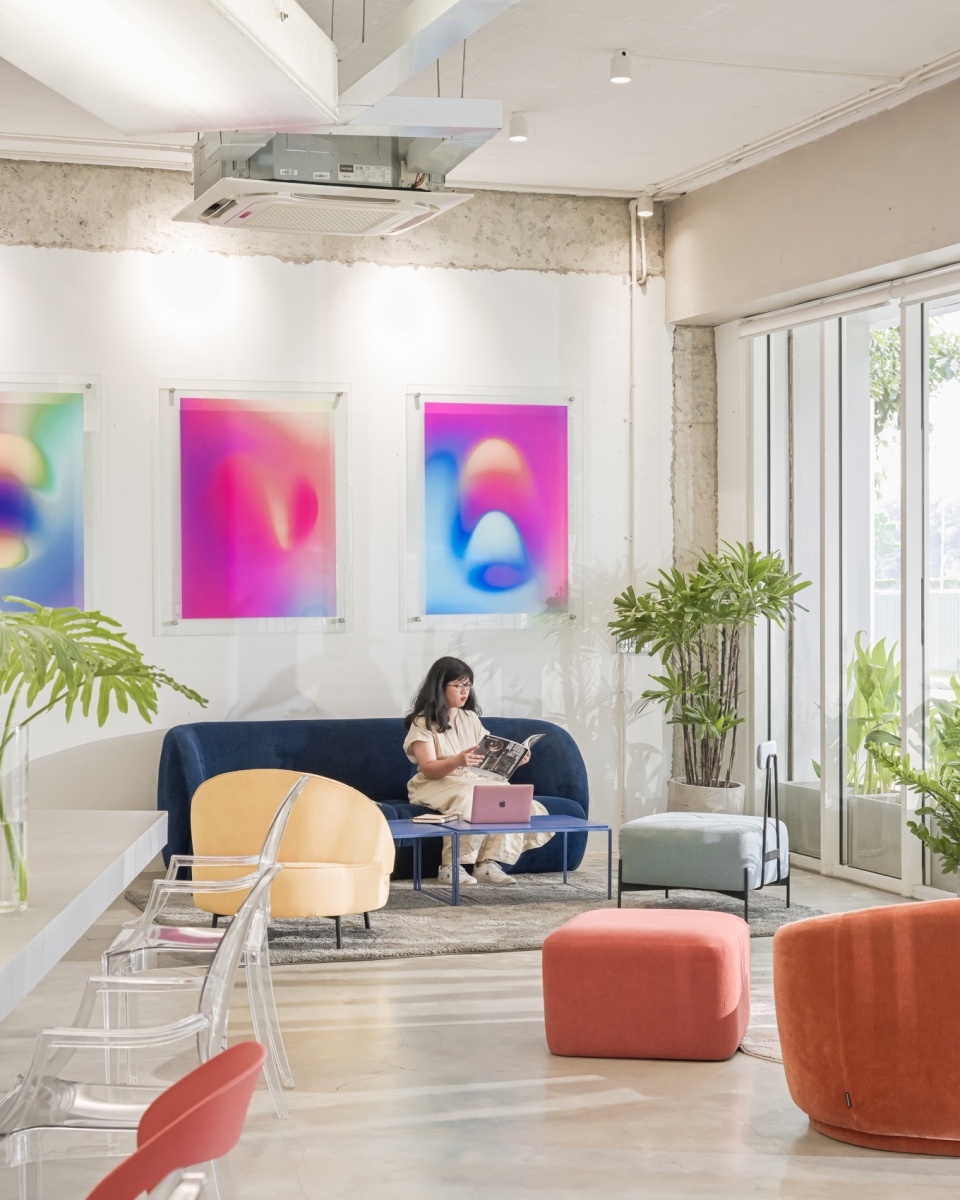 The interior is furnished with colorful furniture and artworks, to create a flexible, informal working environment that promotes creativity, knowledge, and interaction.