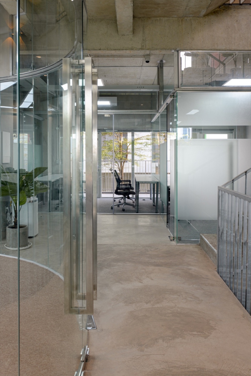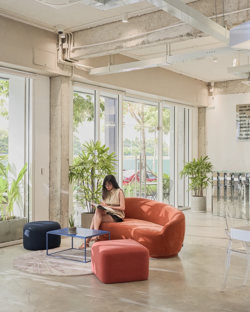 A large sofa set is placed in the space approaching the balcony. This open zone is a relaxing space as well as a place for coworkers and partners to collaborate and discuss work more comfortably and naturally.