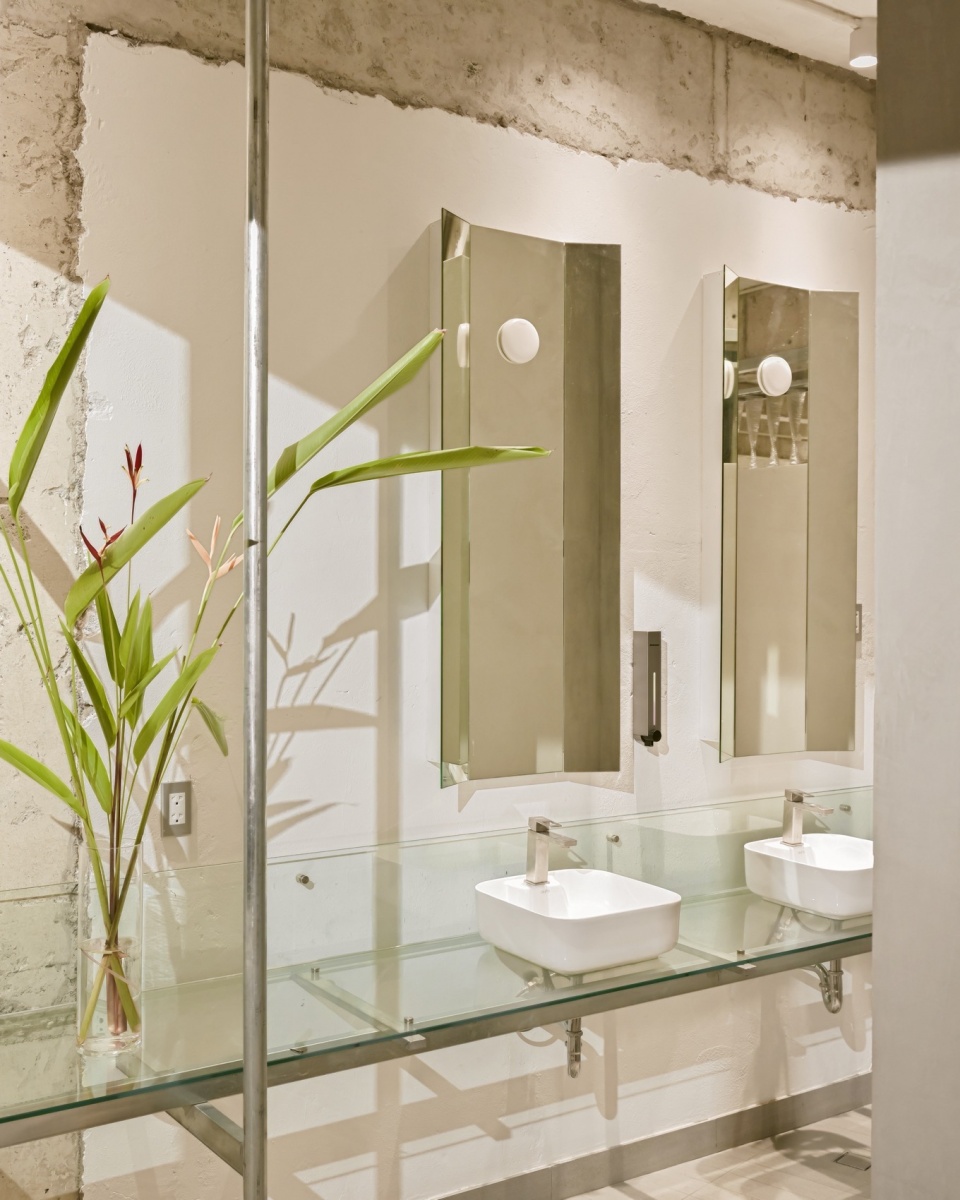 A mirror block of WC surrounded by planters box illuminating the space, creating elegant and discreet scenography.