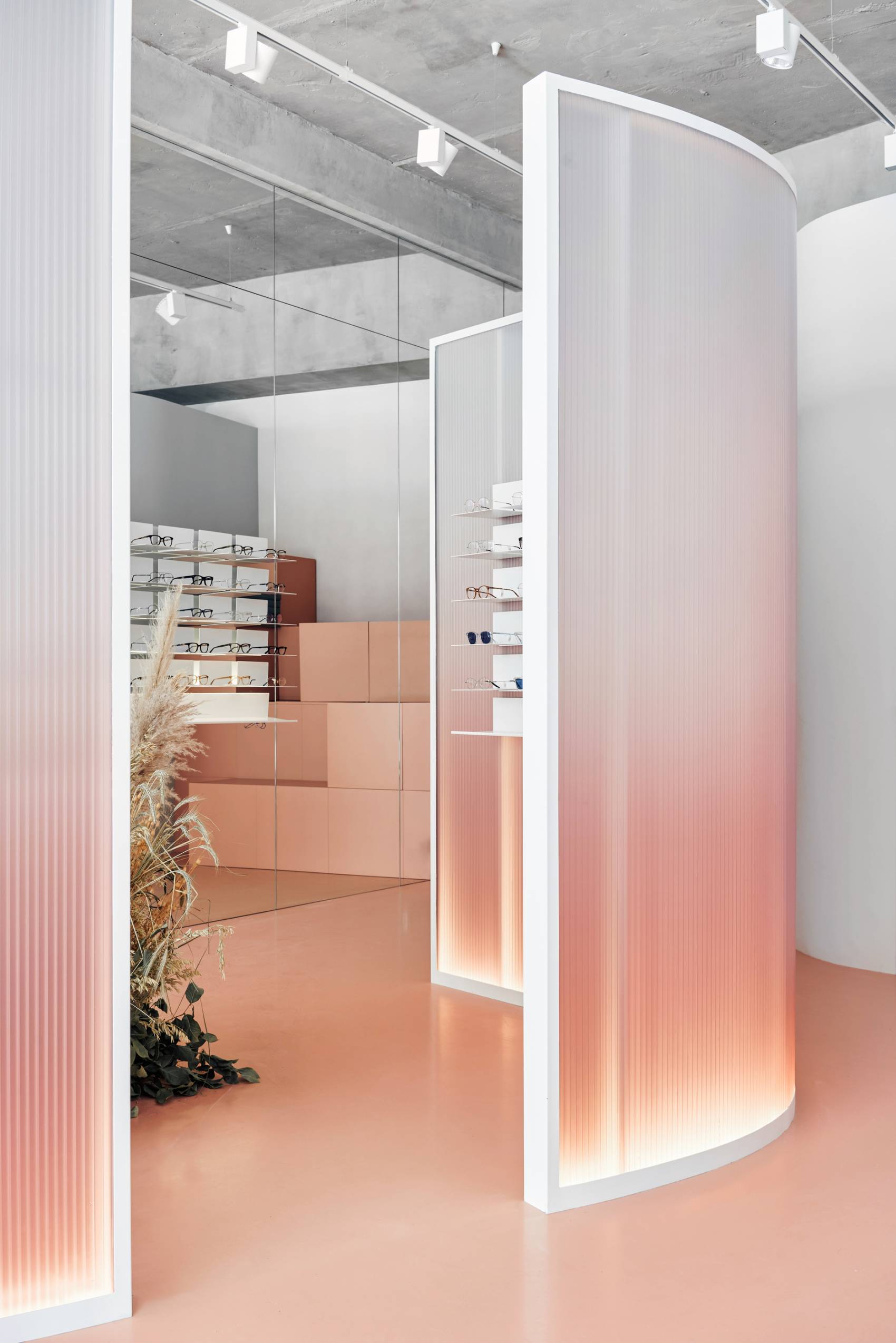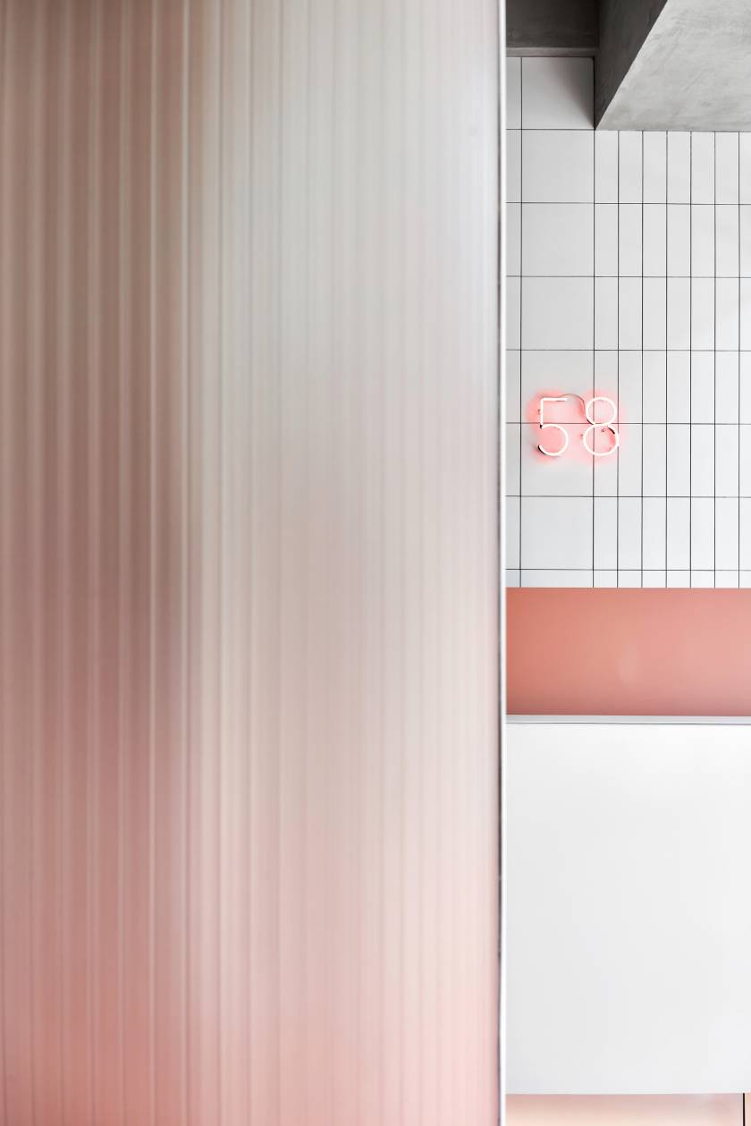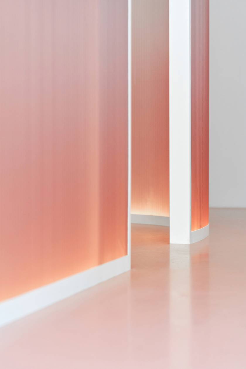 粉色在室内扮演着重要的视觉角色,充满了整个空间,并由于墙壁上的渐变而溶解在大厅的上部。