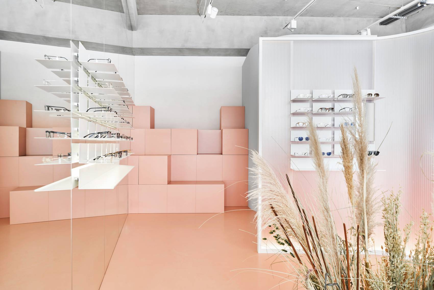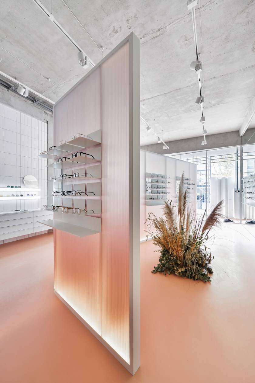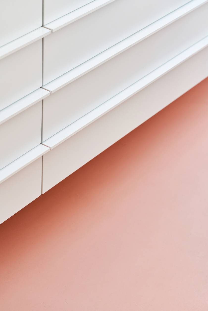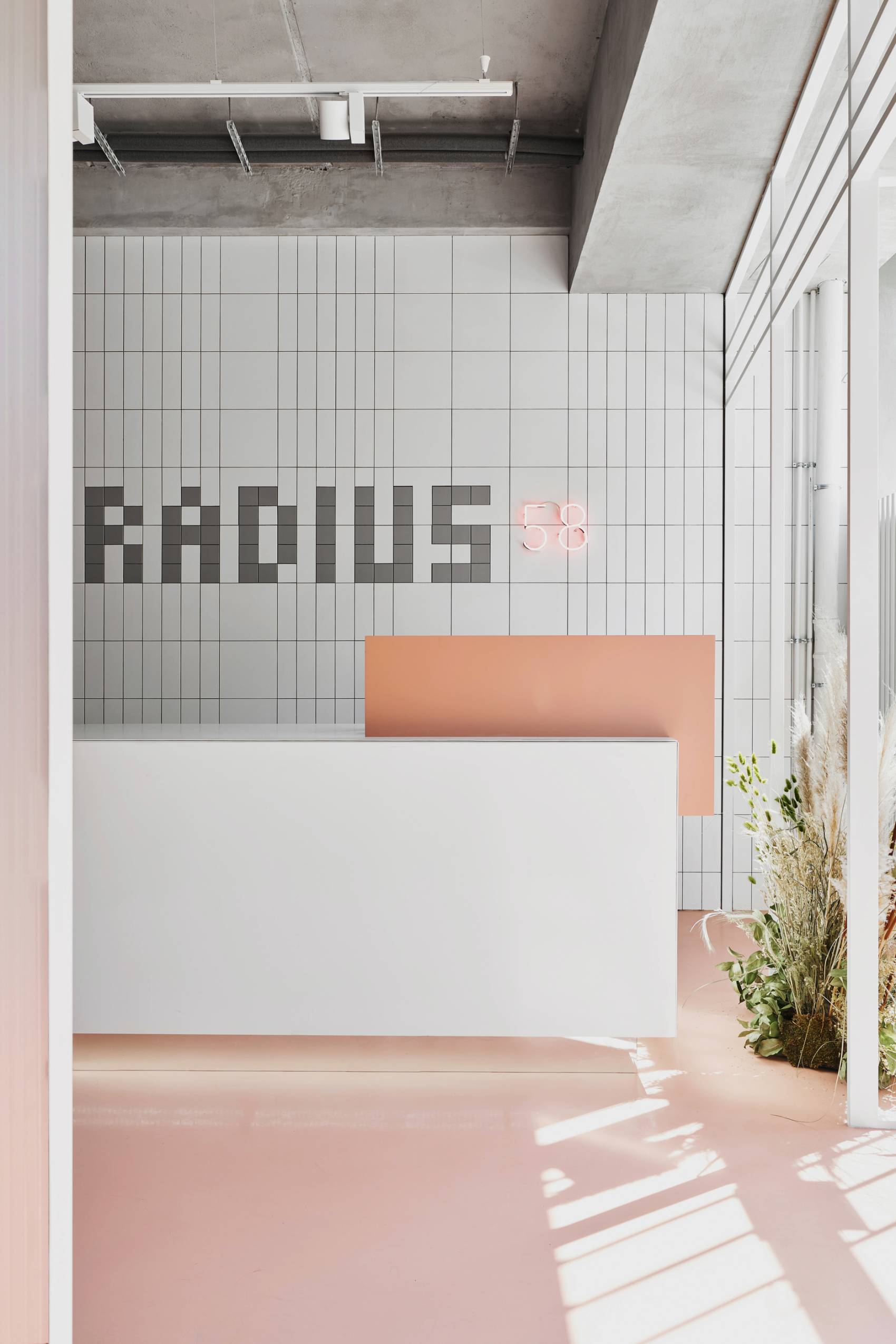 粉色在室内扮演着重要的视觉角色,充满了整个空间,并由于墙壁上的渐变而溶解在大厅的上部。
