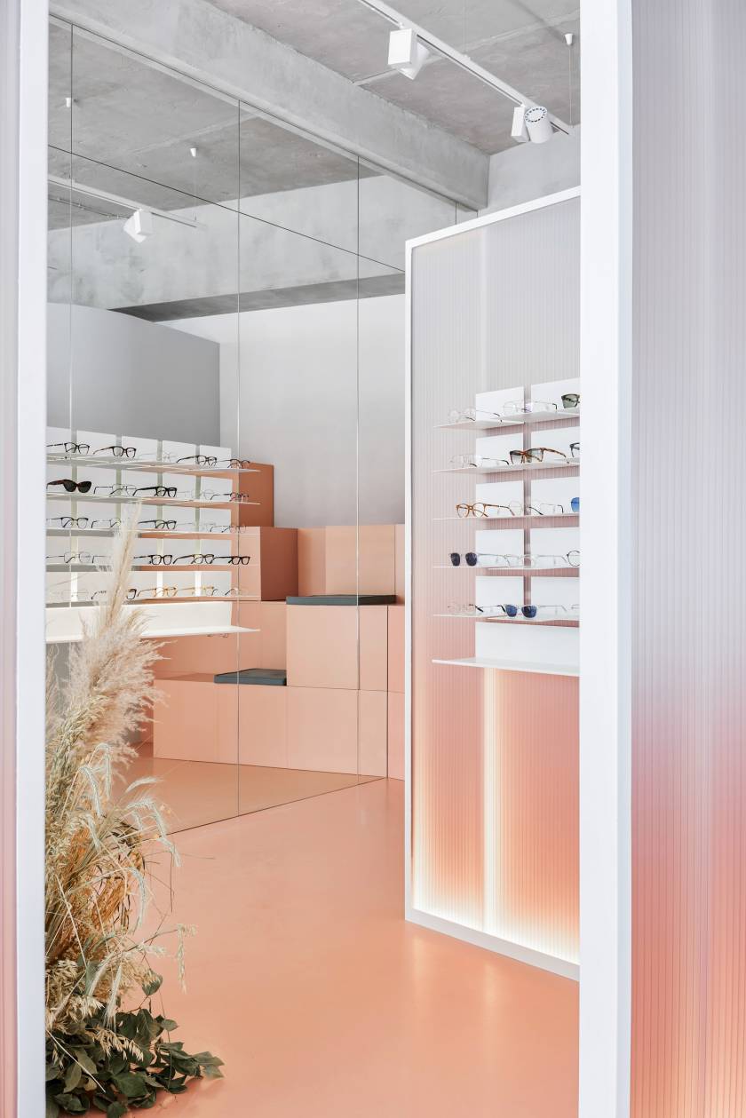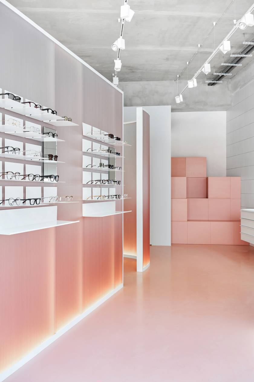 这座由粉红色地板长出来的结构在夜晚的街道上看起来非常令人印象深刻,由于背光,反射在镜墙上,吸引了路人的注意力。