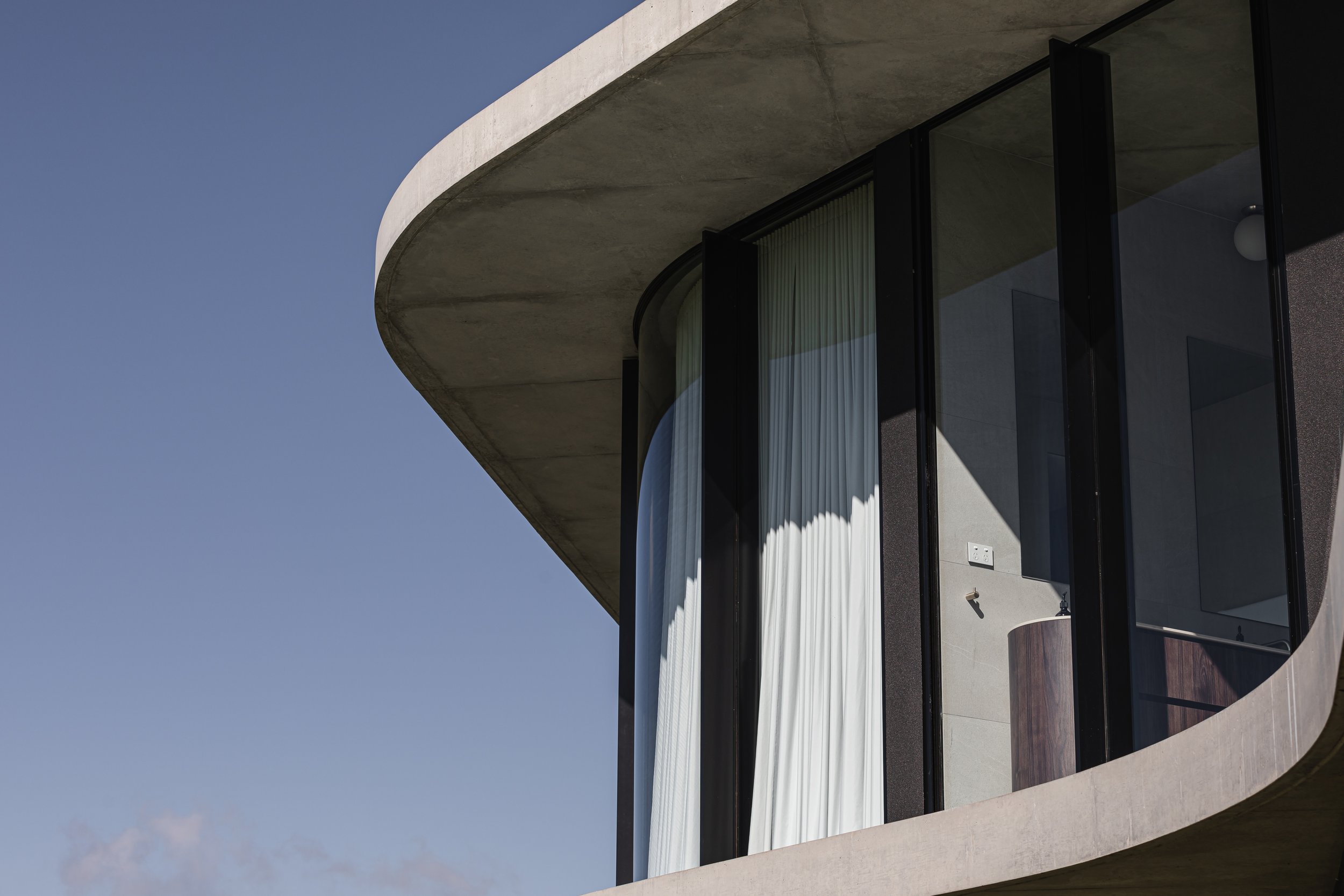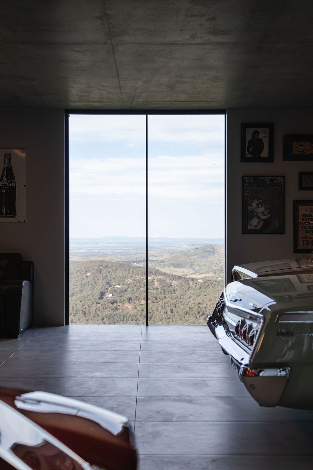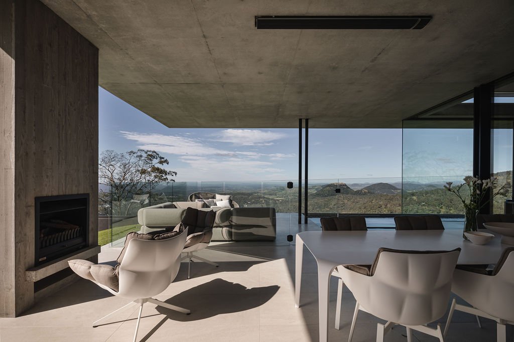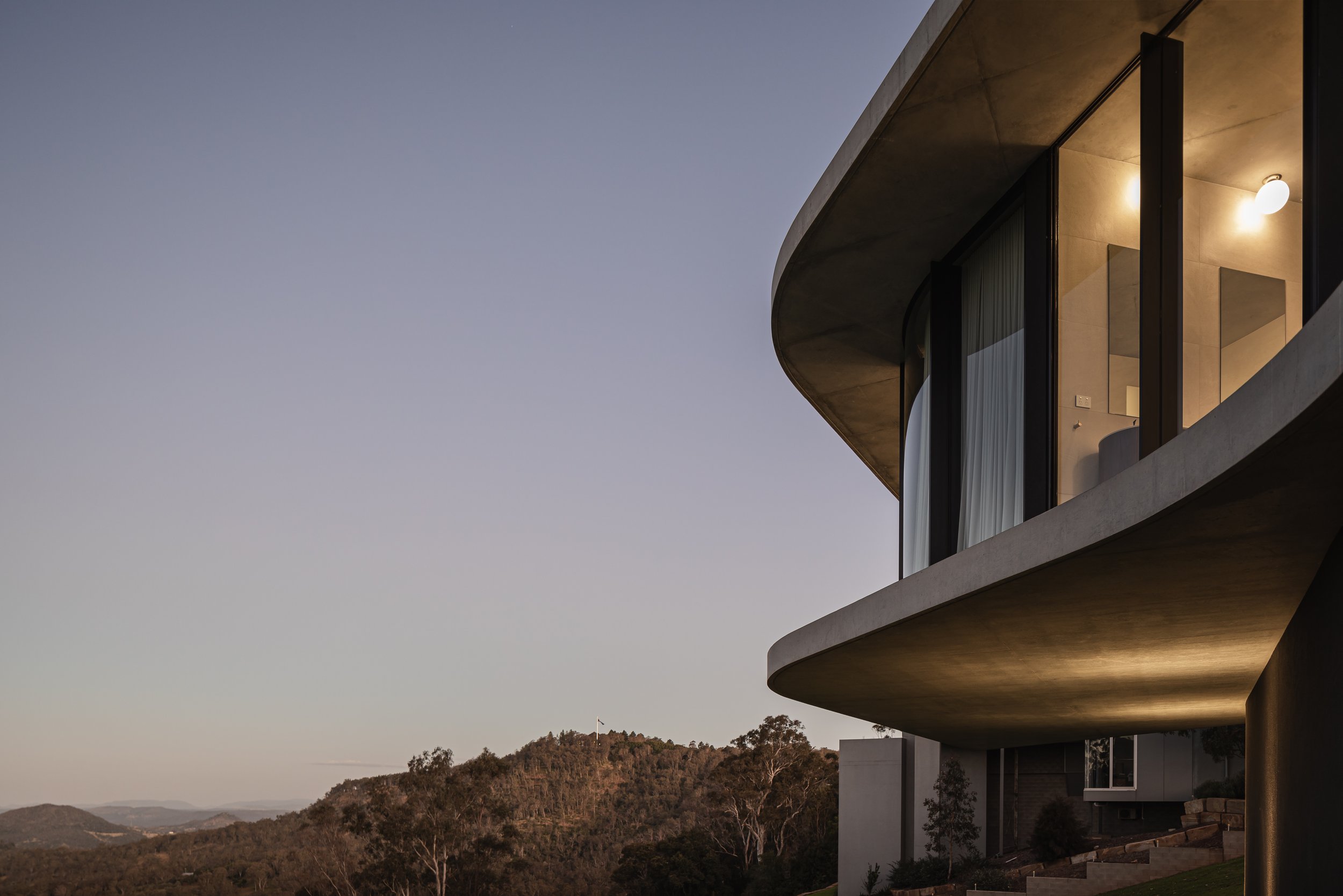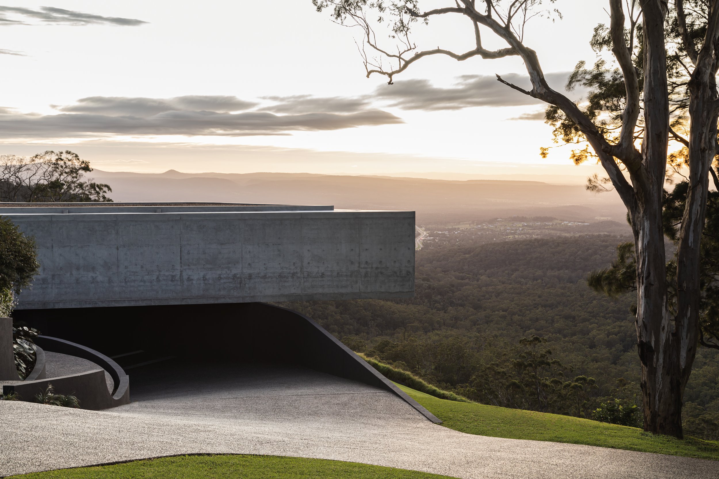 该设计采用令人印象深刻的 6.5 米混凝土悬臂和整个东立面的全高玻璃窗,从大分水岭山顶可以欣赏到全景。