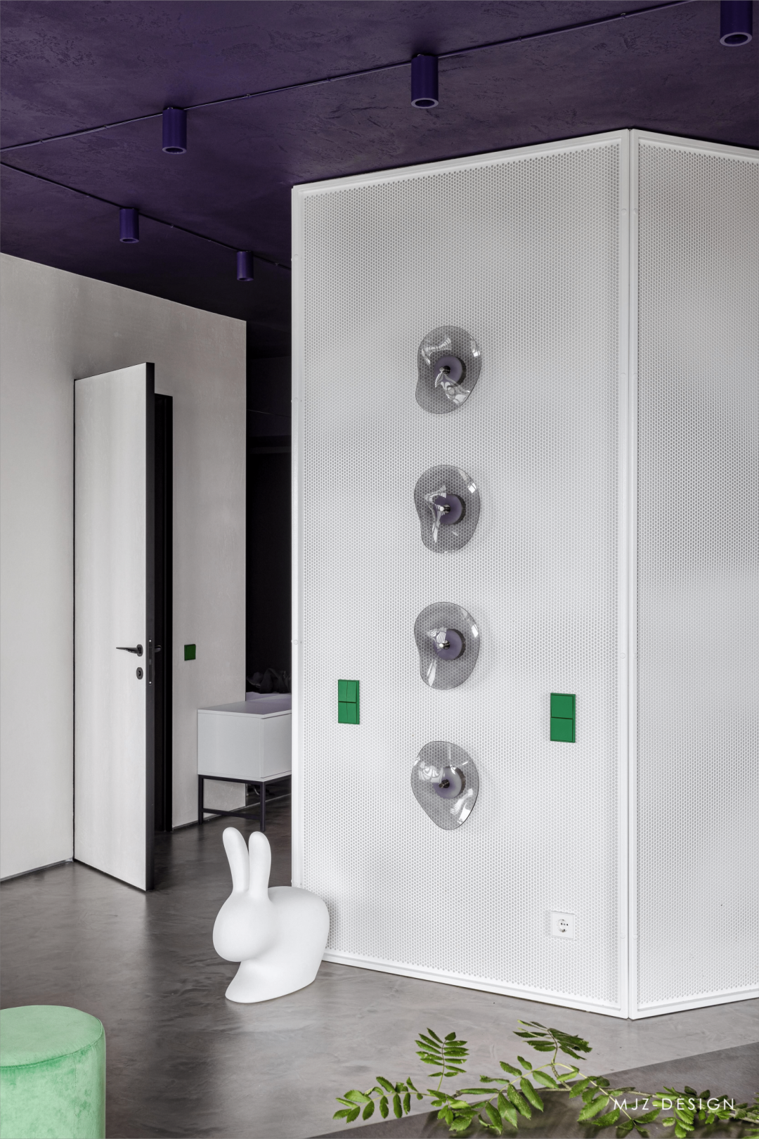 柔和的红色浴室是对《闪灵》个场景的致敬,而白色瓷器和紫色巨石的混合让人想起《发条橙》中著名的酒吧。当配色方案终确定后,设计师和客户开始开发橱柜家具。装饰强调了设计的讽刺性——Qeeboo 兔子椅和卡门旋转顶灯。