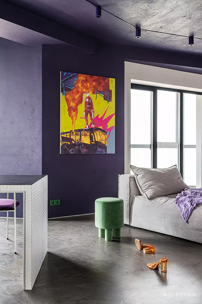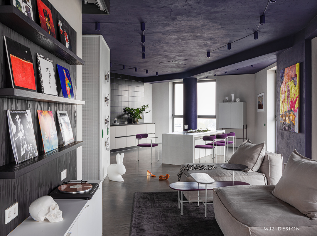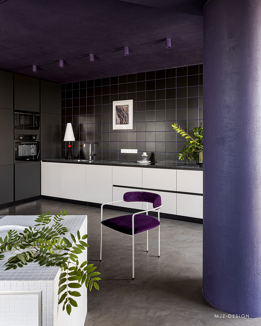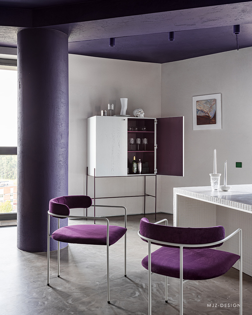 在入口处,迎接客人的是由模块化 MEXO 扶手椅和 Andrey Pichushkin 设计的帆布装饰组成的壮观组合。从这里您可以前往更衣室/洗衣房或客用卫生间。窗户附近有一套对比鲜明的厨房设备和一张巨大的桌子和紫色的椅子。他们的室内装饰的颜色也出现在公寓的天花板和白色瓷柜的内墙上。