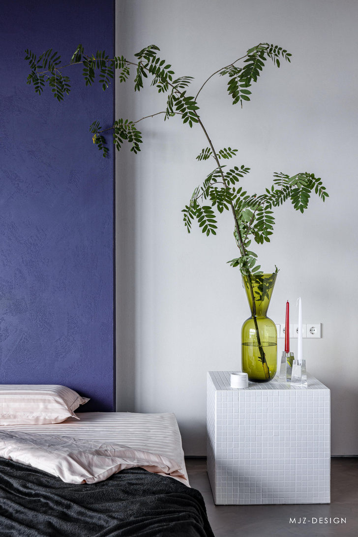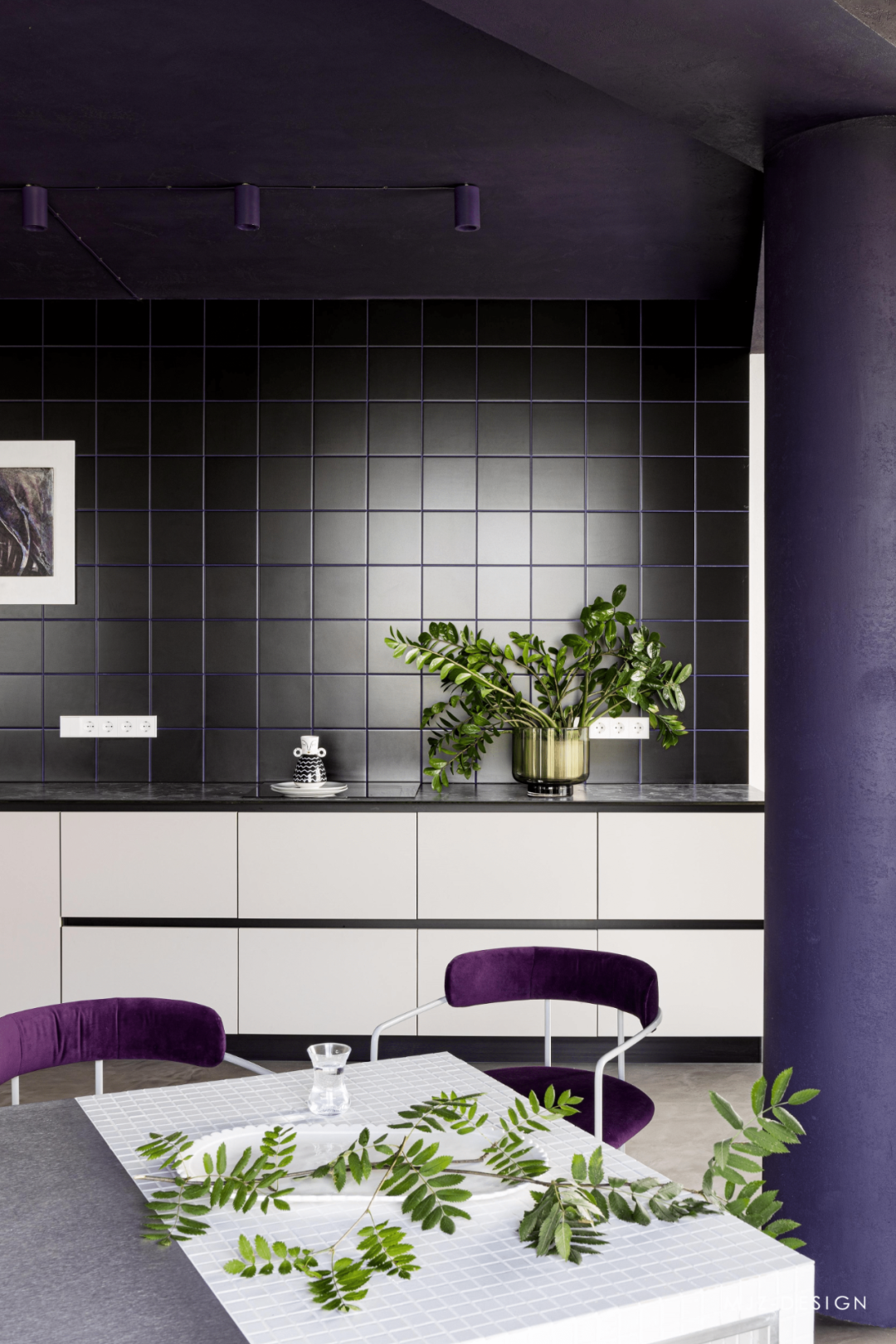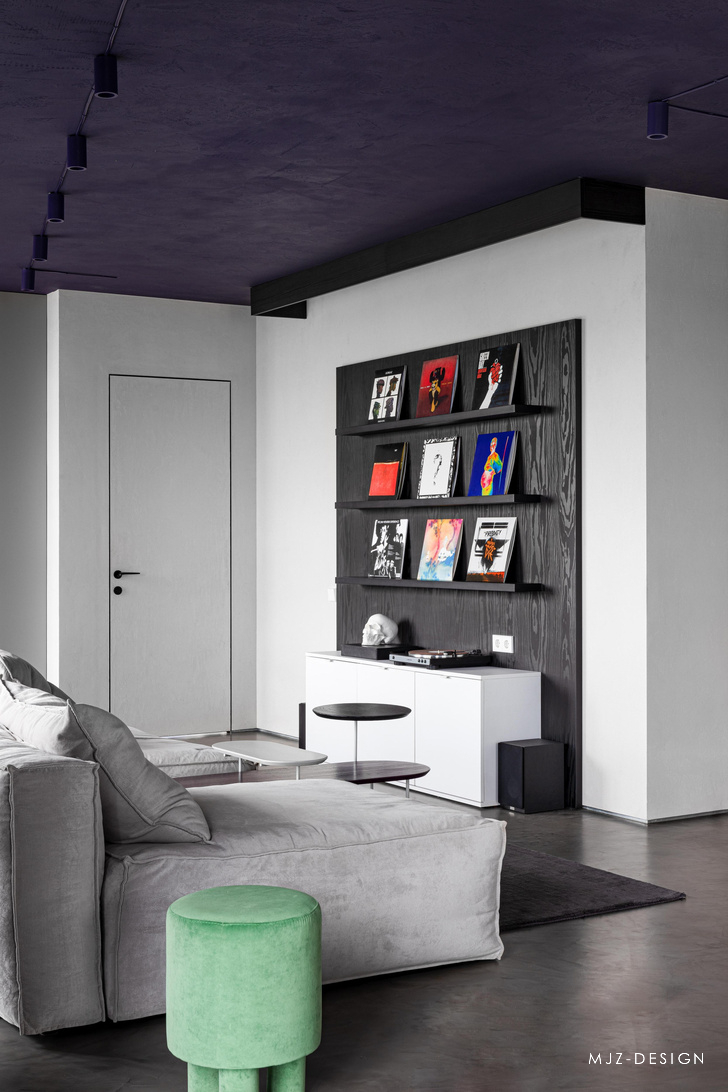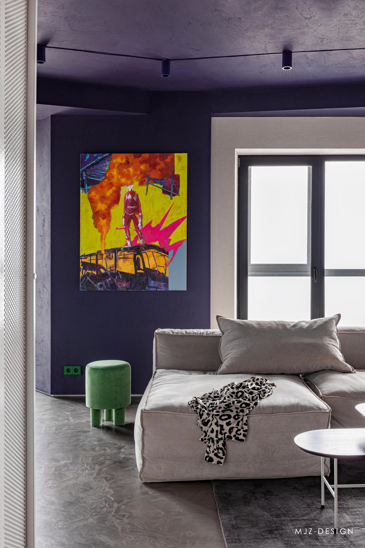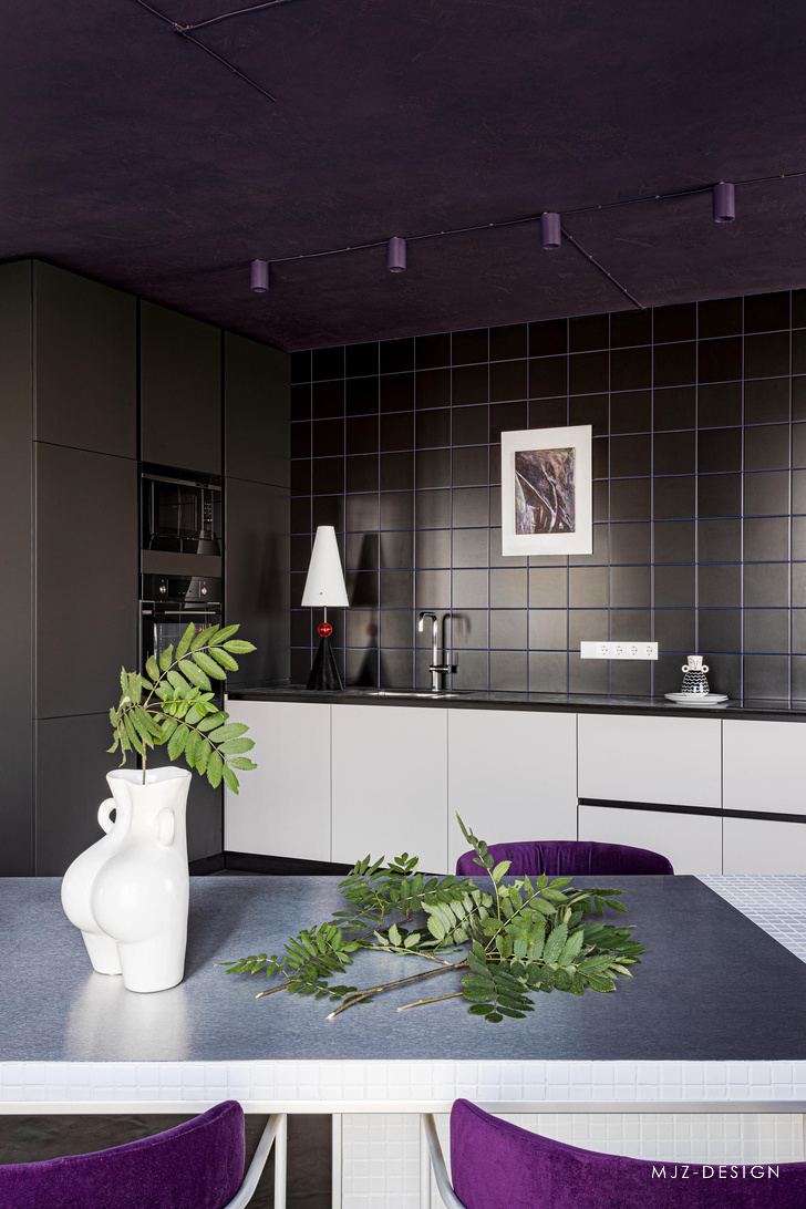 在入口处,迎接客人的是由模块化 MEXO 扶手椅和 Andrey Pichushkin 设计的帆布装饰组成的壮观组合。从这里您可以前往更衣室/洗衣房或客用卫生间。窗户附近有一套对比鲜明的厨房设备和一张巨大的桌子和紫色的椅子。他们的室内装饰的颜色也出现在公寓的天花板和白色瓷柜的内墙上。