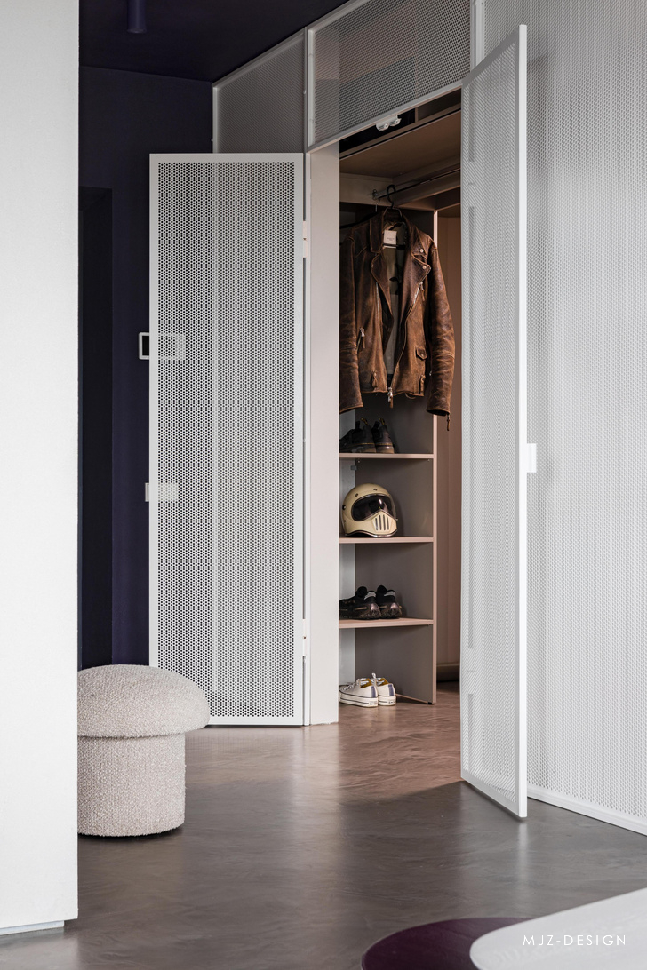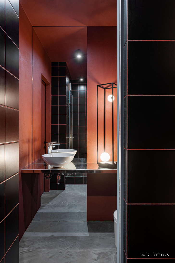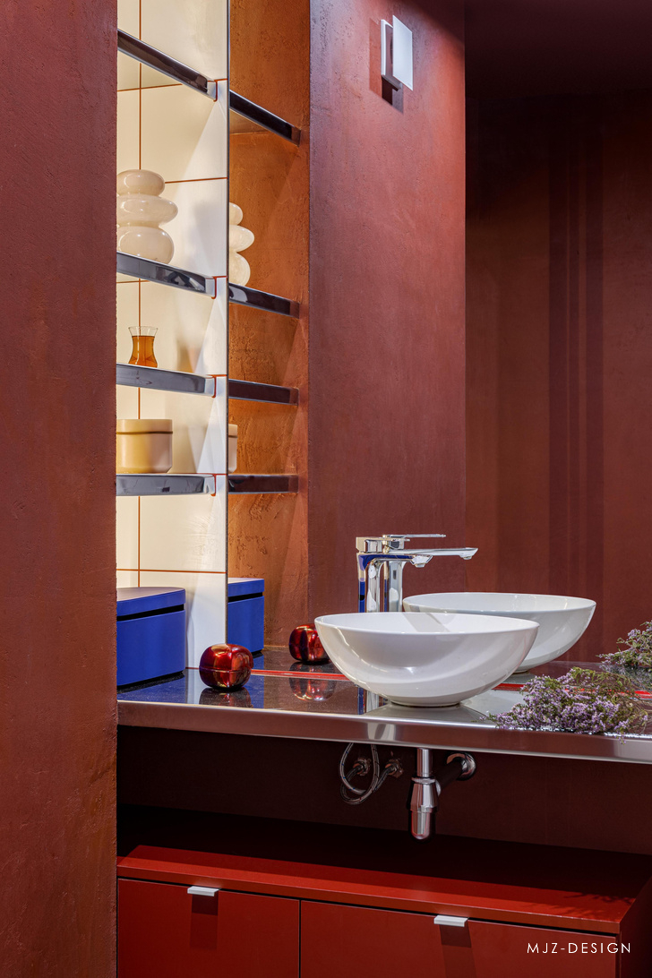 引人注目的勃艮第色调照亮了淋浴和浴室,而白色的穿孔则定义了储物布局。该项目中几乎所有的颜色都是基于斯坦利·库布里克的画作,他电影中的许多元素都通过塑料金属和石膏的棱镜重新诠释。