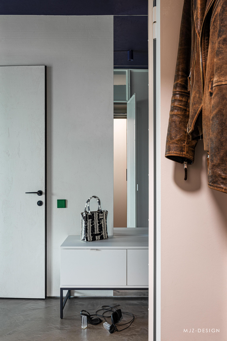 隐藏的门后面是主卧室,毗邻主人的更衣室。浴室与浴室之间由玻璃铰链隔断隔开 - 自然光透过隔断到达独立式浴缸。内部的特点是带有金属碎片的自流平环氧树脂地板以及浅色装饰石膏。