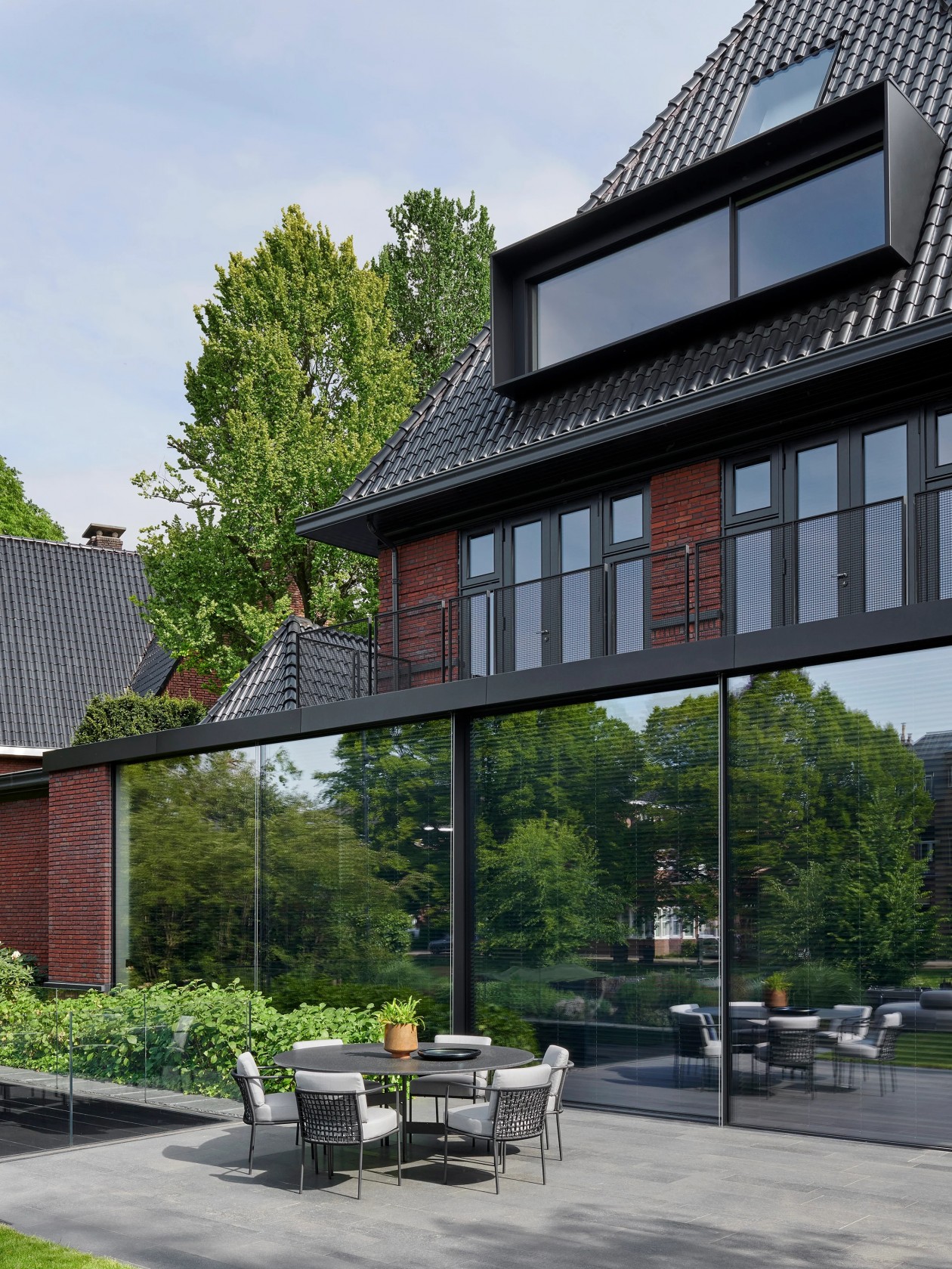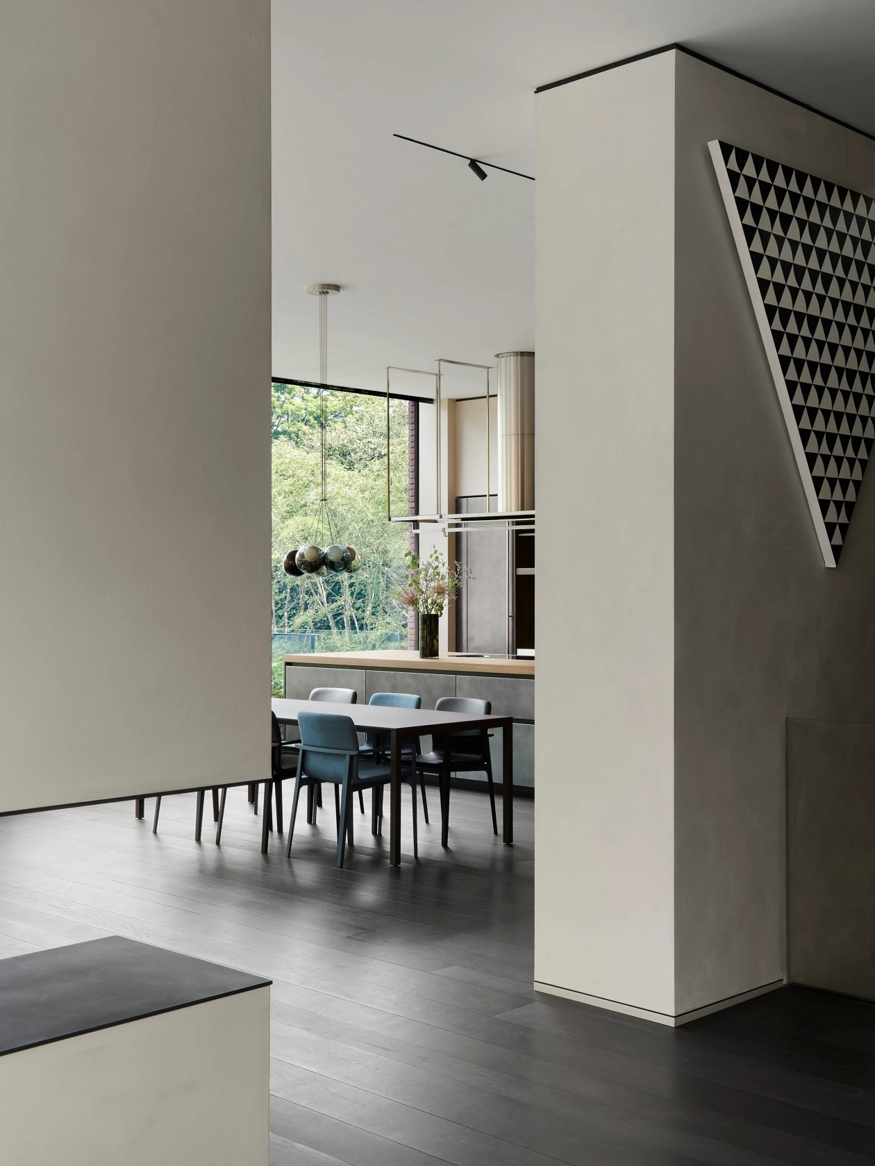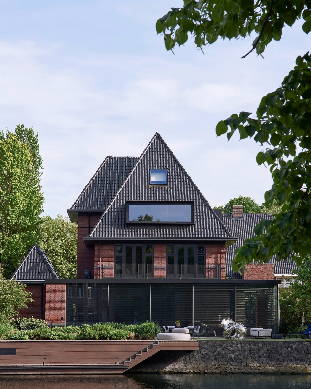荷兰私人住宅项目自1927年起融入北欧风,创新演绎传统复杂性,构筑古今交融的和谐对话。当代设计体现在斜顶的黑色金属箱体元素与北欧陡峭屋顶几何形态的对比中,引入光线并拓展景观视野。内部底层开放式布局配以壁炉、穿透五层的楼梯等实体核心,光线充盈空间,柔化深色调材质。中性色彩内饰搭配现代家具及艺术点缀,楼梯作为独立木质铁艺结构,展现楼层间层叠之美。