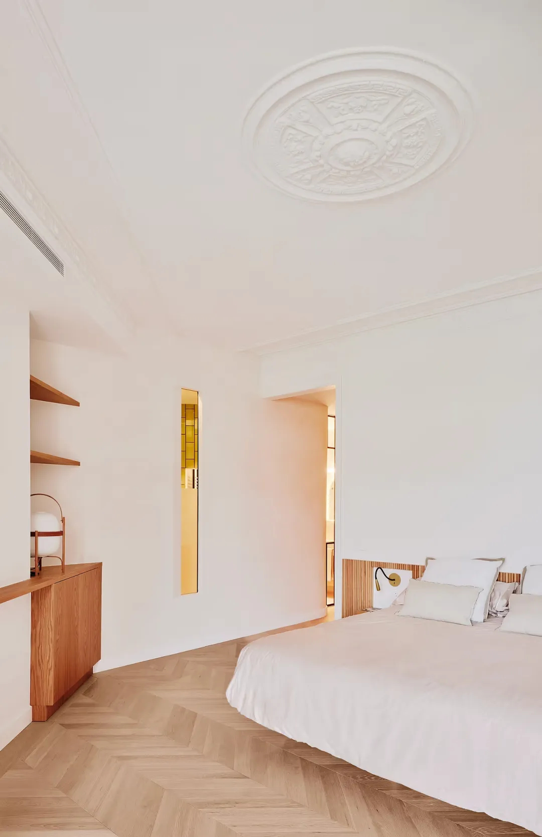 材质的运用是本次改造的点睛之笔,温暖连贯的木质、陶土与柔和色调贯穿全屋,自然衔接新旧元素,让空间在保留历史质感的同时,能够经受长久使用的考验。厨房通过三个新开的拱门与客餐厅相连,保留原有墙体厚度的同时,实现了视线的连续与谈话的流动,近四米的巨大岛台成为生活核心,兼具烹饪、休闲与社交功能,曾作为办公会议桌的旧桌子被重新利用为家庭聚餐的大餐桌。公寓中诸多百年前的构件被赋予新生:大理石洗手池入驻洗手间,回收马赛克瓷砖变身床头桌,旧门扇迁移至新位置适配新动线,石膏线脚则静默诉说着建筑的历史底蕴。围绕这些旧物,彩色玻璃窗、圆柱形淋浴间与吧台柜以棕、褐、白的协调色调呼应,让整体空间语言连贯且富有触感。