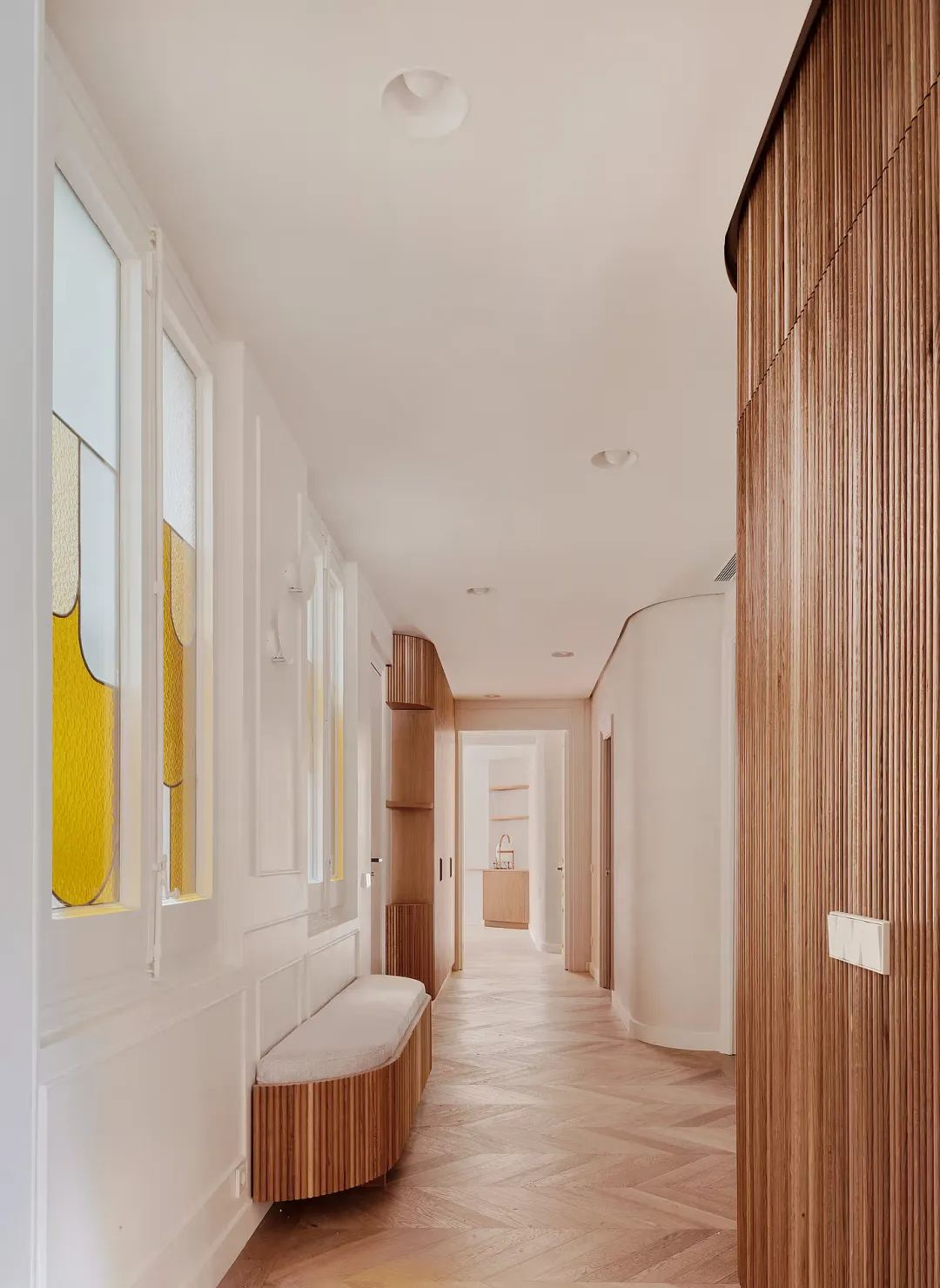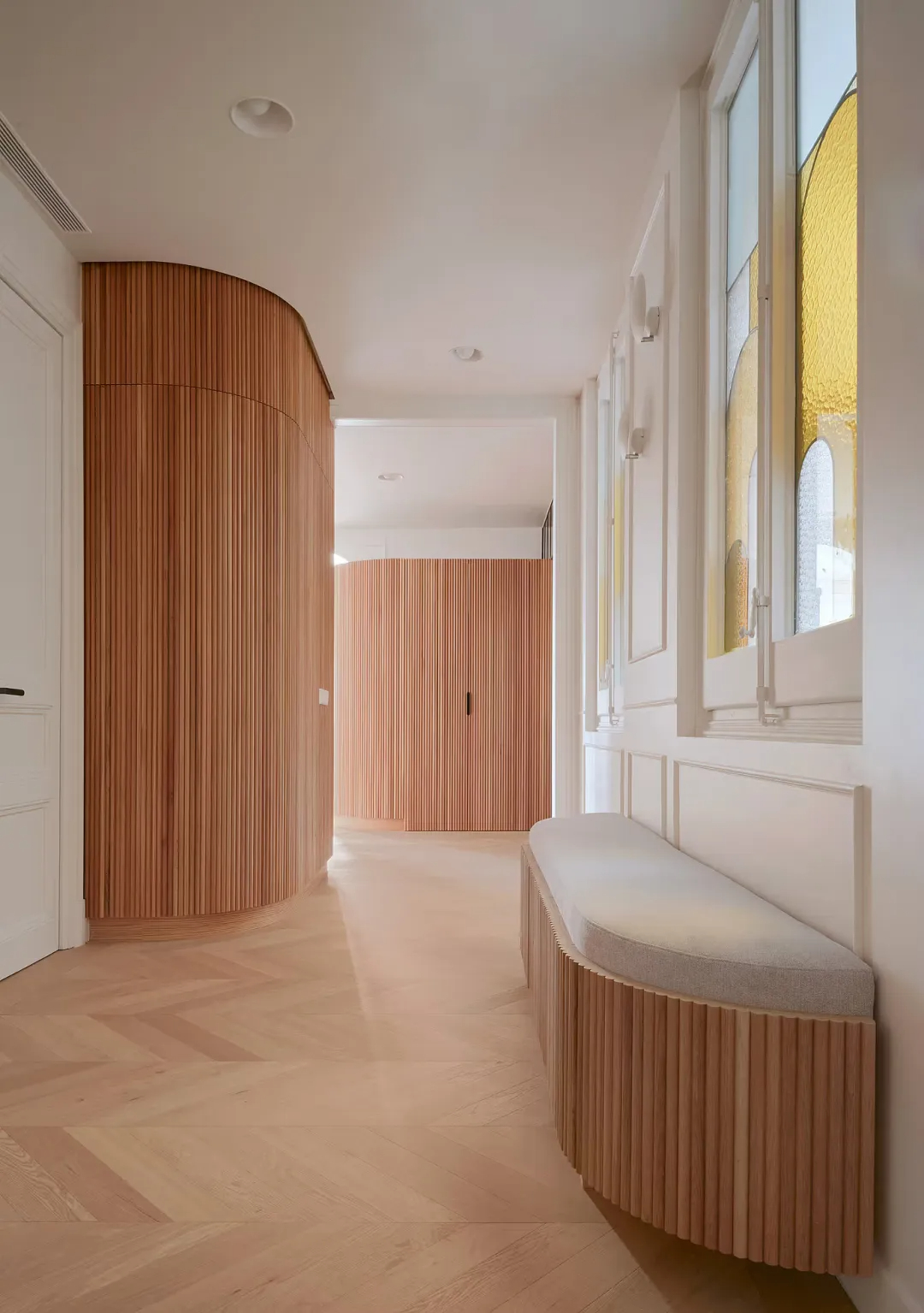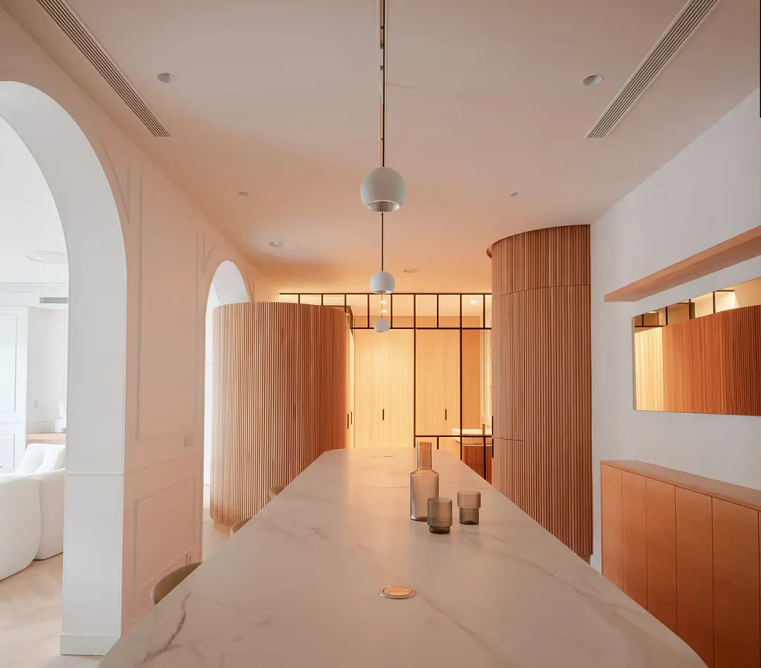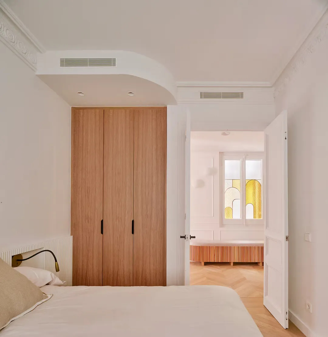 改造遵循建筑本身的空间逻辑,将面向加泰罗尼亚大道的区域打造为开阔通透的社交区,与背向内庭院的静谧卧室区形成鲜明而和谐的对望。一条贯穿整个平面的柔性设计线索成为空间的灵魂,原本僵硬的承重墙被转化为灵动的橡木曲线,巧妙隐藏了储物空间、设备管线与行走路线,在不同区域化身长凳、淋浴间或吧台柜,外层包裹着木条、陶土漆与手工瓷砖,随光线变化呈现出细腻的空间节奏感,温柔调和了街道的活力与庭院的静谧。空间布局清晰合理,主卧坐落于面向花园的一端,享有安静私密的氛围;儿童双人卧室位于中央,与共用浴室、小型卫生间及厨房便捷相连;洗衣房与设备间则隐藏在磨砂玻璃与橡木墙面之后,既保持了日常使用的便捷性,又让空间远离杂乱。