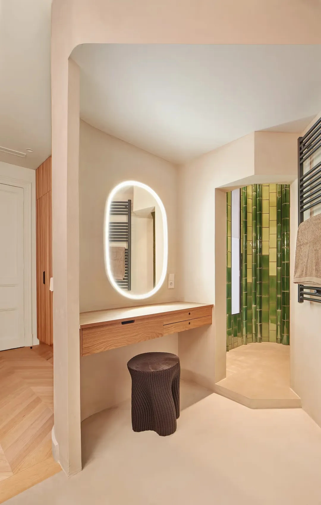 光线沿着空间长轴从街道向庭院自然流动,依次照亮木纹、釉面与玻璃,使每个房间的温度随时间悄然变化。公寓保留了传统的房间组织方式,却通过材质的融合与家具的巧思,让整体氛围变得柔和而连续。随着这家人从 “偶尔到访” 逐渐过渡到 “长期定居”,这里的每一处表面都将如同那些被珍视的旧物一般,在时光的沉淀中愈发温润,成为承载家庭记忆的理想居所。