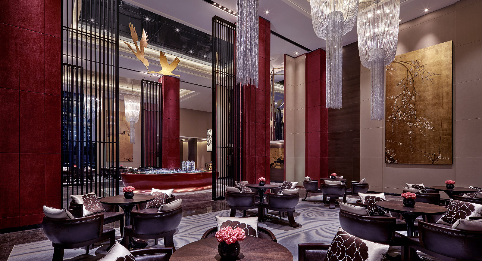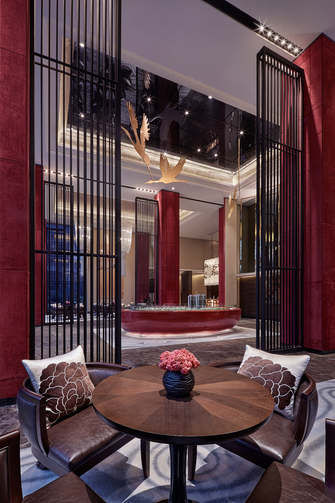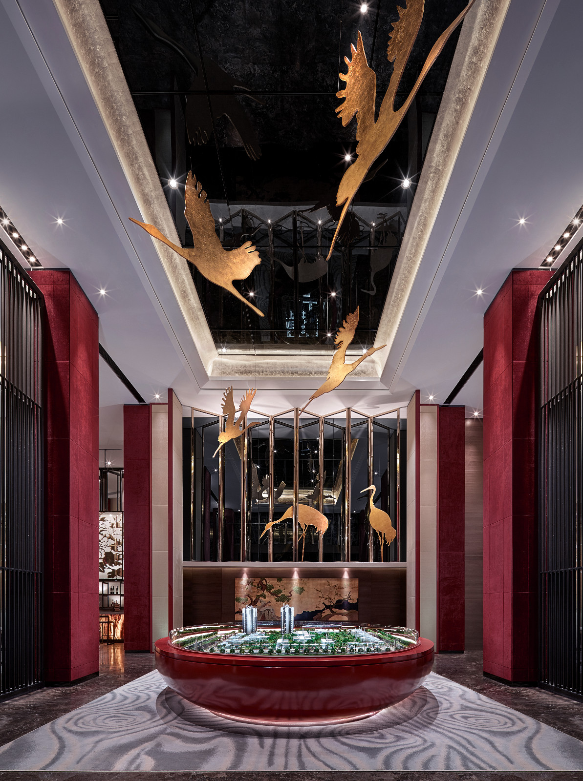 本案呼应楼盘中式文化主题定位.以现代手法辅以中华元素,选择“中华天宫”作为销售中心的设计原形,利用空间层高优势,通过屏风,云纹地毯,鹤,满月等元素,营造南天门地下为云,天上有天的空间感原创3d模型下 载