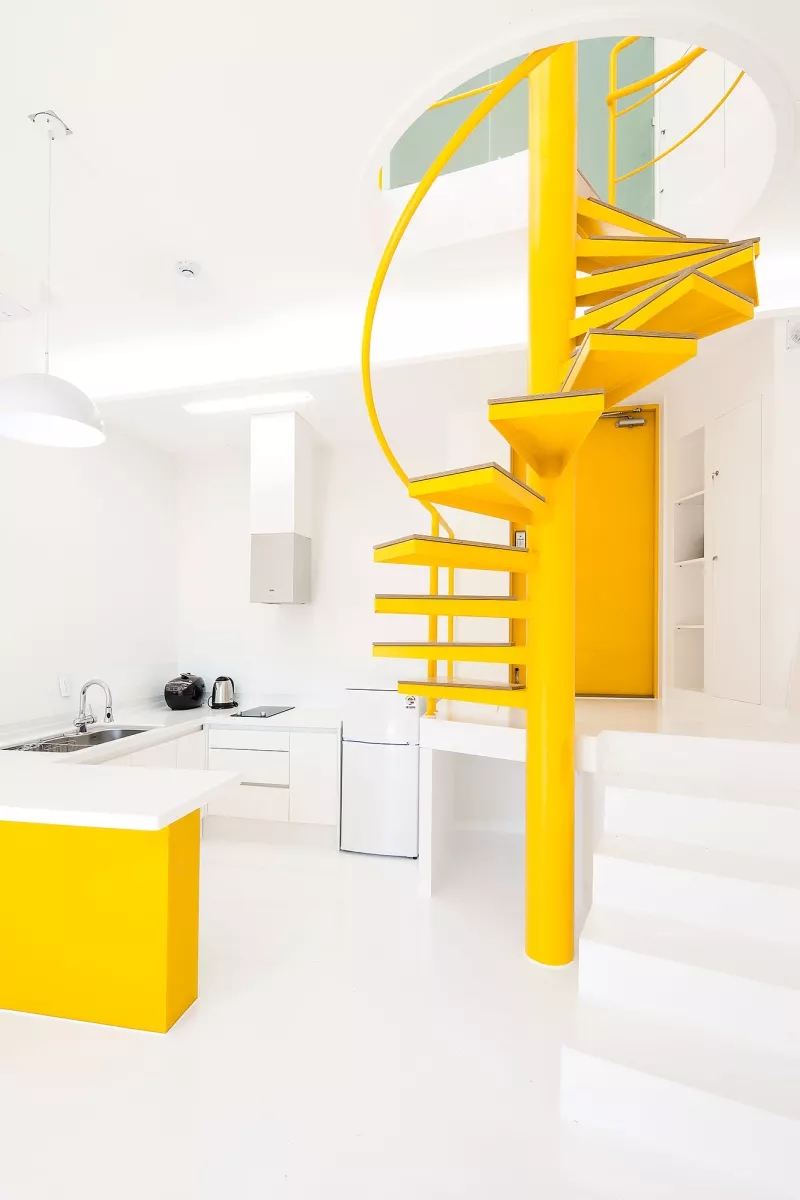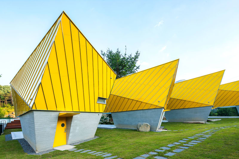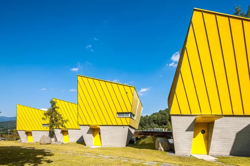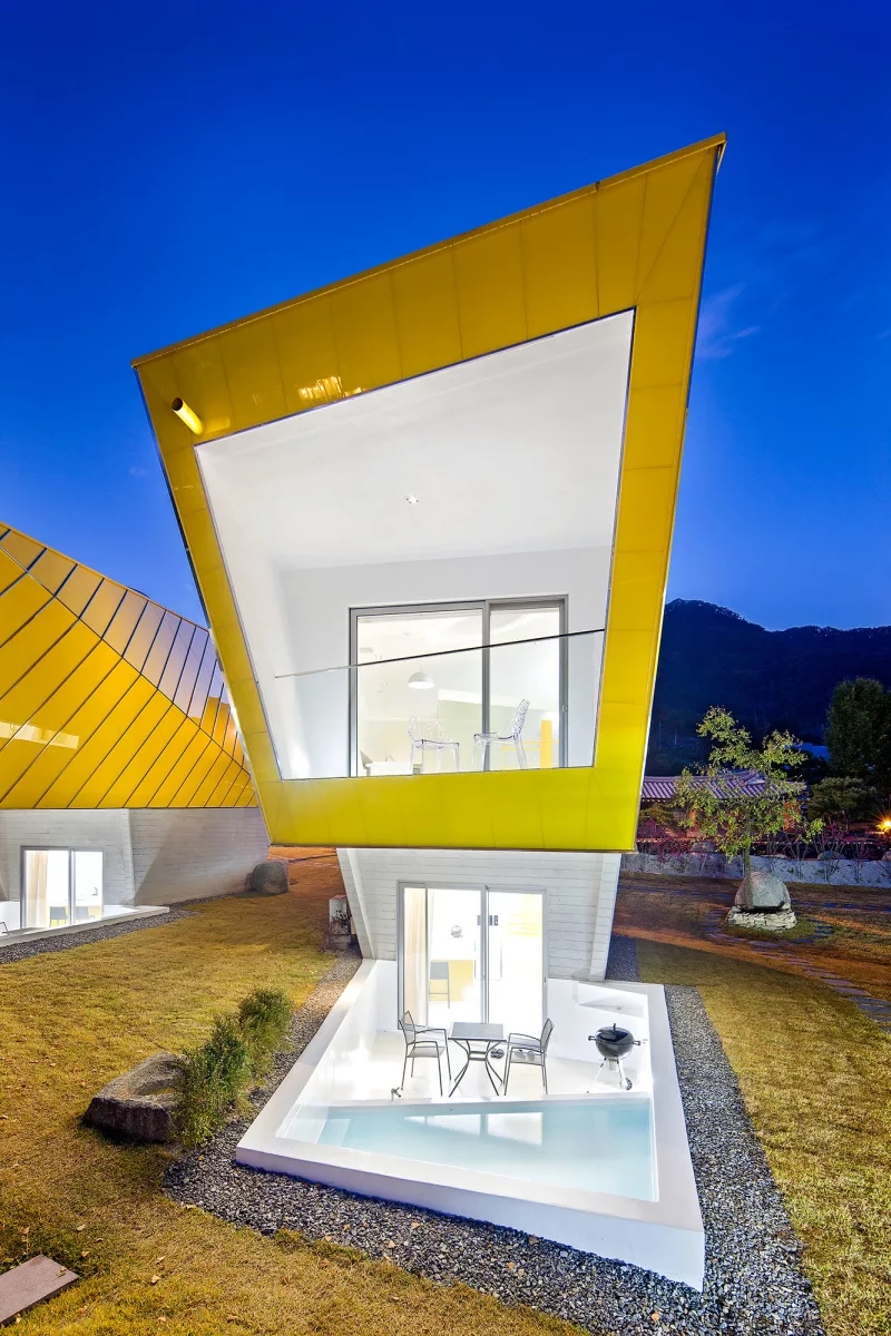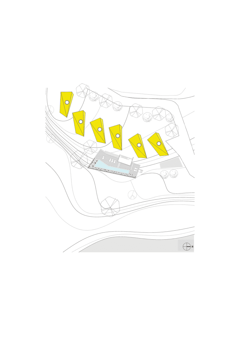 建筑内设有咖啡馆与顶层游泳池,作为分割区域的基座建筑。这六个形状奇异的度假屋坐落于基座建筑之上,与倾斜的地形贴合,度假屋看起来就像是智利复活节岛上神秘的石像,有着返璞归真的感觉。建筑外表皮采用了黄色,与周边的自然色彩形成鲜明对比。而不规则的内部空间采用了纯白色,以最大限度提升室内亮度。
