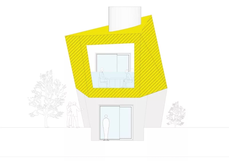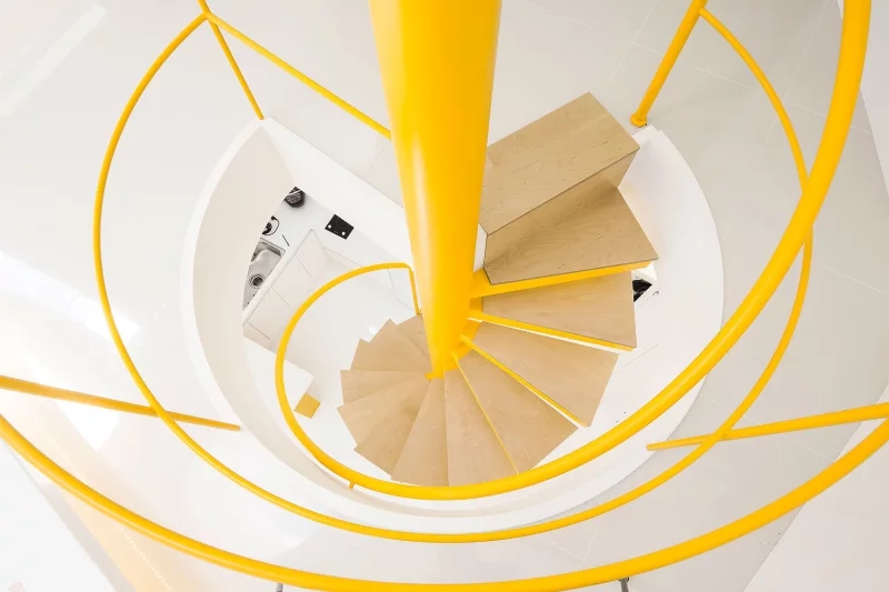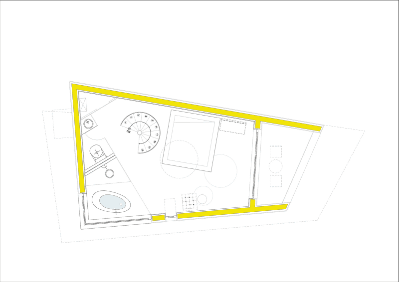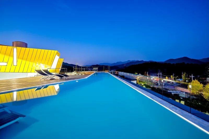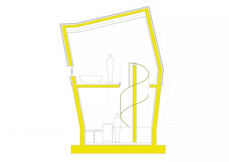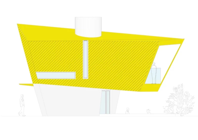 建筑内设有咖啡馆与顶层游泳池,作为分割区域的基座建筑。这六个形状奇异的度假屋坐落于基座建筑之上,与倾斜的地形贴合,度假屋看起来就像是智利复活节岛上神秘的石像,有着返璞归真的感觉。建筑外表皮采用了黄色,与周边的自然色彩形成鲜明对比。而不规则的内部空间采用了纯白色,以最大限度提升室内亮度。