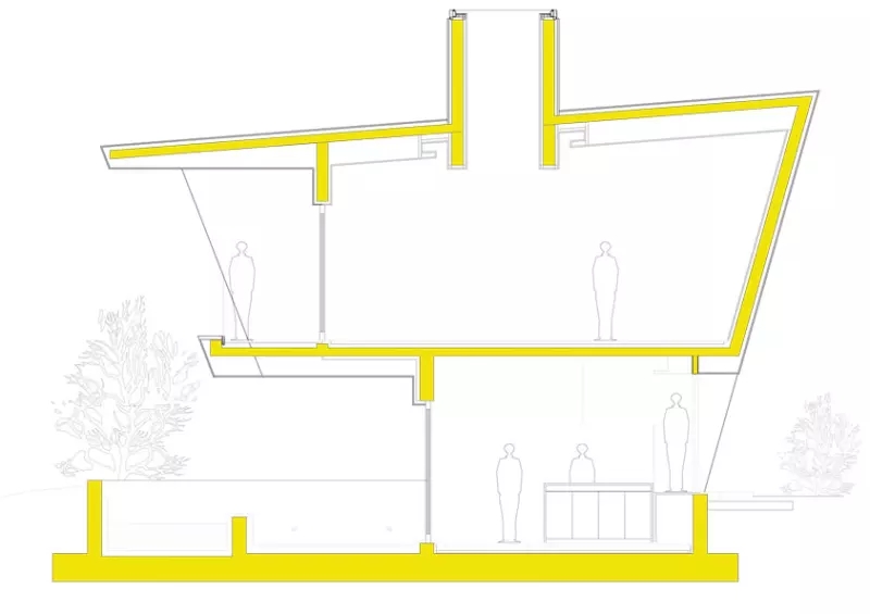 在这3000多平方米的基地上有10米的高差。为了合理利用这个斜坡,设计师将一个水平的建筑体块安置在基地核心区。