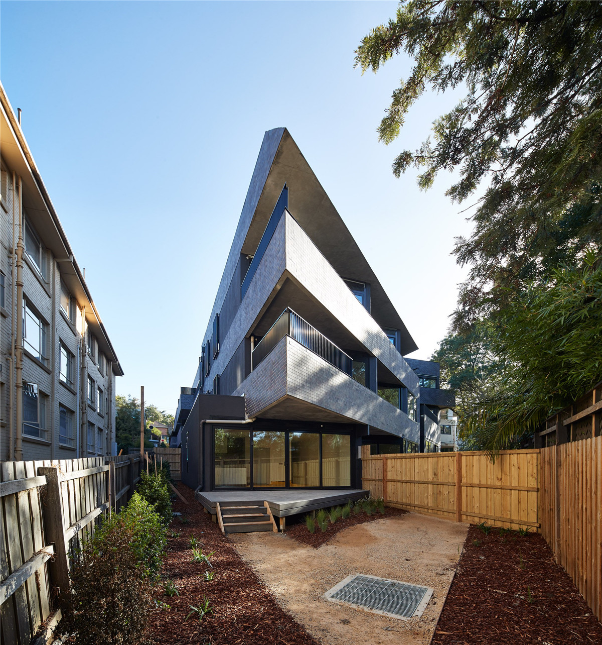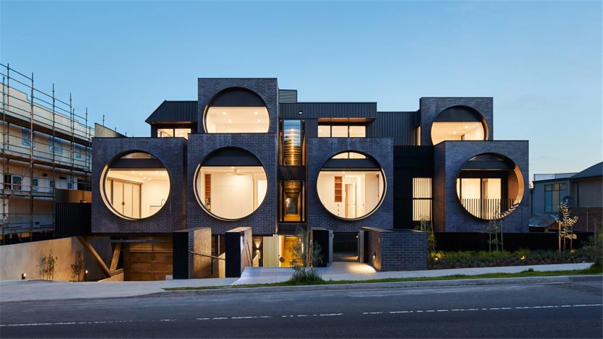 在艾凡赫东部的墨尔本郊区,由澳大利亚BKK建筑事务所设计的这座公寓楼十分显眼。该建筑由几个错落堆叠的体量构成,并且每个体块上都有一个巨大的圆形舷窗