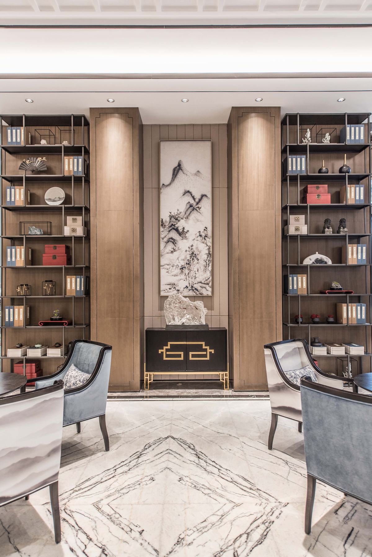 洽谈区域两边的超高黑色拉丝不锈钢书架,给人一种徜徉书海的宁静,仿佛释放回归空间的天性,置身其中感受不一样的气质。书柜展示架上你会看到一些线装书、黄铜锻打的托盘摆件,枯山水小摆件以及小小的景泰蓝掐丝珐琅工艺的装饰盒与中式元素摆件,那是我们企图在与空间建立视觉上、审美习惯上的链接。