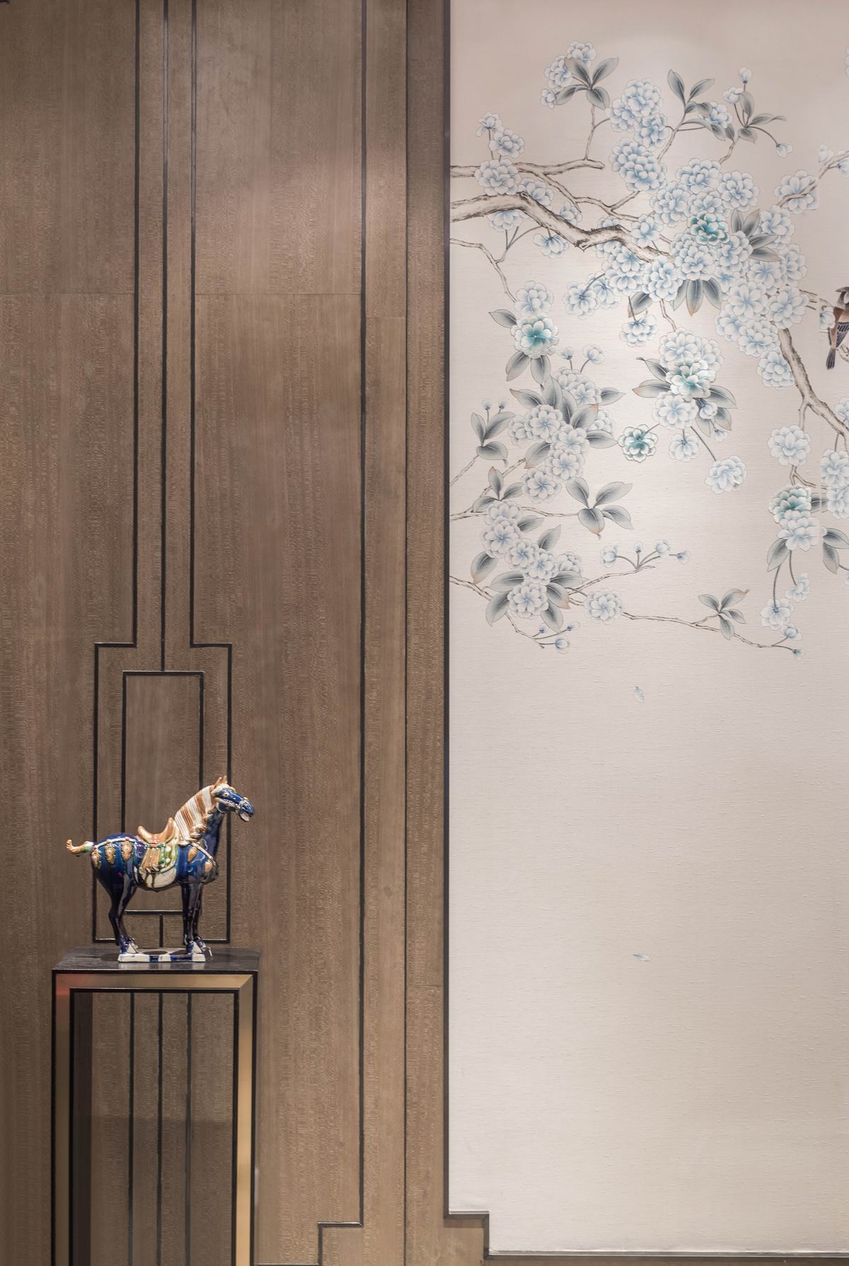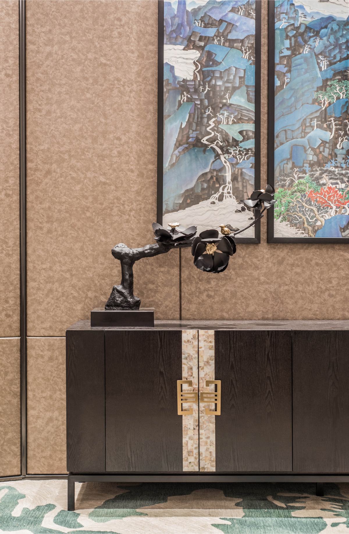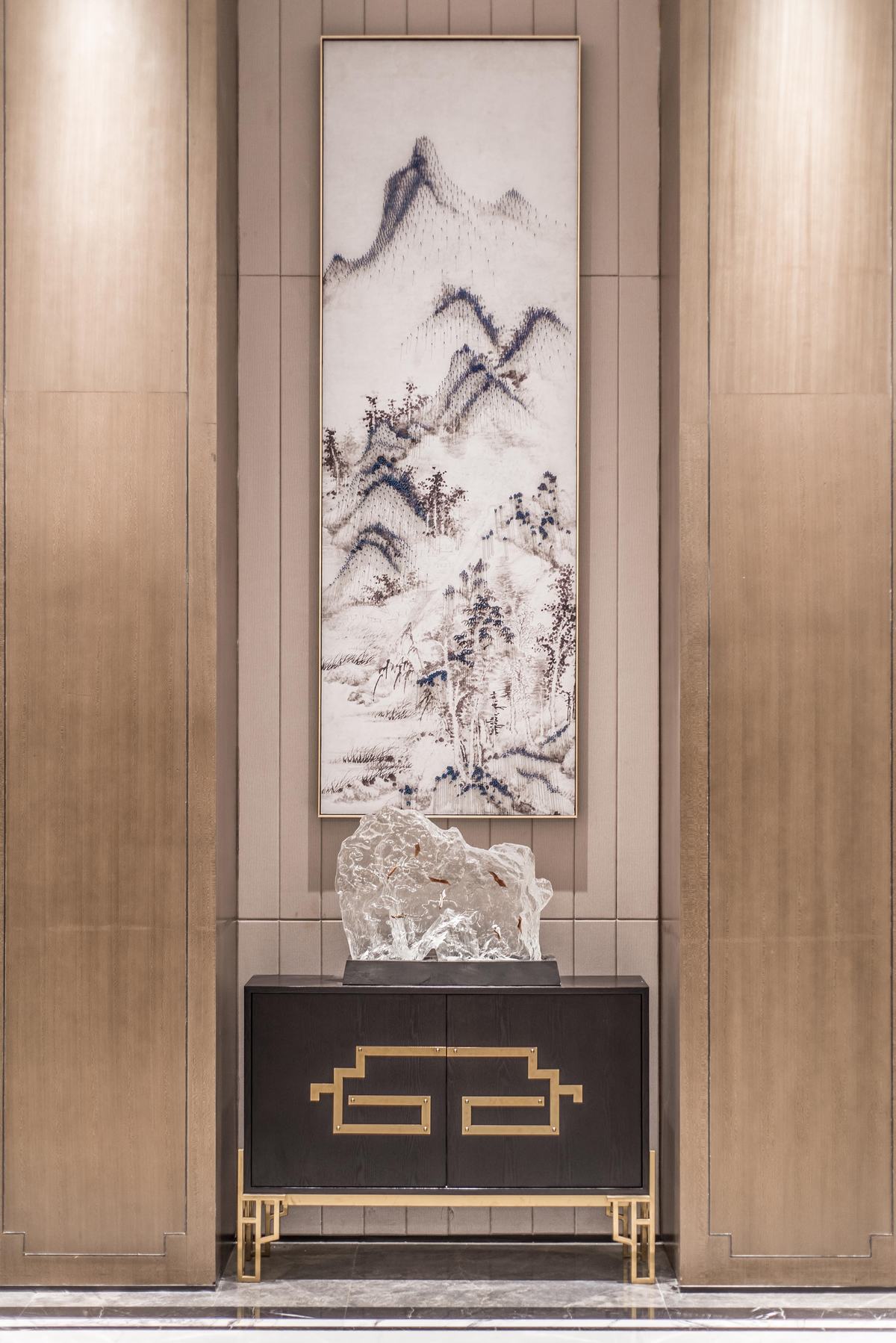 移步移景,在书柜中间的玄关上巨幅名家水墨山水画用现代的装置手法来展现。具有琥珀石般晶莹剔透效果的山形晶石摆件,希望能把时间这个概念在这个空间中定格下来,形成丰富的空间层次感及现代感。