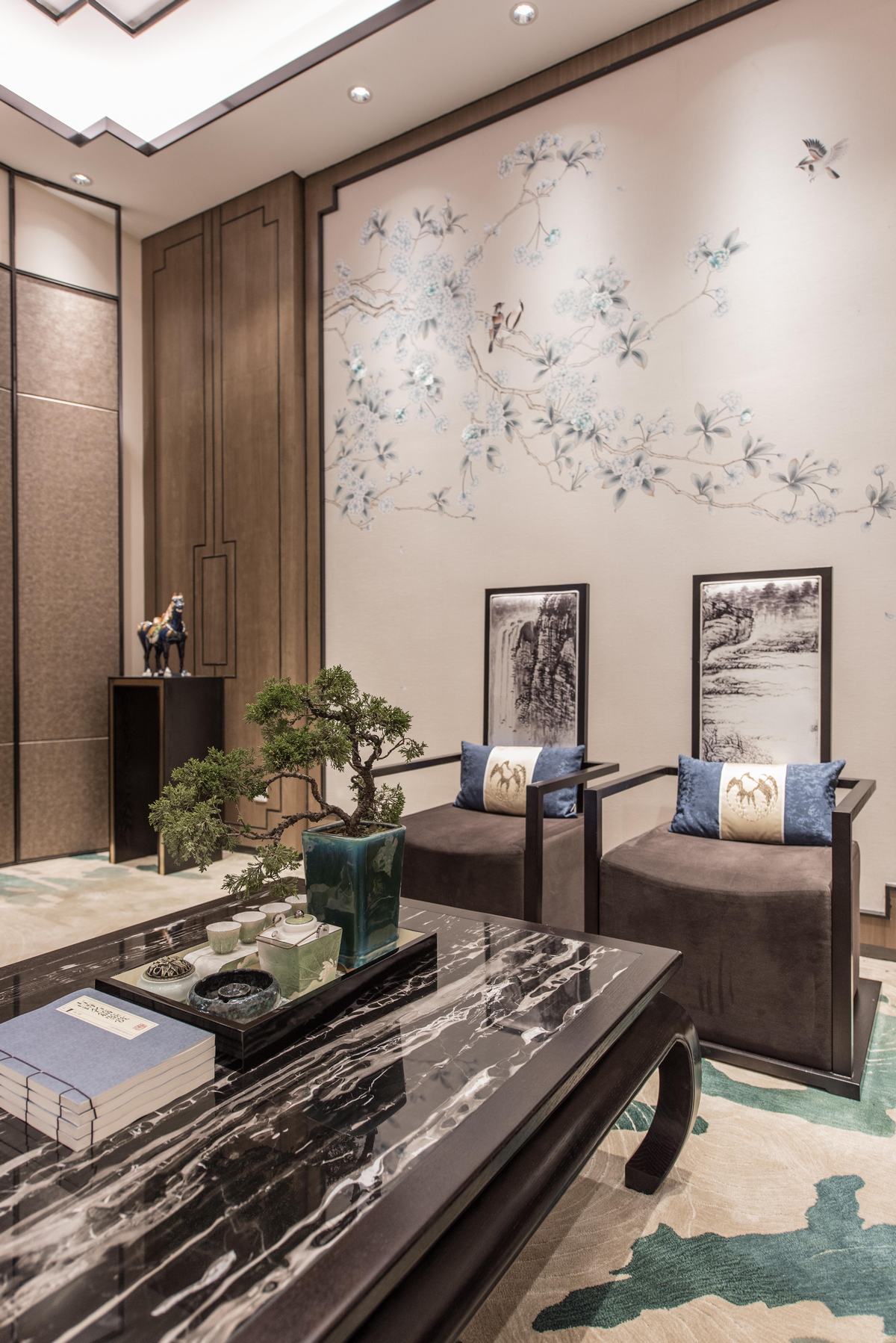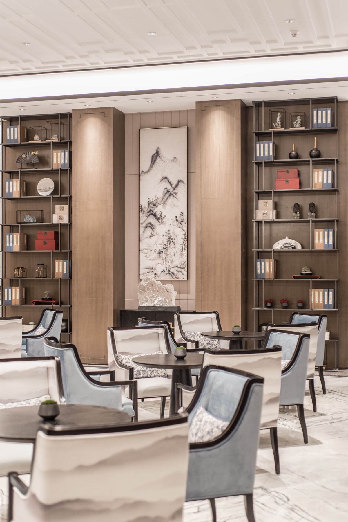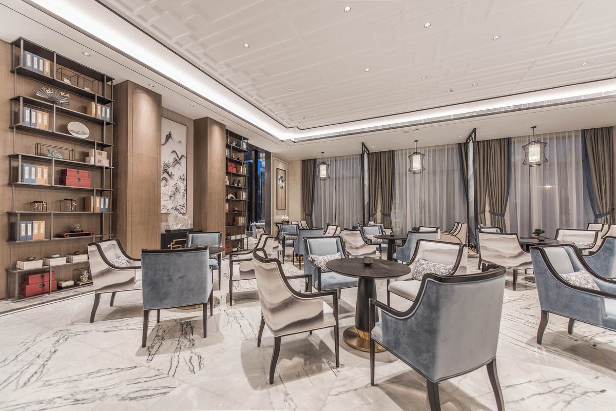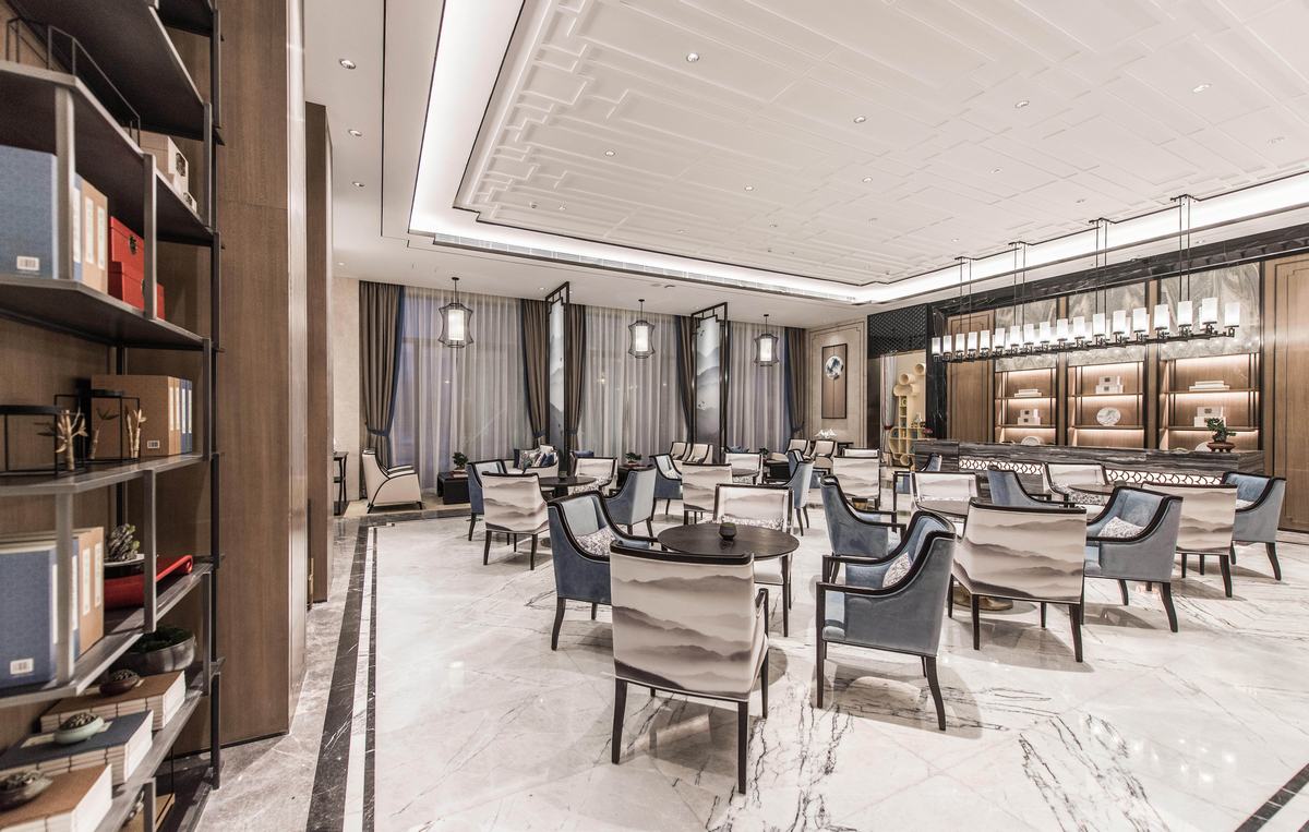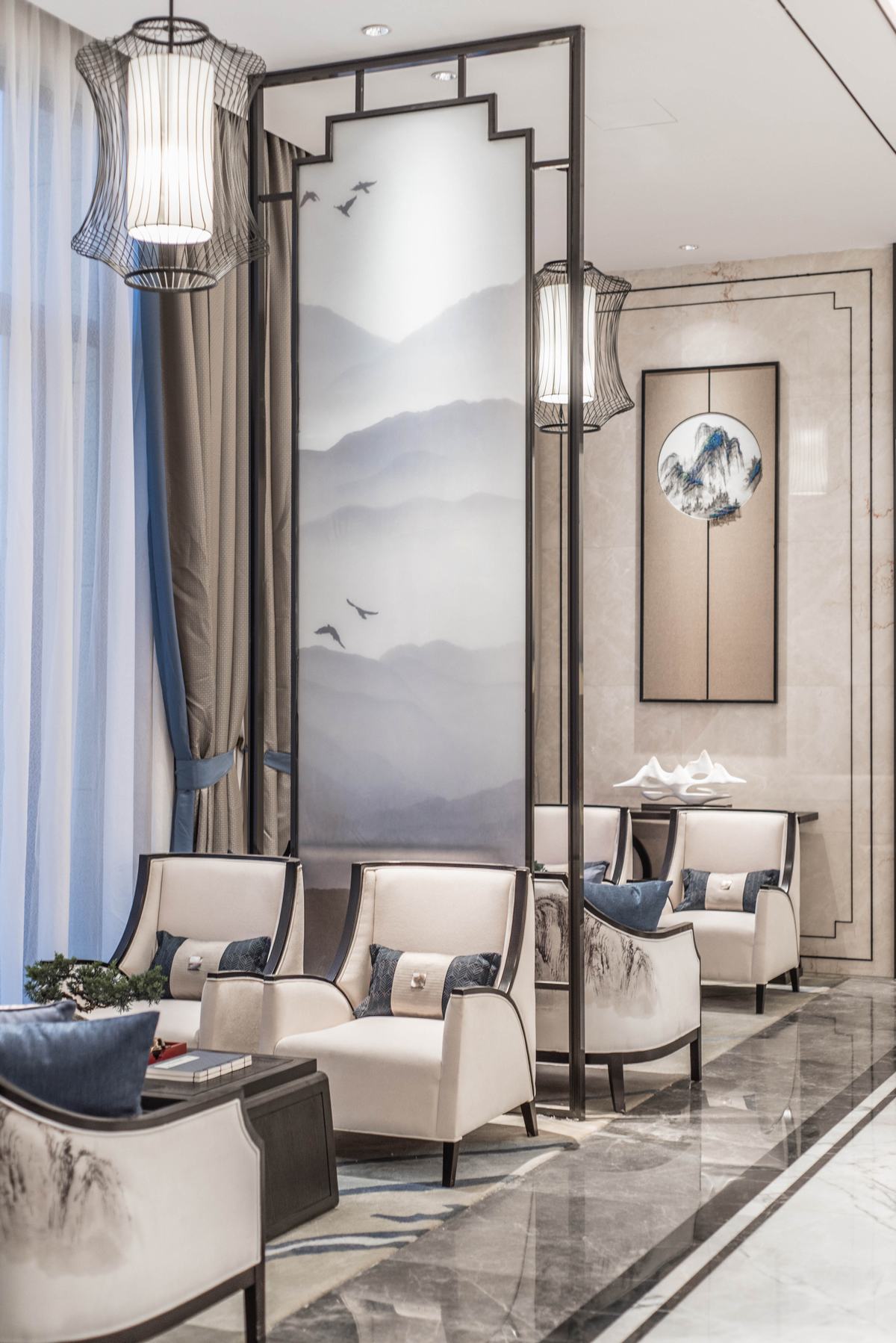 而洽谈区蓝白相间的洽谈椅灵感来源于这座城市被低山丘陵包围独特的地貌,高级定制的水墨山纹与面料与水墨蓝的净色面料相搭配,意在营造一个蓝天白云,好山好水的中式闲适意境空间,给人一种山水景色的带入感。