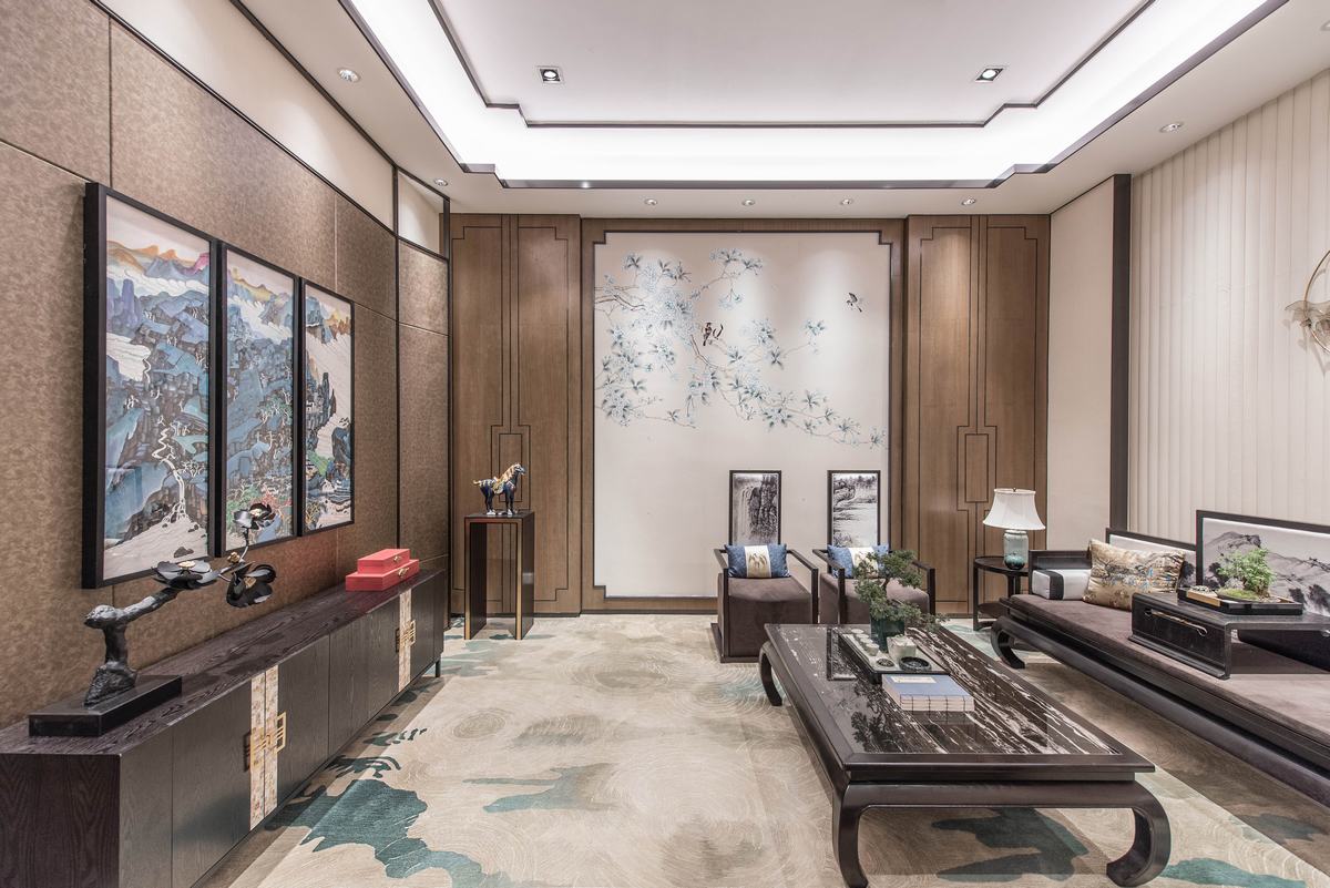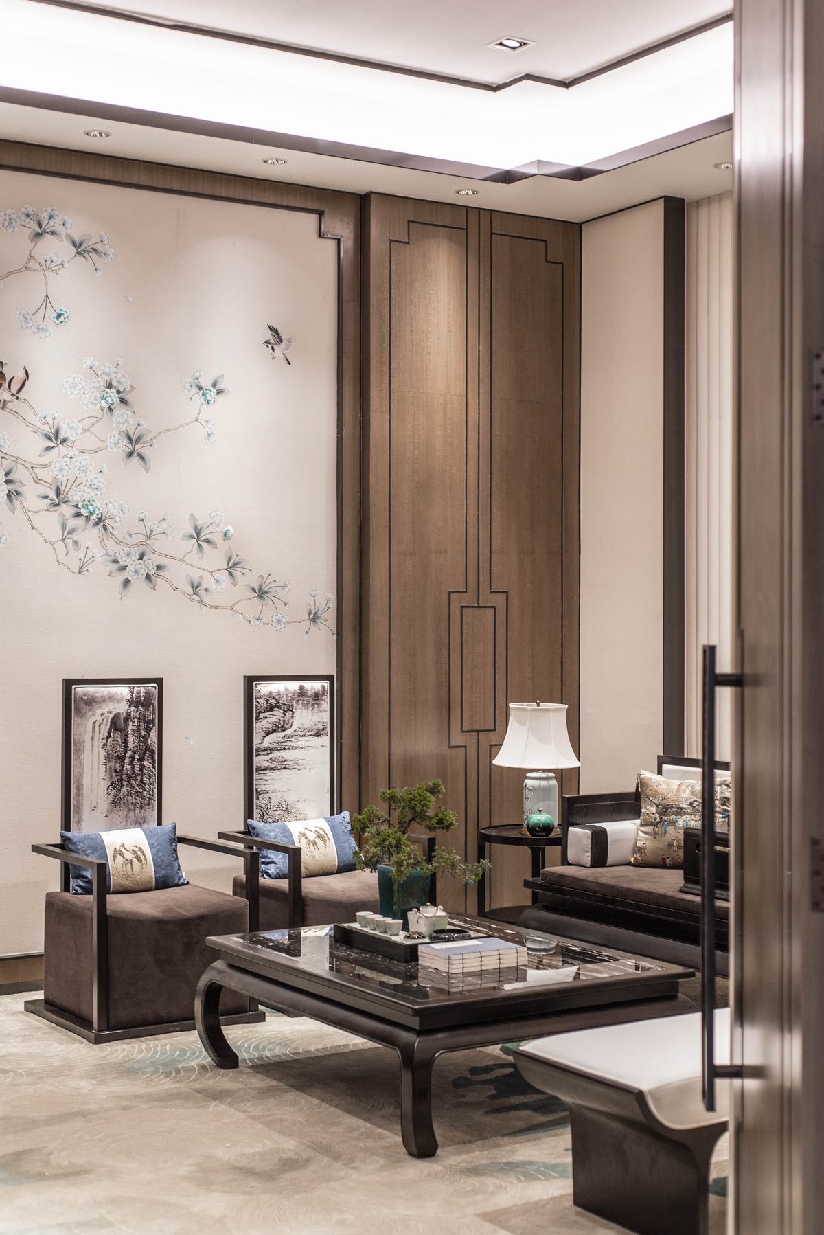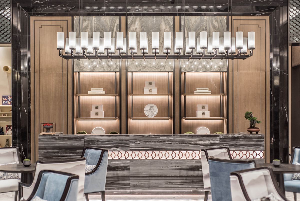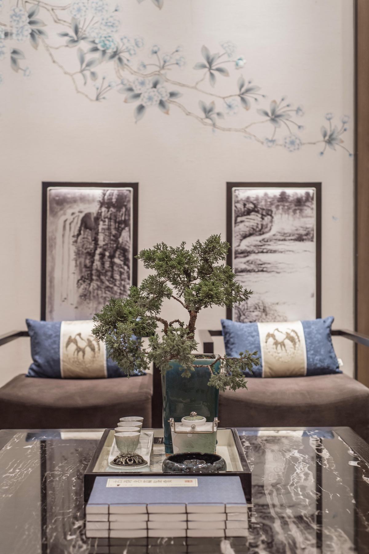 而洽谈区蓝白相间的洽谈椅灵感来源于这座城市被低山丘陵包围独特的地貌,高级定制的水墨山纹与面料与水墨蓝的净色面料相搭配,意在营造一个蓝天白云,好山好水的中式闲适意境空间,给人一种山水景色的带入感。