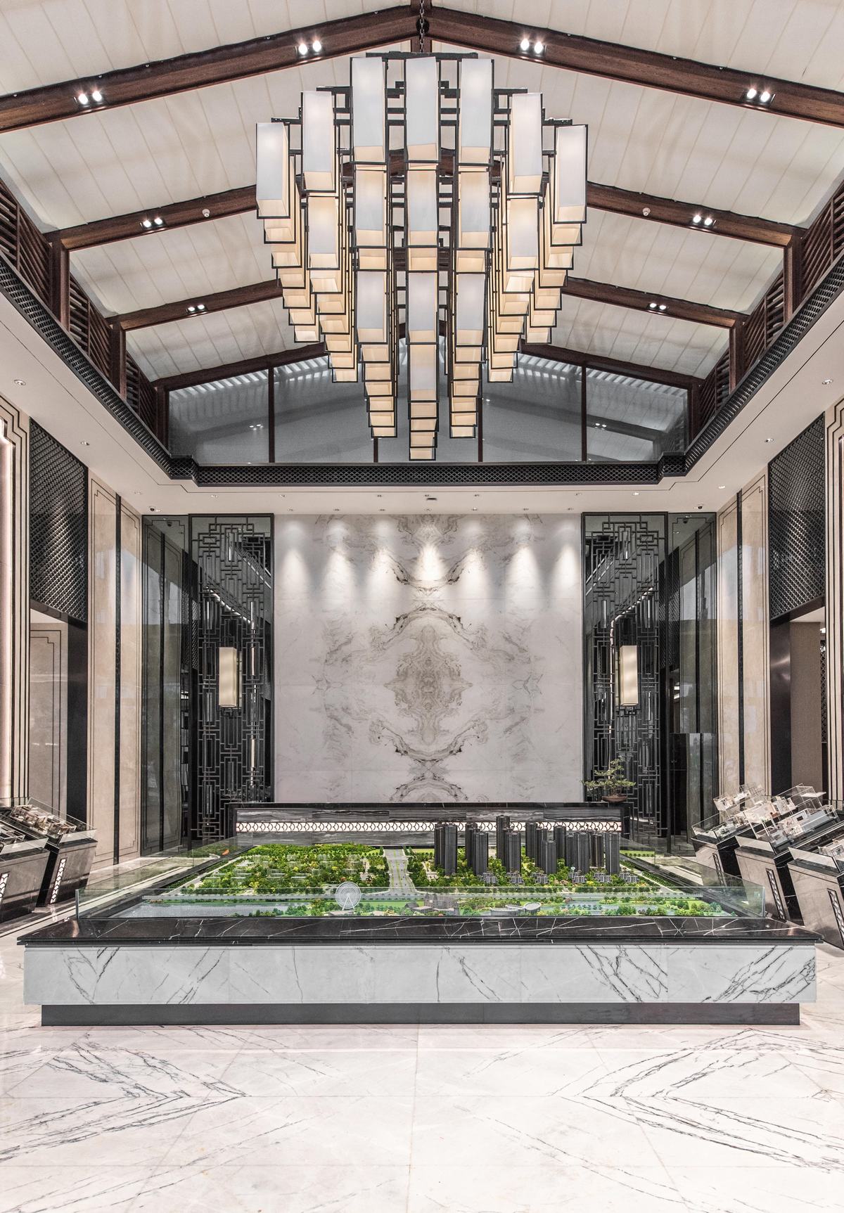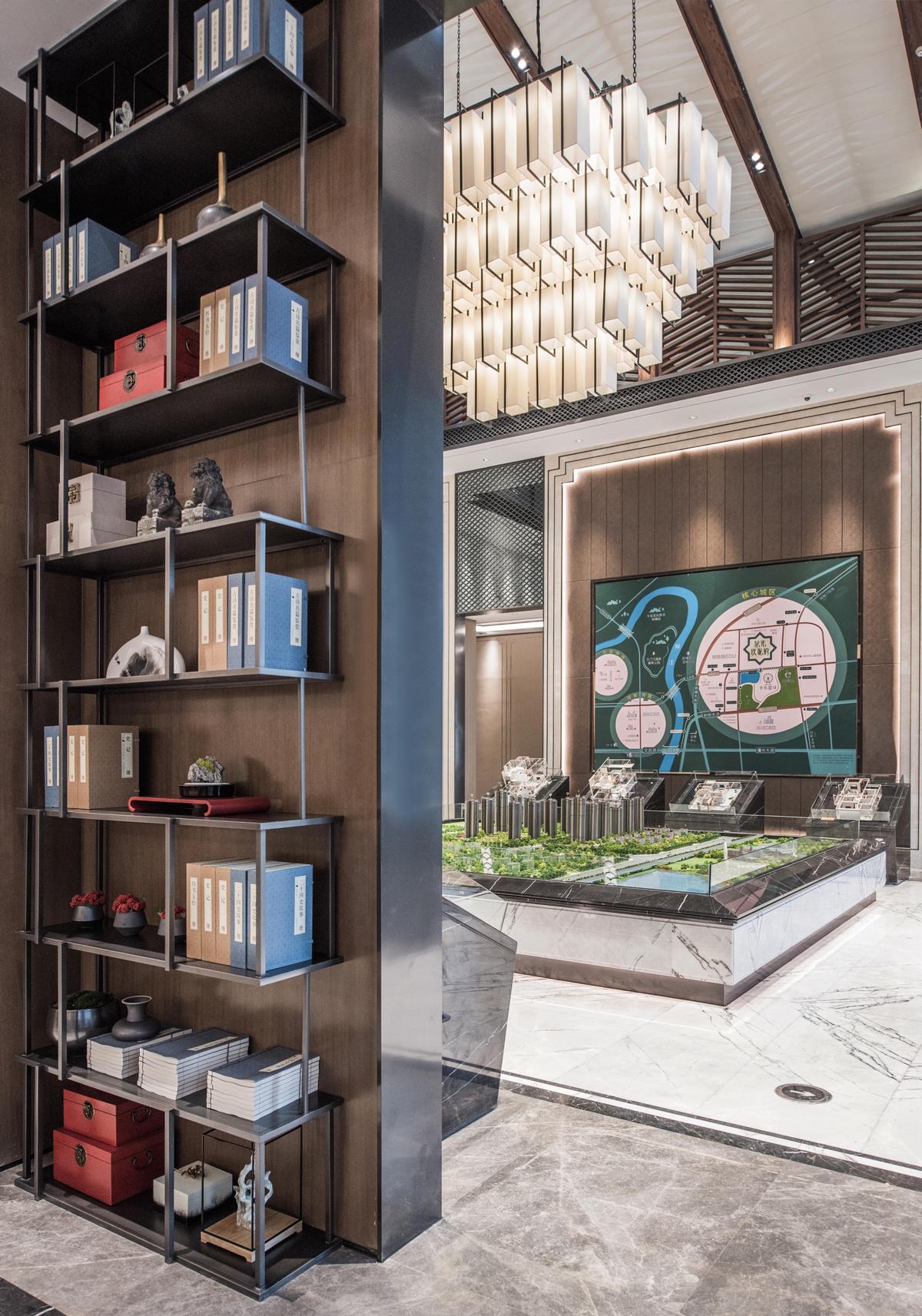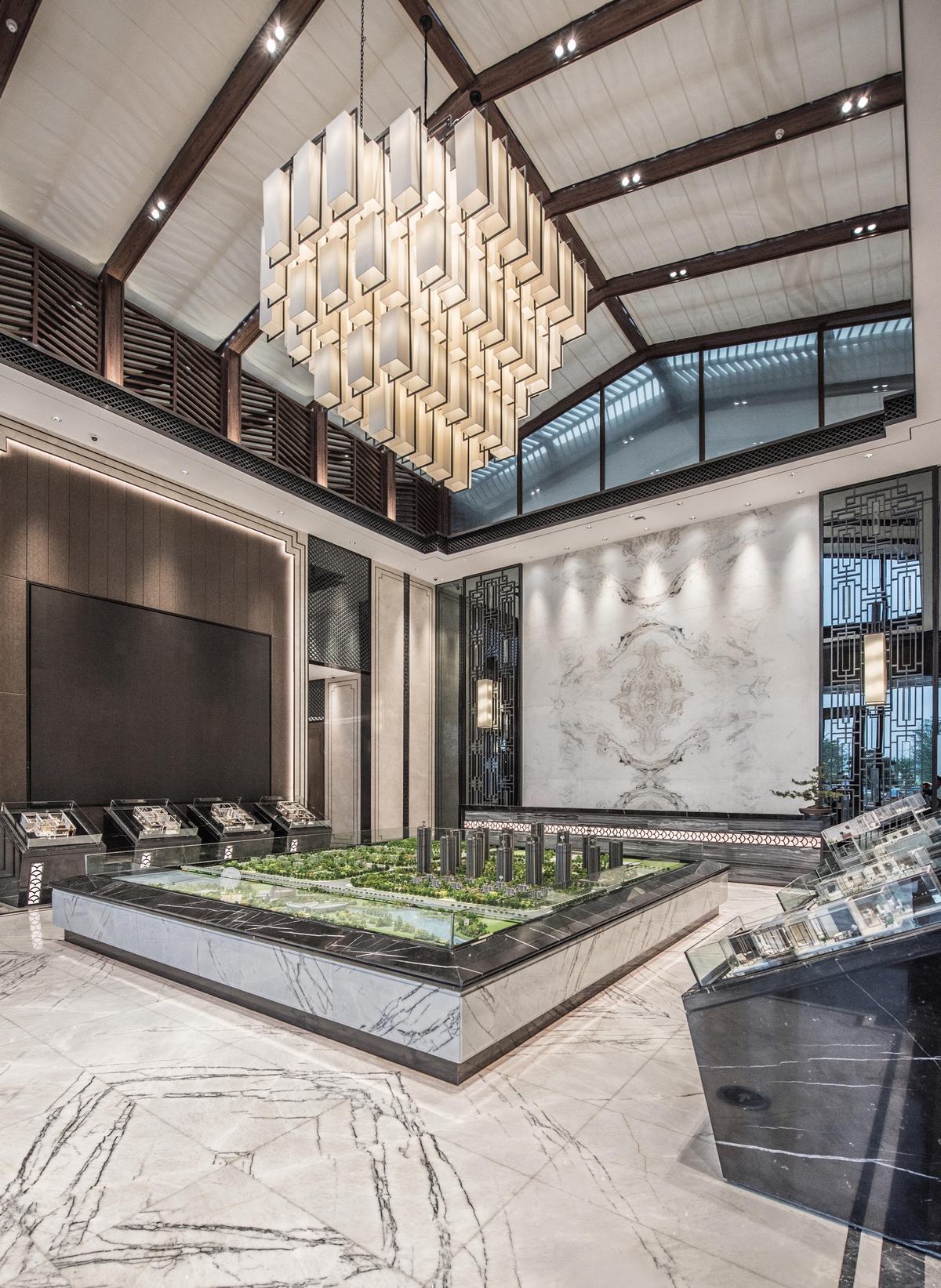 大气恢弘近十一米空高的大堂加上接待背景墙巨幅大理石对称拼花,接待大厅作为售楼处的第一空间,线条简洁大气,沙盘上方的暖色灯光与磨砂黑金属的材质表面交映,层层递进,沉浸了整个空间的氛围。