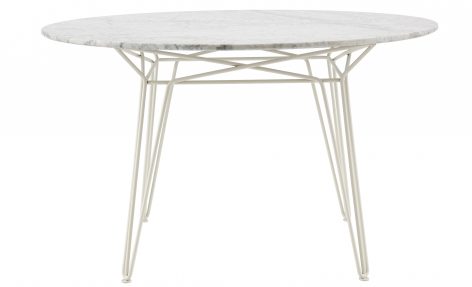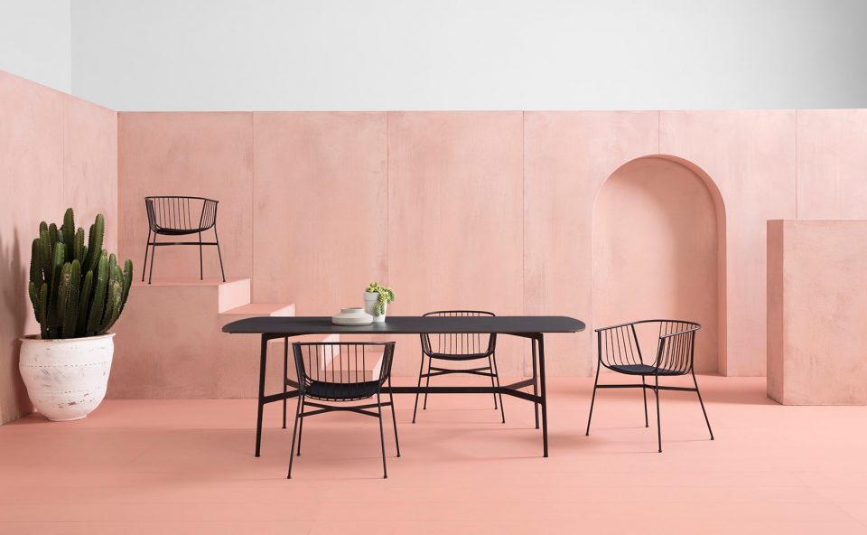 如发夹般的桌腿和纤细的腰身,让这一系列桌子变得与众不同。四条桌腿通过彩色不锈钢支架彼此缠连,维持了其一贯的优雅姿态。一张帕里西桌搭配两张琪椅,便可以营造出当代氛围。